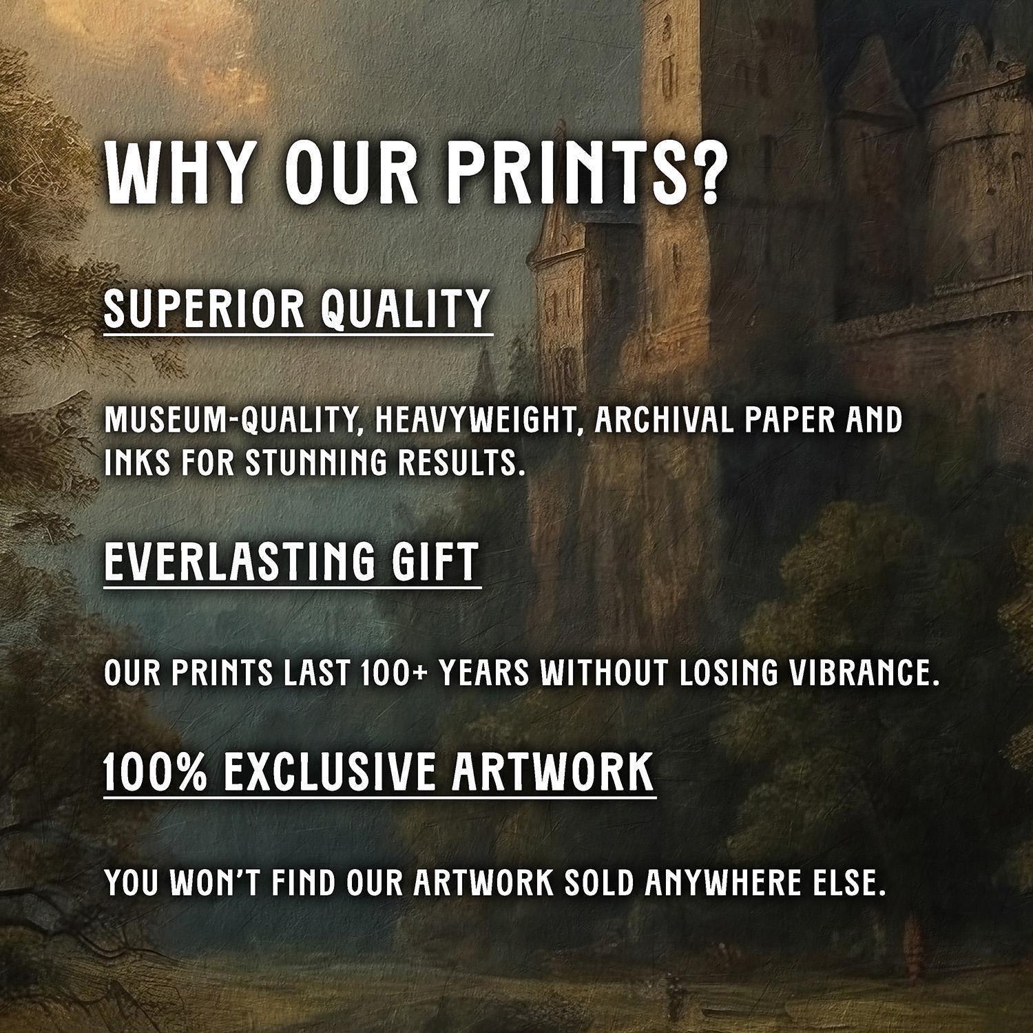 Our art prints are produced on museum-quality paper using archival inks to guarantee they last a lifetime without fading or losing color.