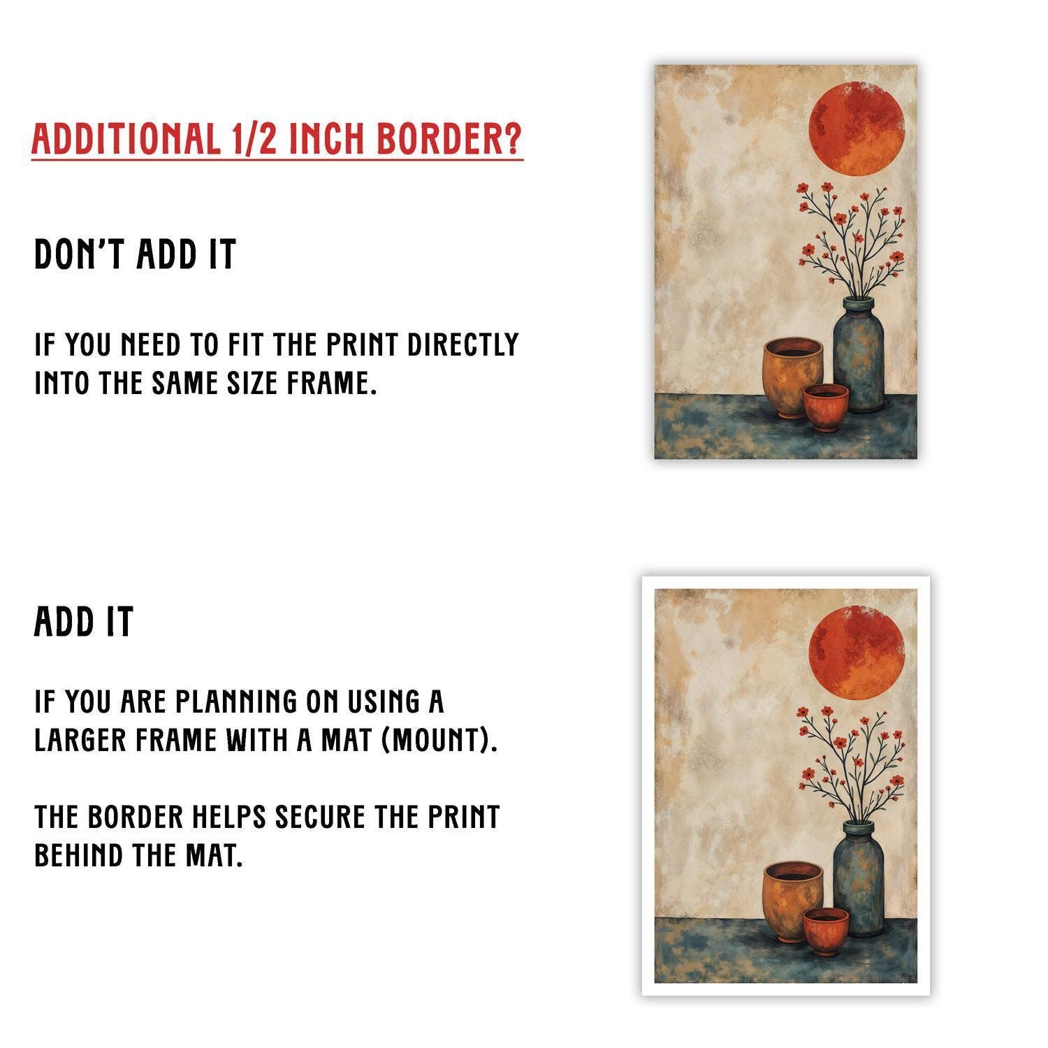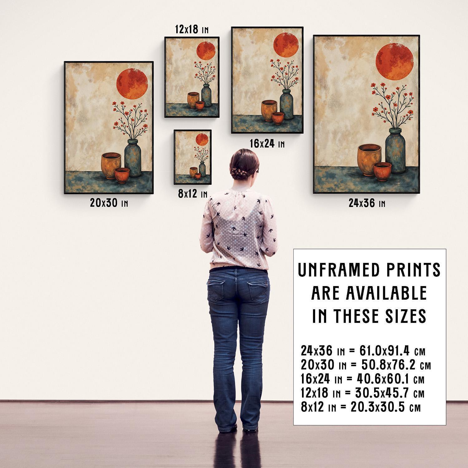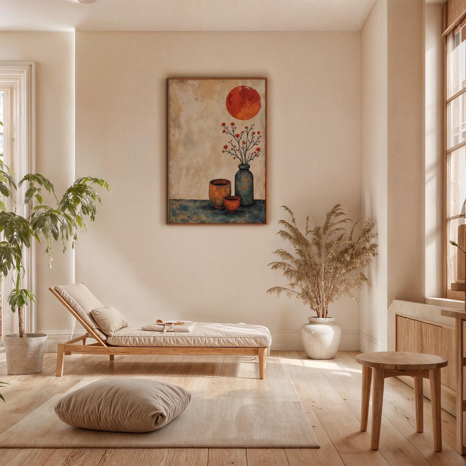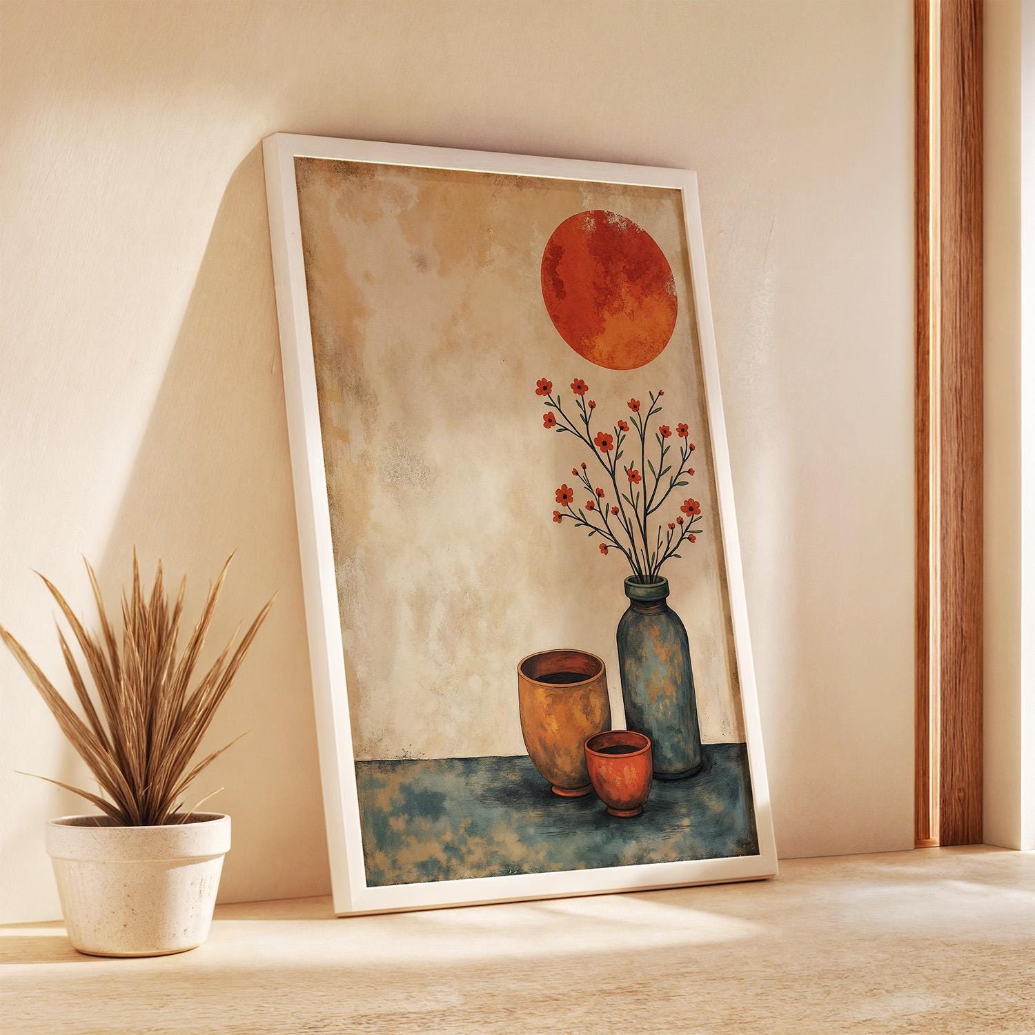 Immerse yourself in the tranquil beauty of our Giclée art print, which captures a still life with a blooming tree branch in a vase in the elegant wabi-sabi style. This exquisite piece harmonizes the fleeting grace of life with the profound simplicity and imperfect beauty of Japanese aesthetics, making it a timeless addition to any space.