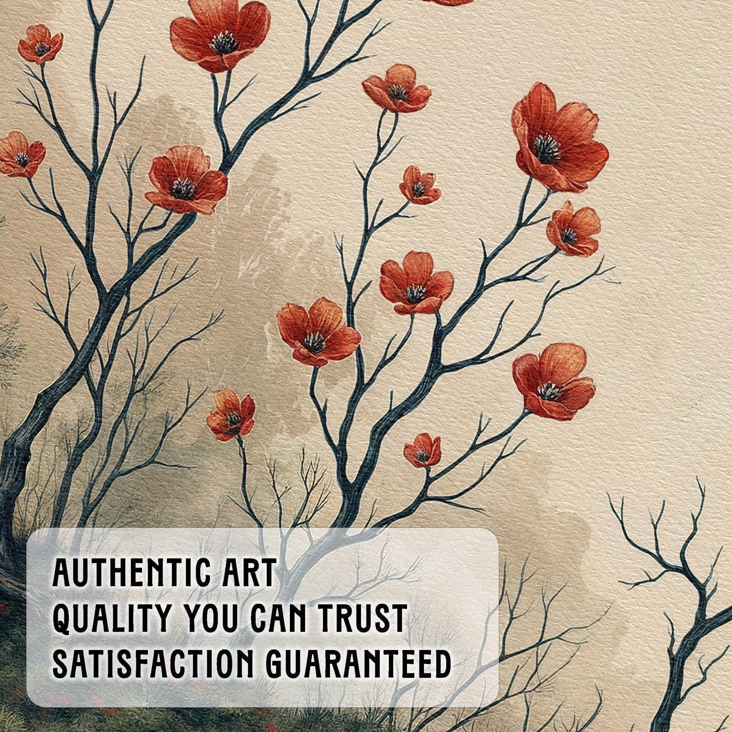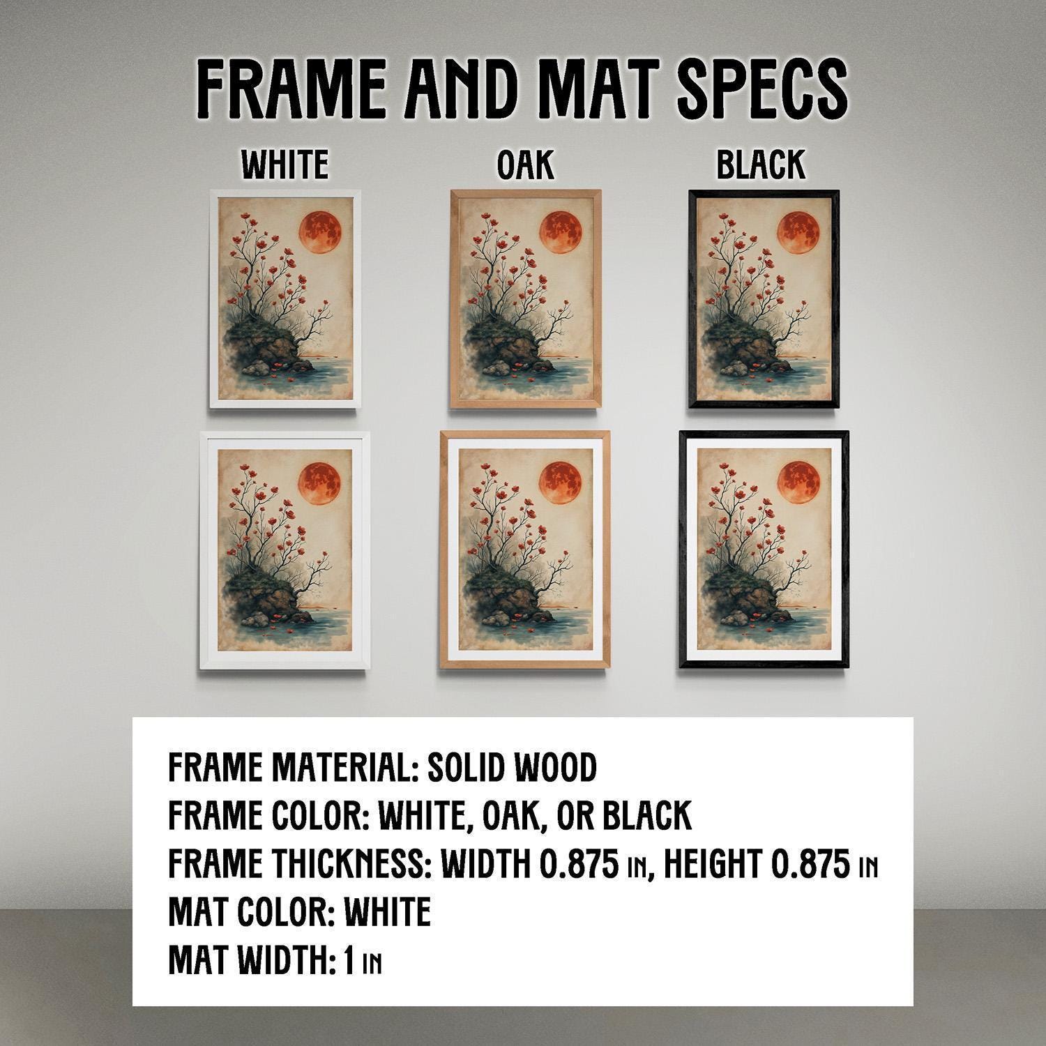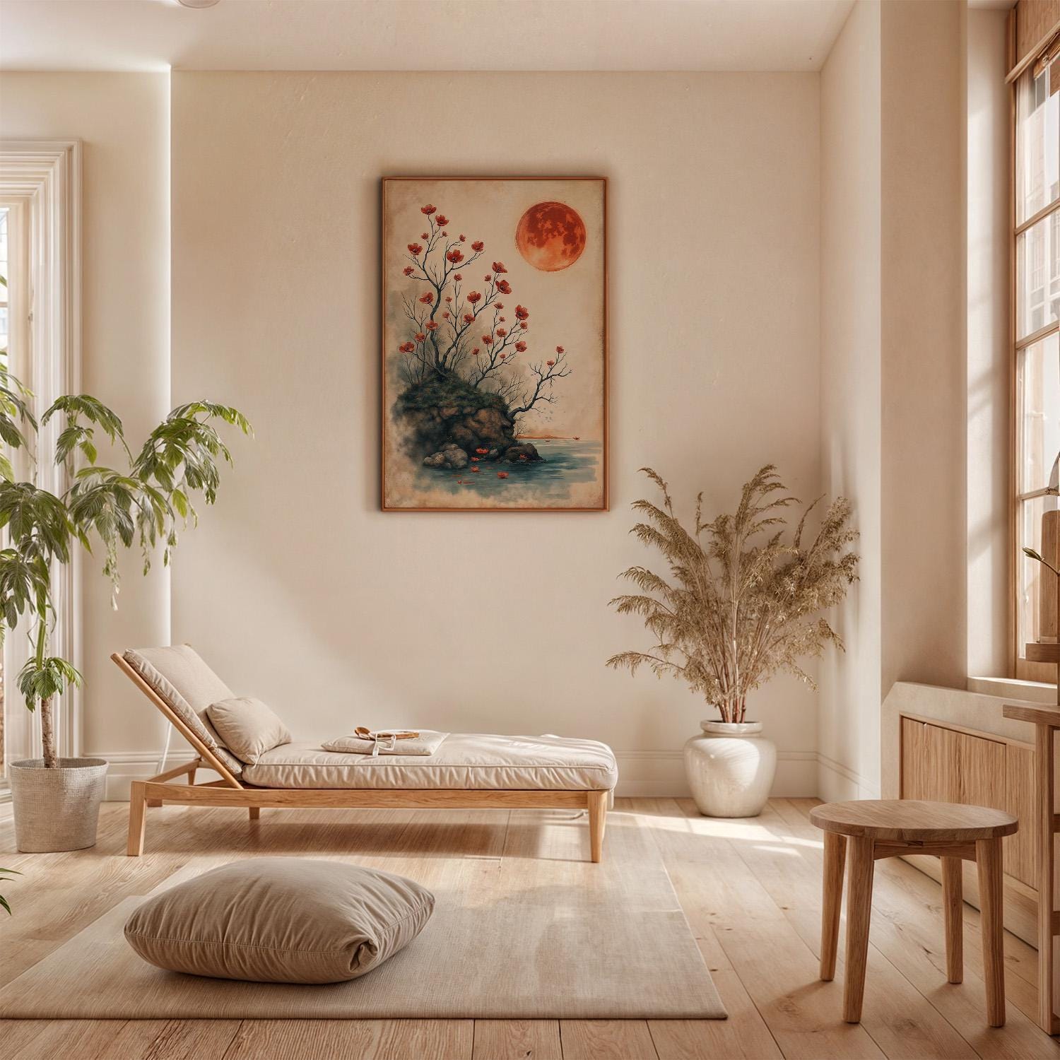 Immerse yourself in the tranquil beauty of our Giclée art print, capturing a landscape under the red full moon in the elegant wabi-sabi style. This exquisite piece harmonizes the fleeting grace of life with the profound simplicity and imperfect beauty of Japanese aesthetics, making it a timeless addition to any space.
