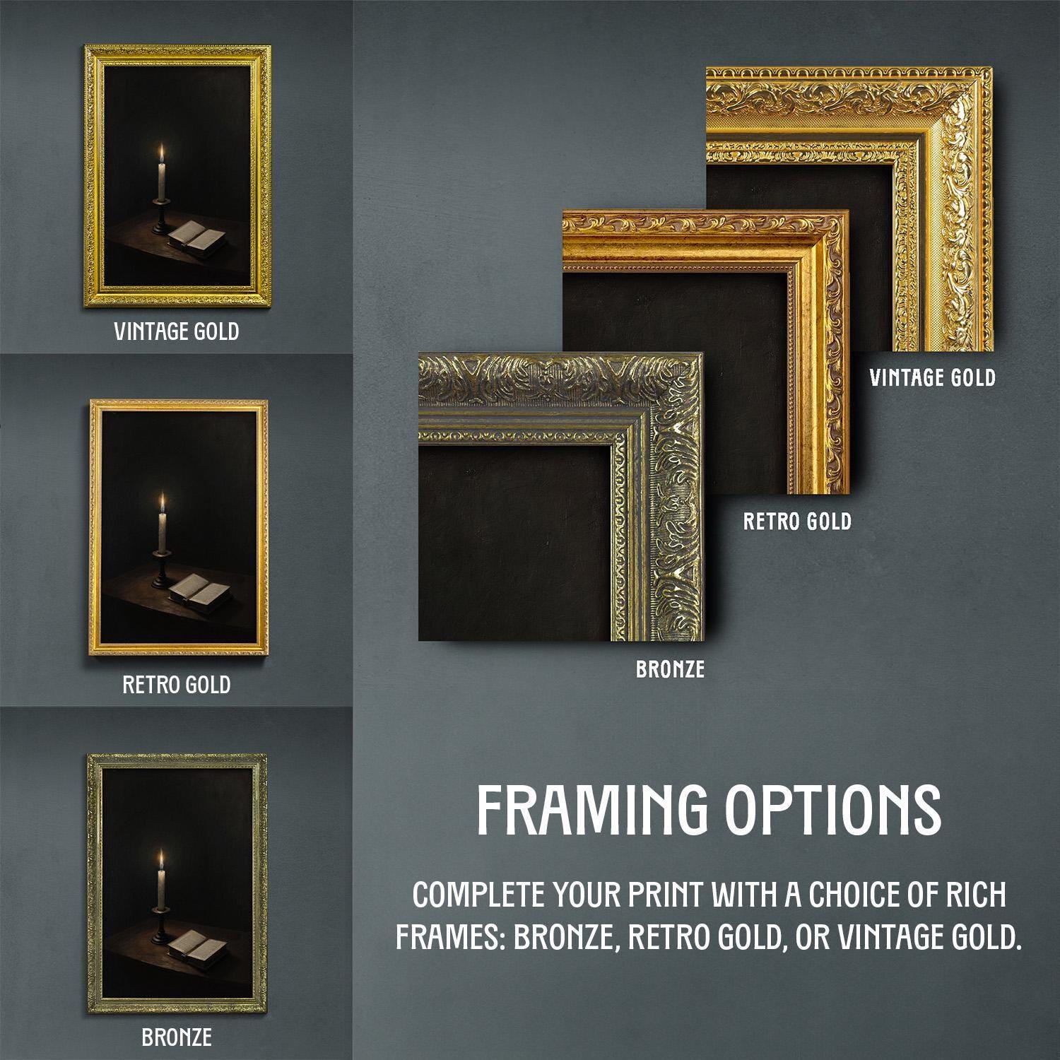 β’ Choice of bronze, retro gold, and vintage gold frame.