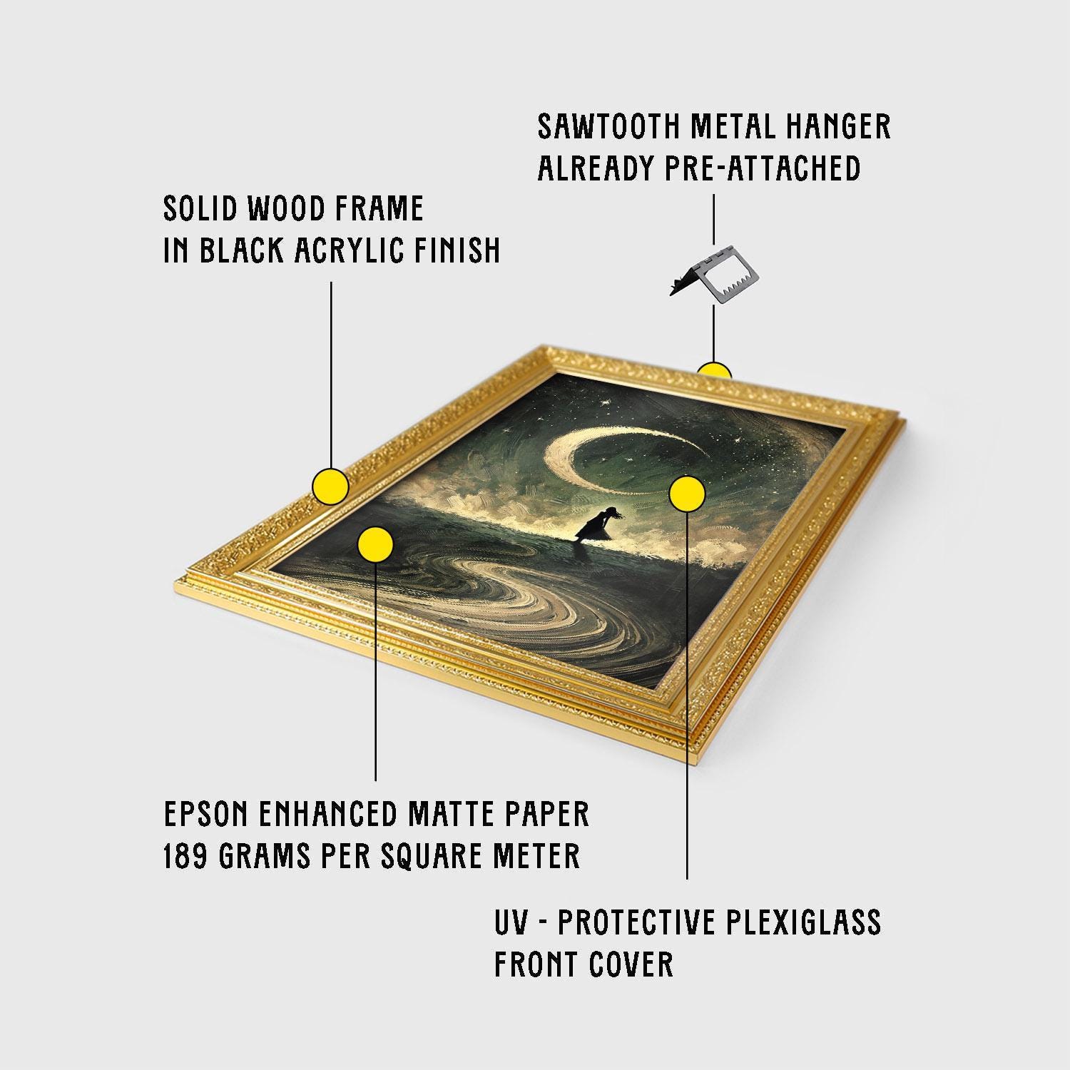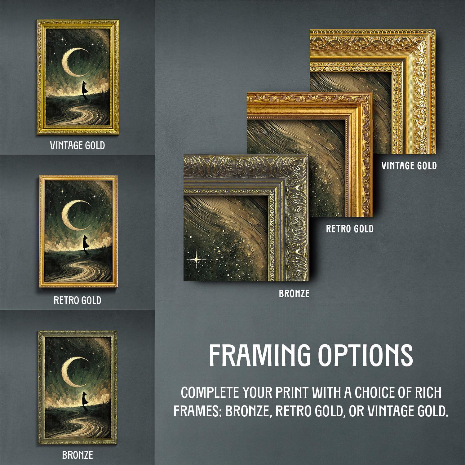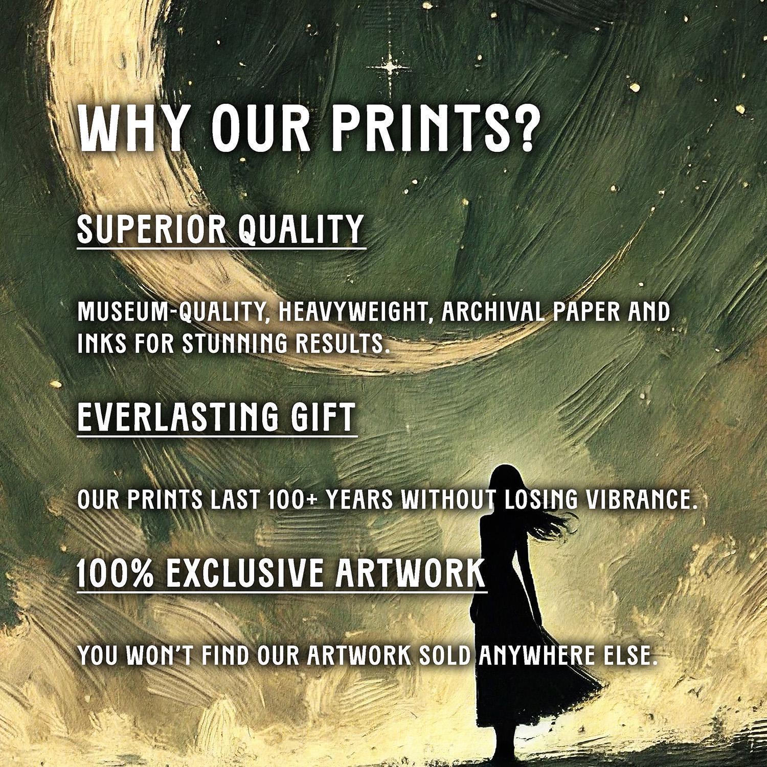 This enchanting print captures a serene woman beneath a crescent moon, evoking an enigmatic starry night atmosphere perfect for lovers of ethereal dark decor and gothic home accents. Printed with museum-quality inks on luxurious archival paper, it promises vibrant colors and lasting beauty that will elevate any room.