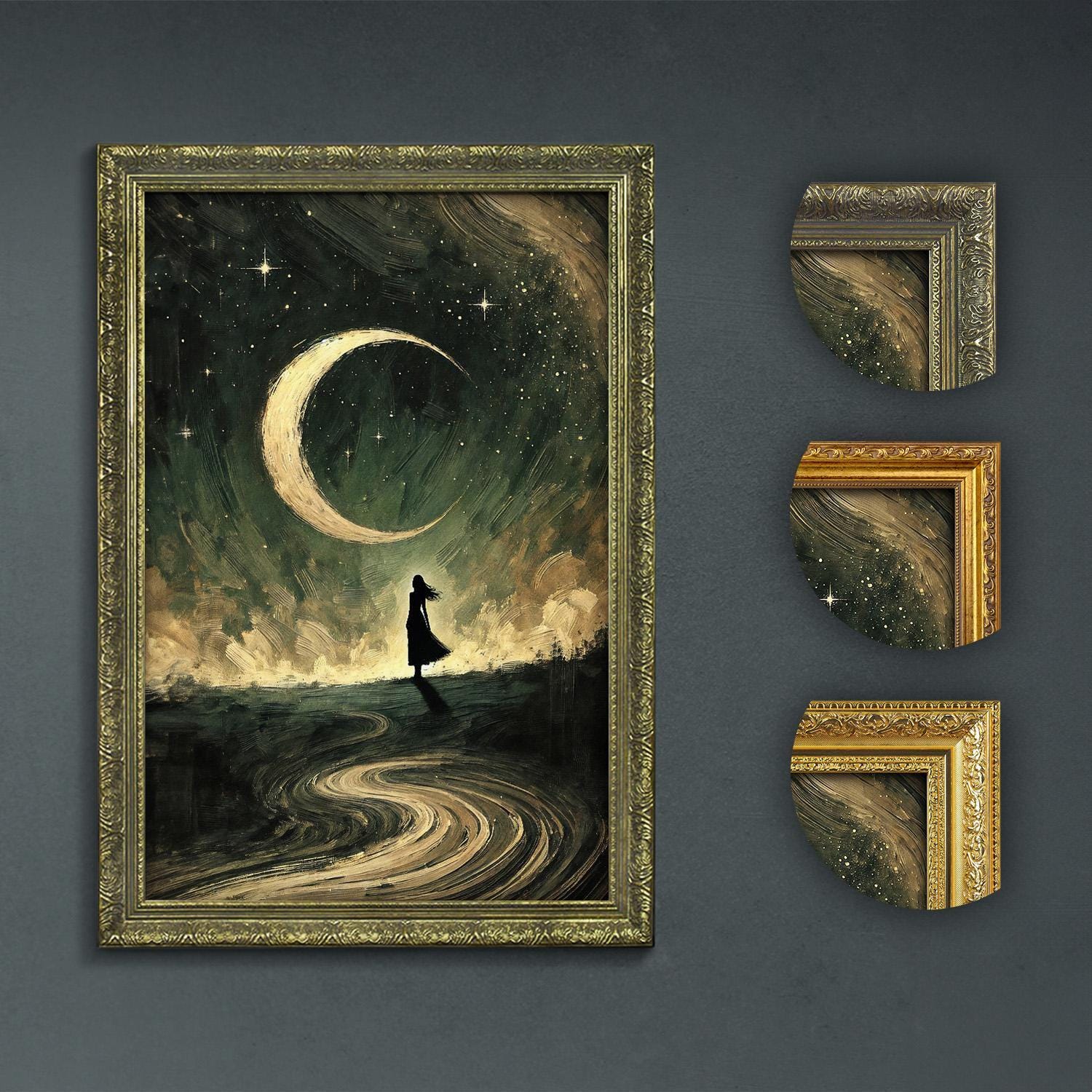 Discover the mystical moon and woman art print, a celestial dark academia gem that brings moody gothic charm and serene moonlit silhouette decor to your space.