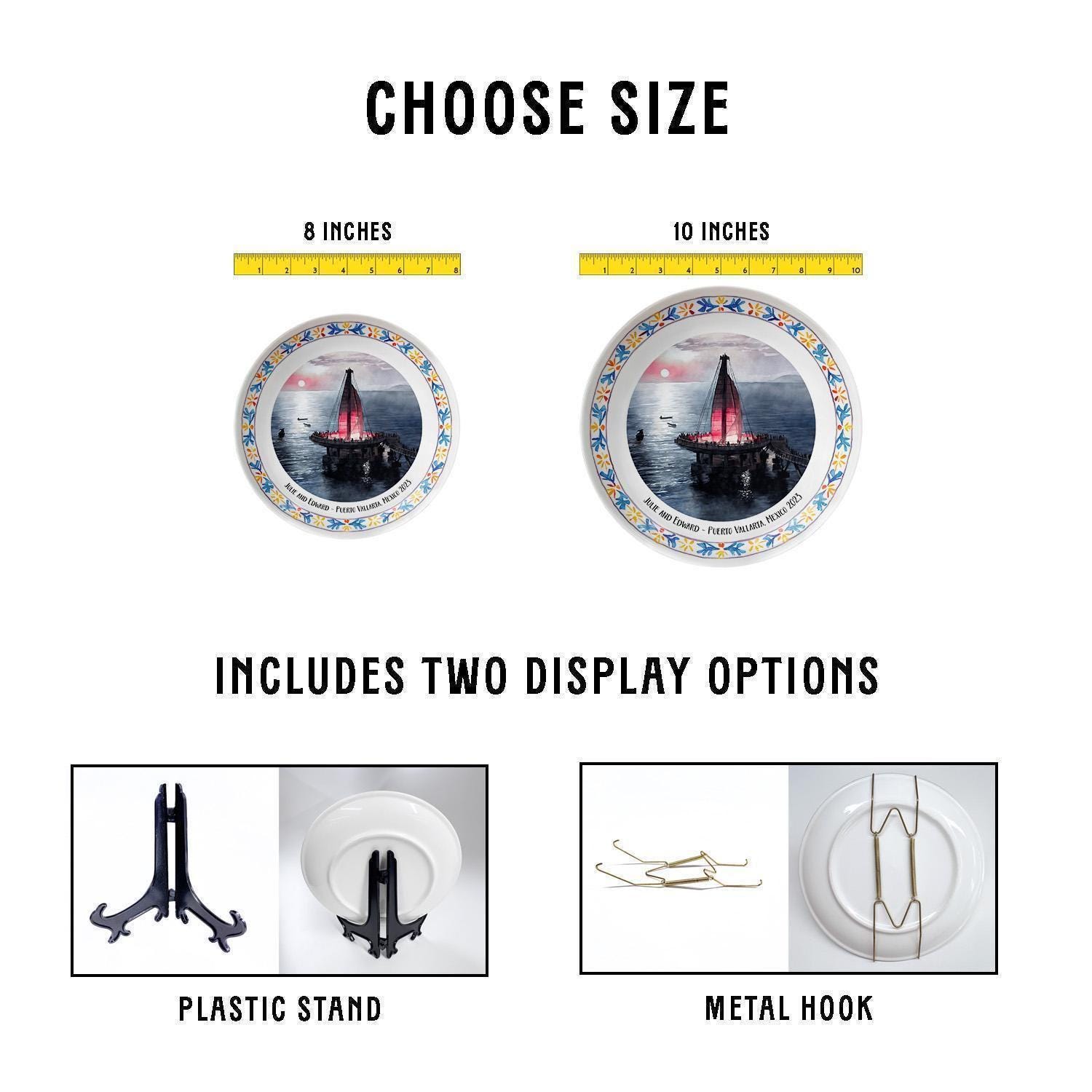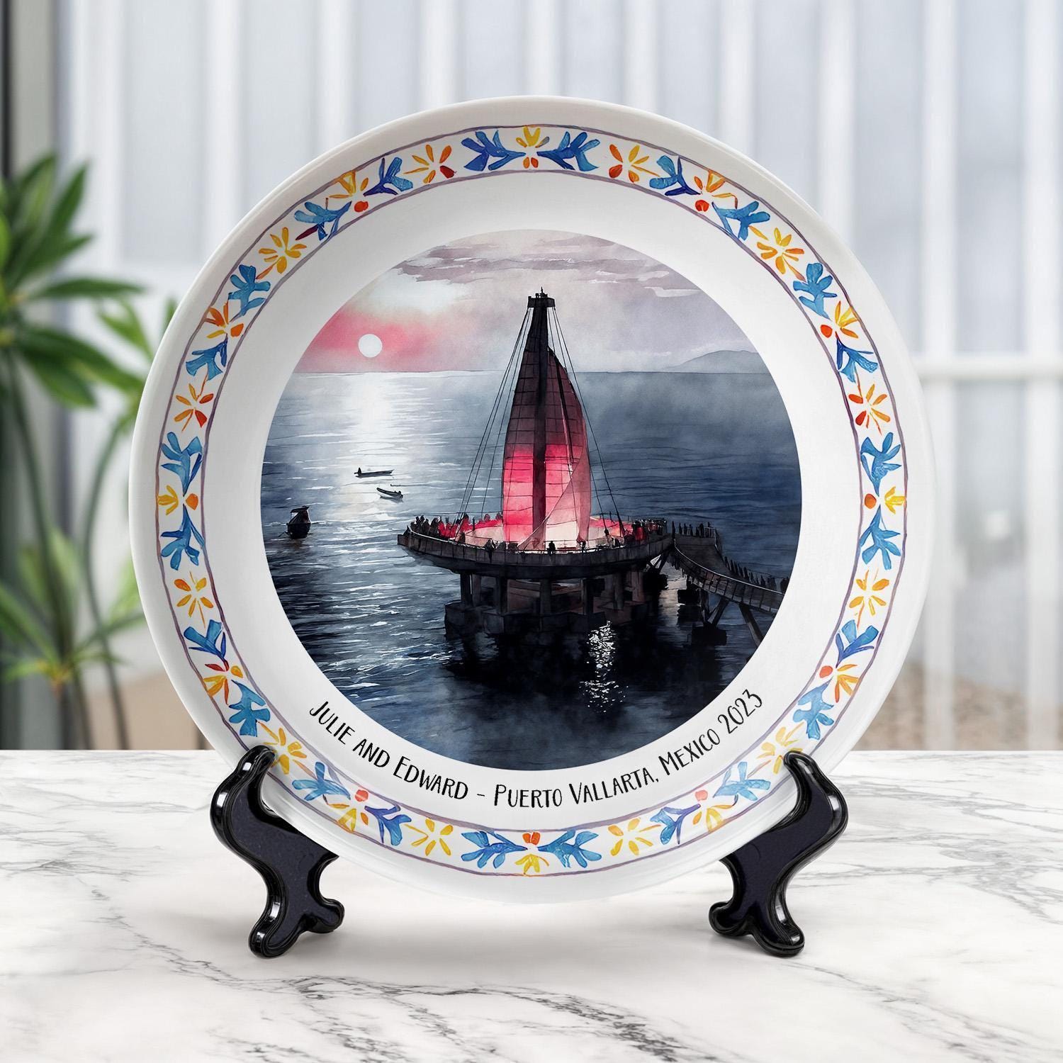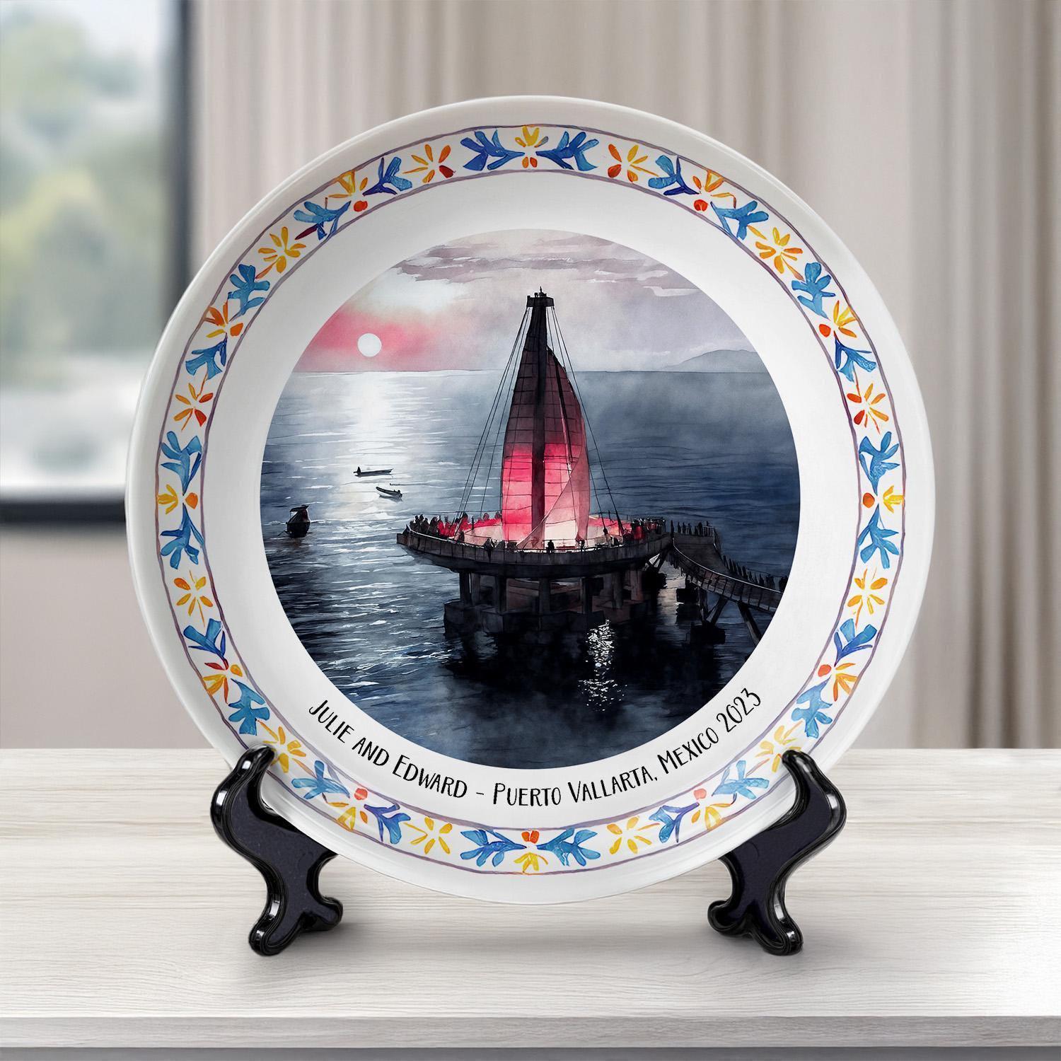 Adorn your space with this custom ceramic plate capturing a serene sunset over Puerto Vallarta's iconic waterfront, perfect for adding a touch of coastal charm to any room or gifting to someone special. Available in 8-inch and 10-inch sizes, this decorative plate is a beautiful addition to your living room, dining area, or office.