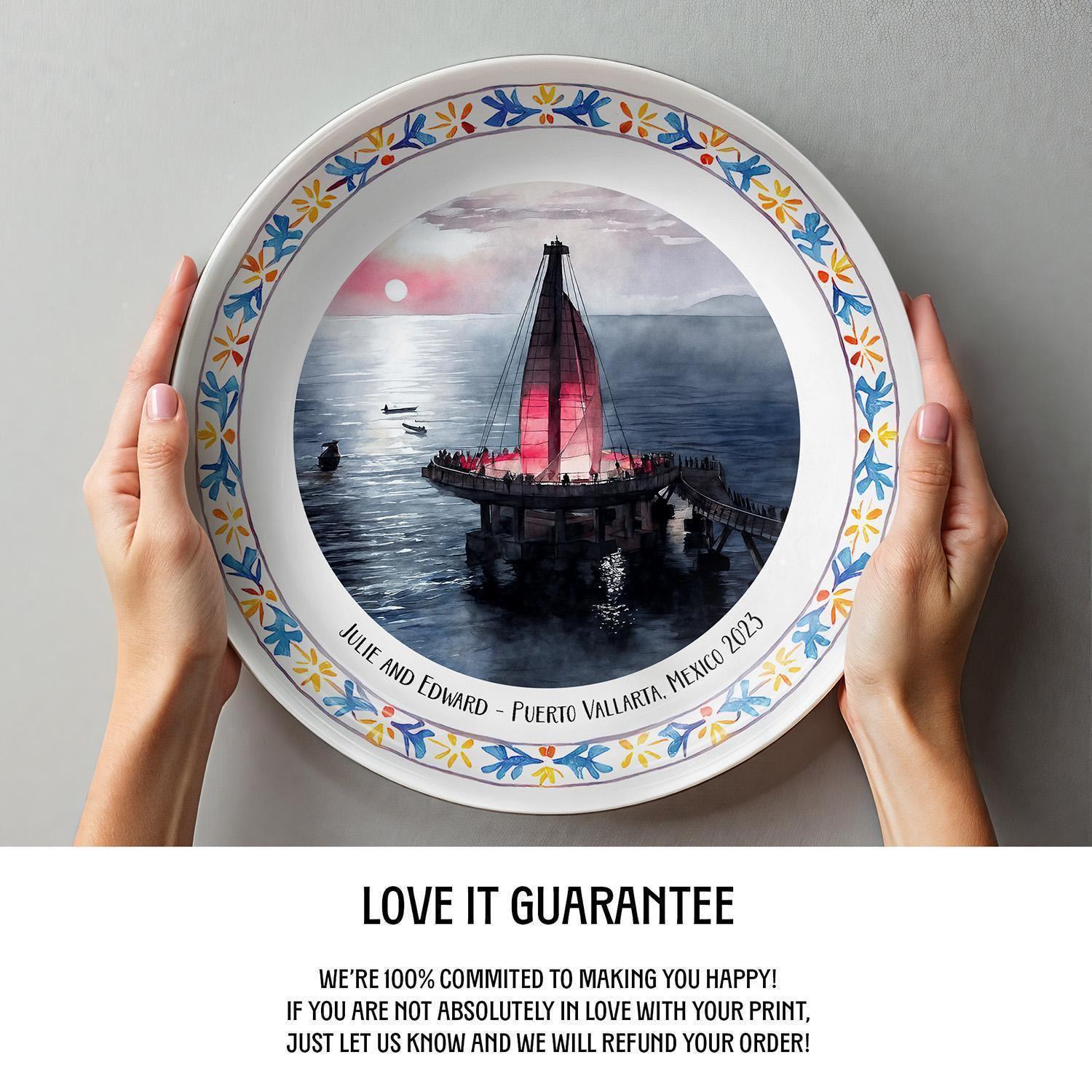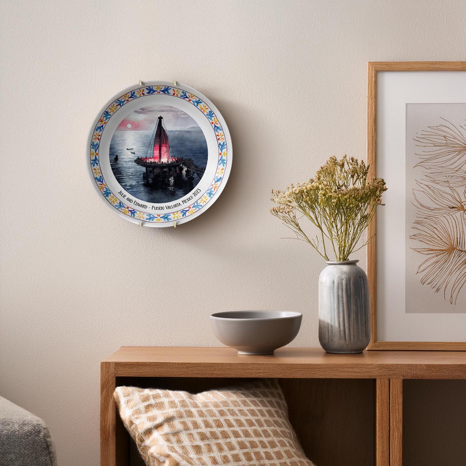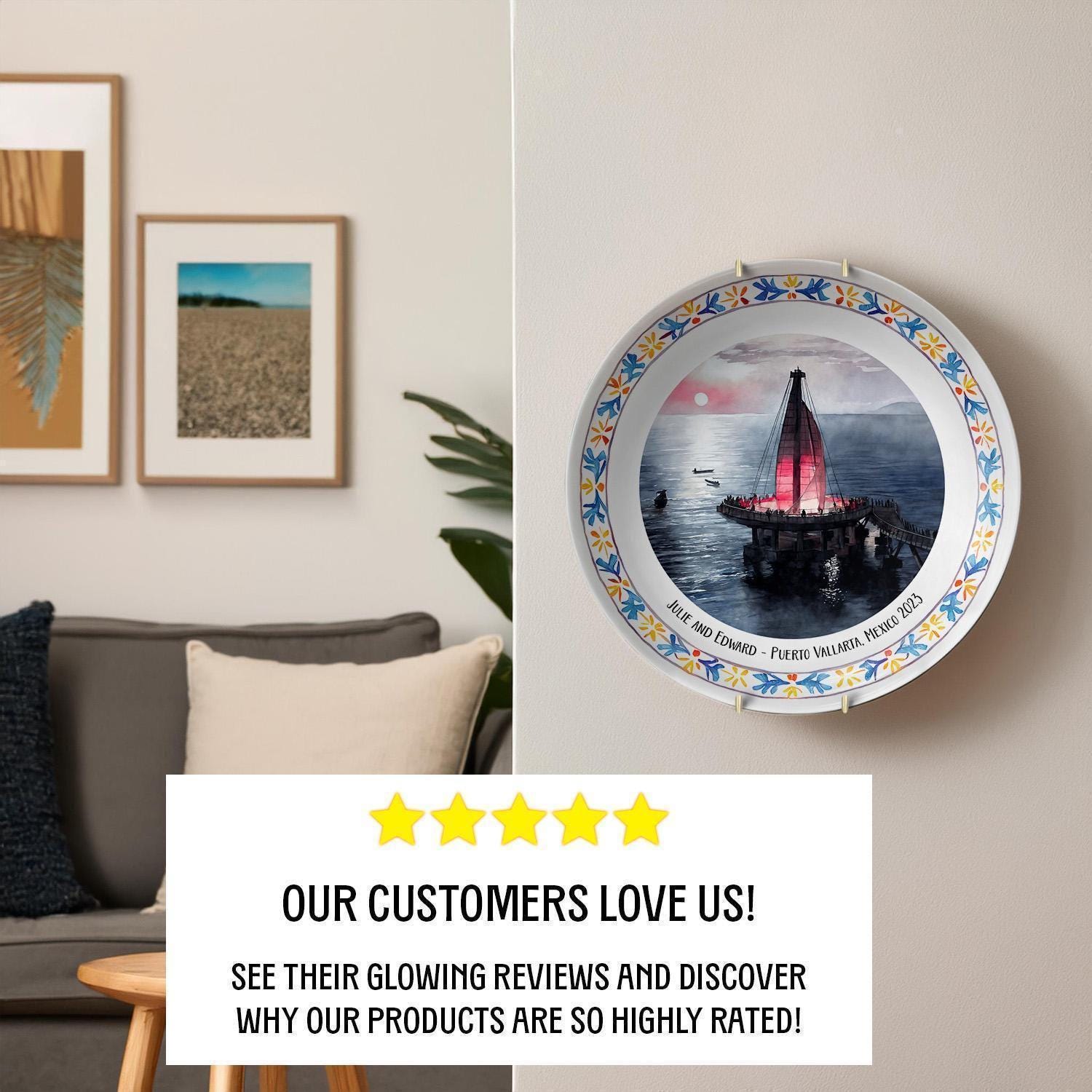 Adorn your space with this custom ceramic plate capturing a serene sunset over Puerto Vallarta's iconic waterfront, perfect for adding a touch of coastal charm to any room or gifting to someone special. Available in 8-inch and 10-inch sizes, this decorative plate is a beautiful addition to your living room, dining area, or office.