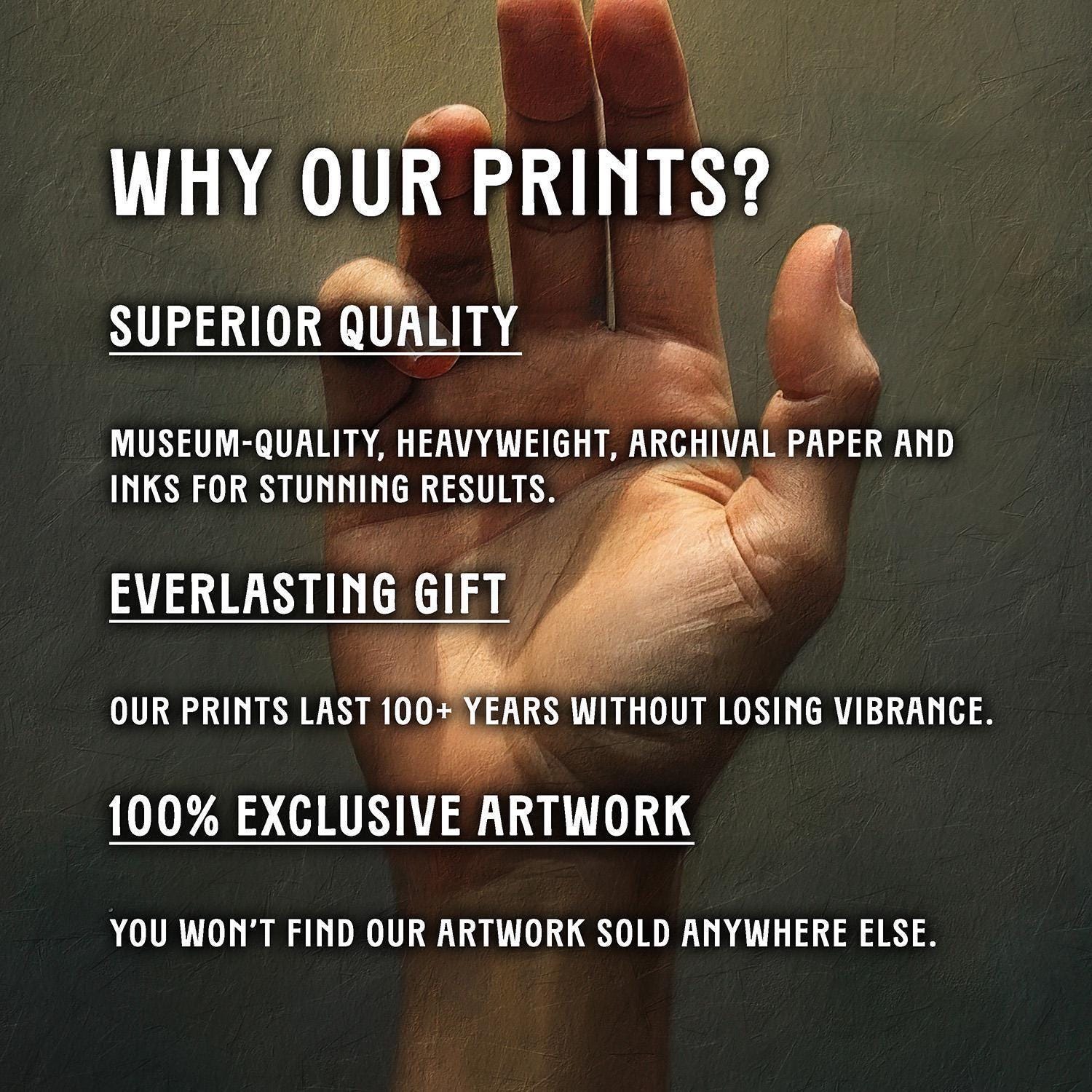 Our art prints are produced on museum-quality paper using archival inks to guarantee they last a lifetime without fading or losing color.