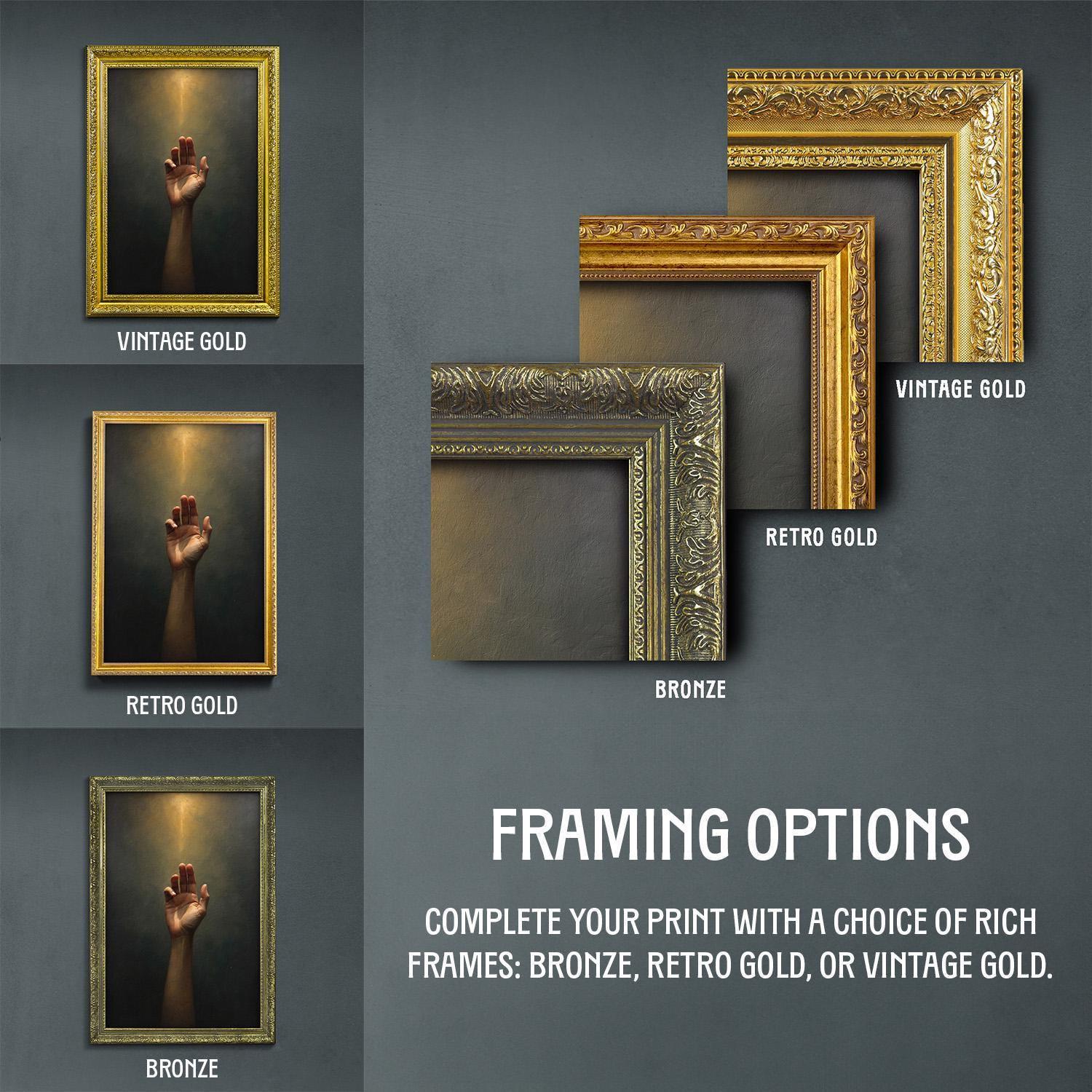 β’ Choice of bronze, retro gold, and vintage gold frame.