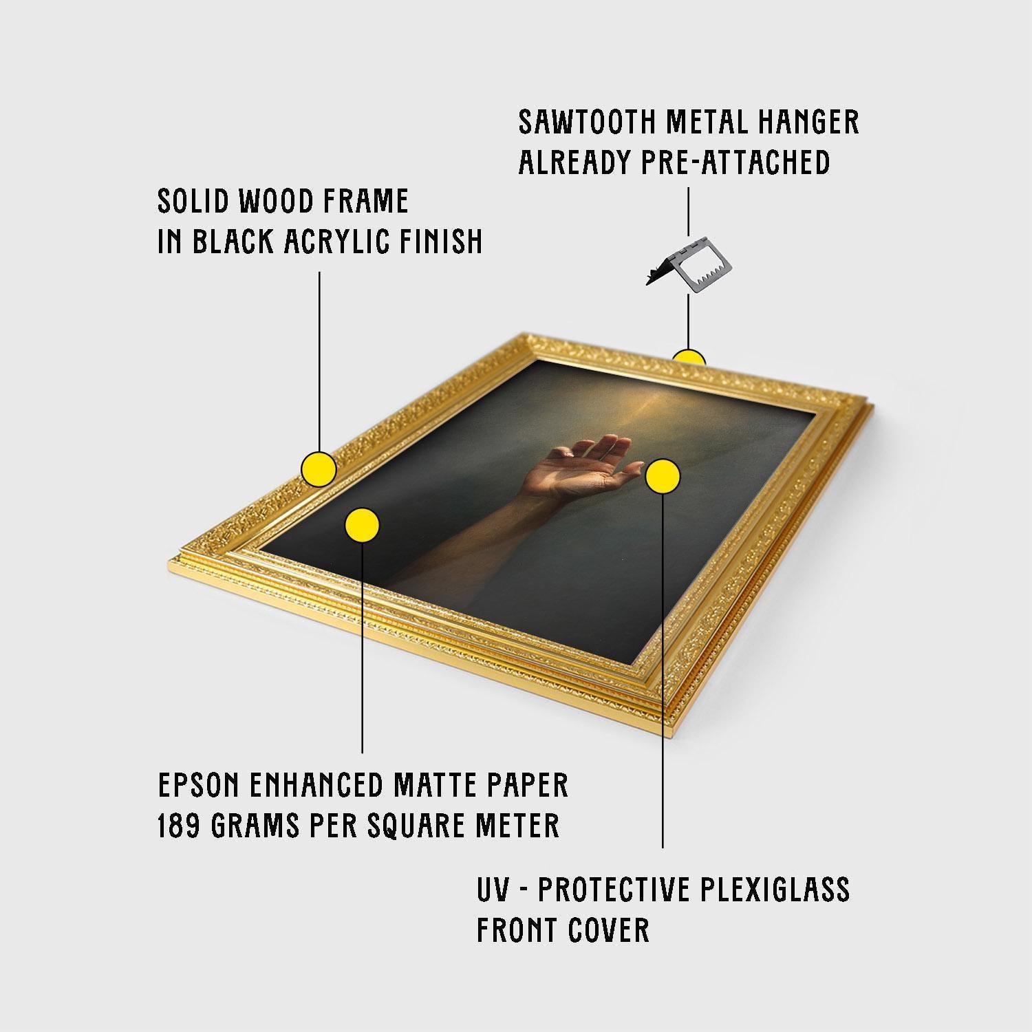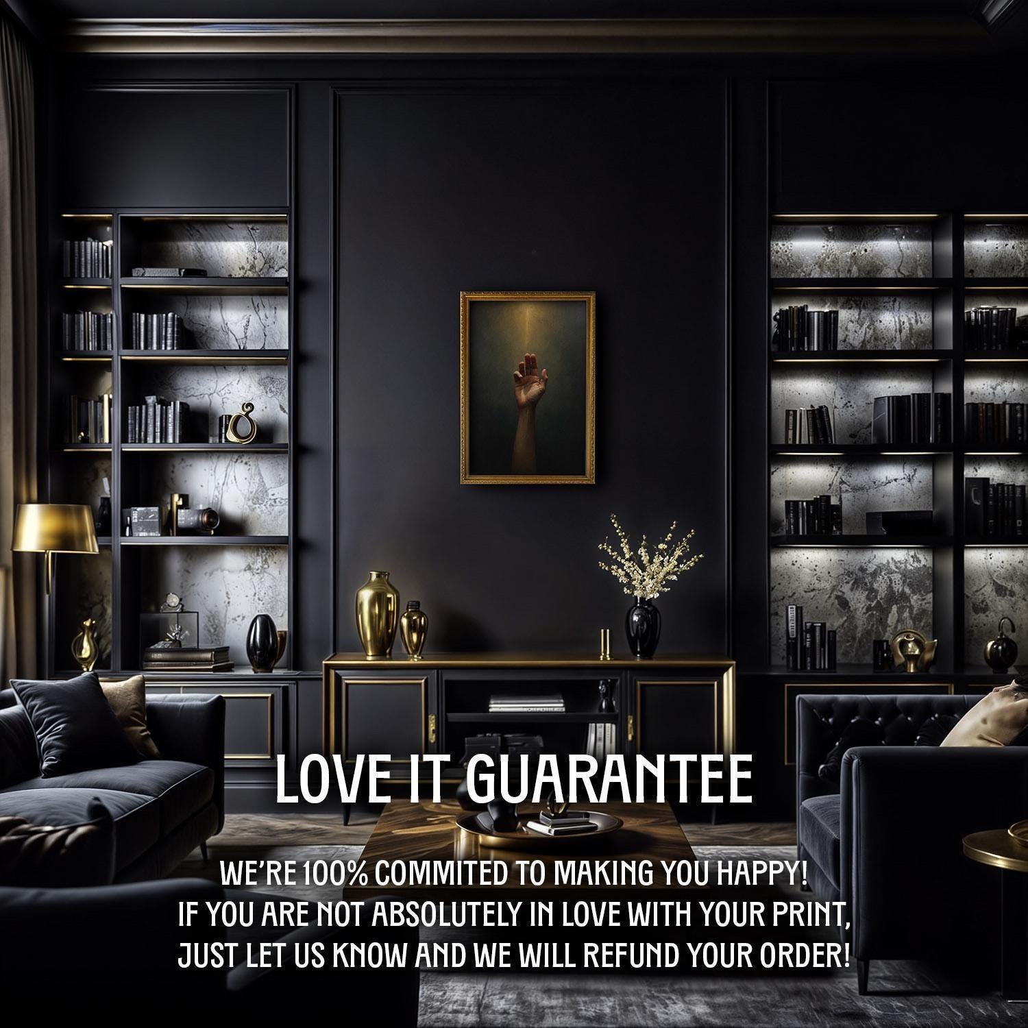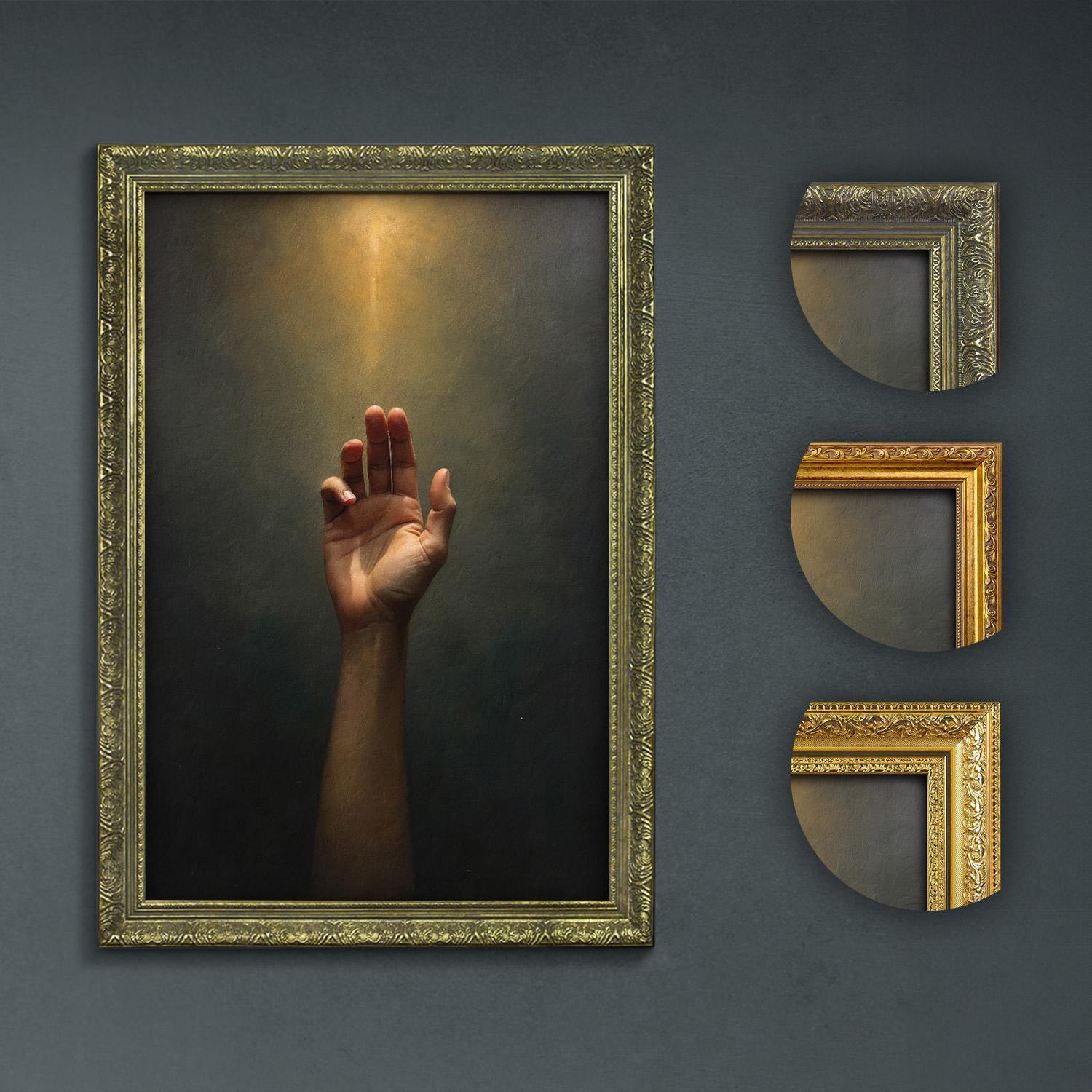 Bring a golden light glow to your study with this illuminated reaching hand art, perfect for dark academia wall art lovers seeking moody, inspirational decor.