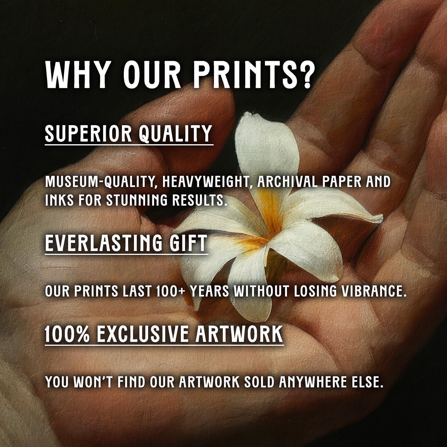 Our art prints are produced on museum-quality paper using archival inks to guarantee they last a lifetime without fading or losing color.