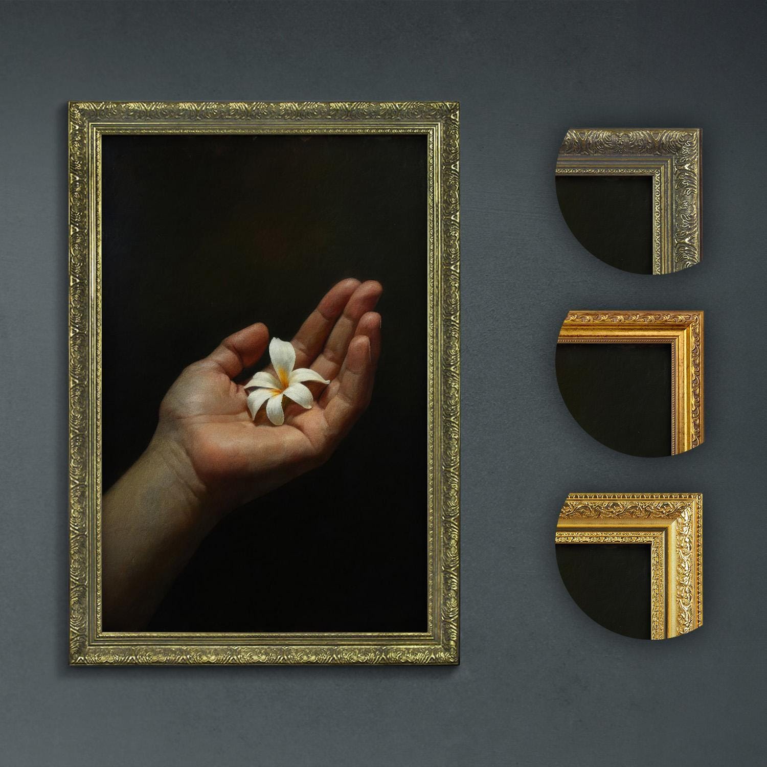 Elevate your living space with this realistic botanical painting that masterfully captures the delicate grace of a white frangipani flower gently cradled by a hand. This dark moody wall art blends minimalist decor with a gentle floral touch, making it an ideal choice for anyone seeking calm and sophisticated floral artwork.