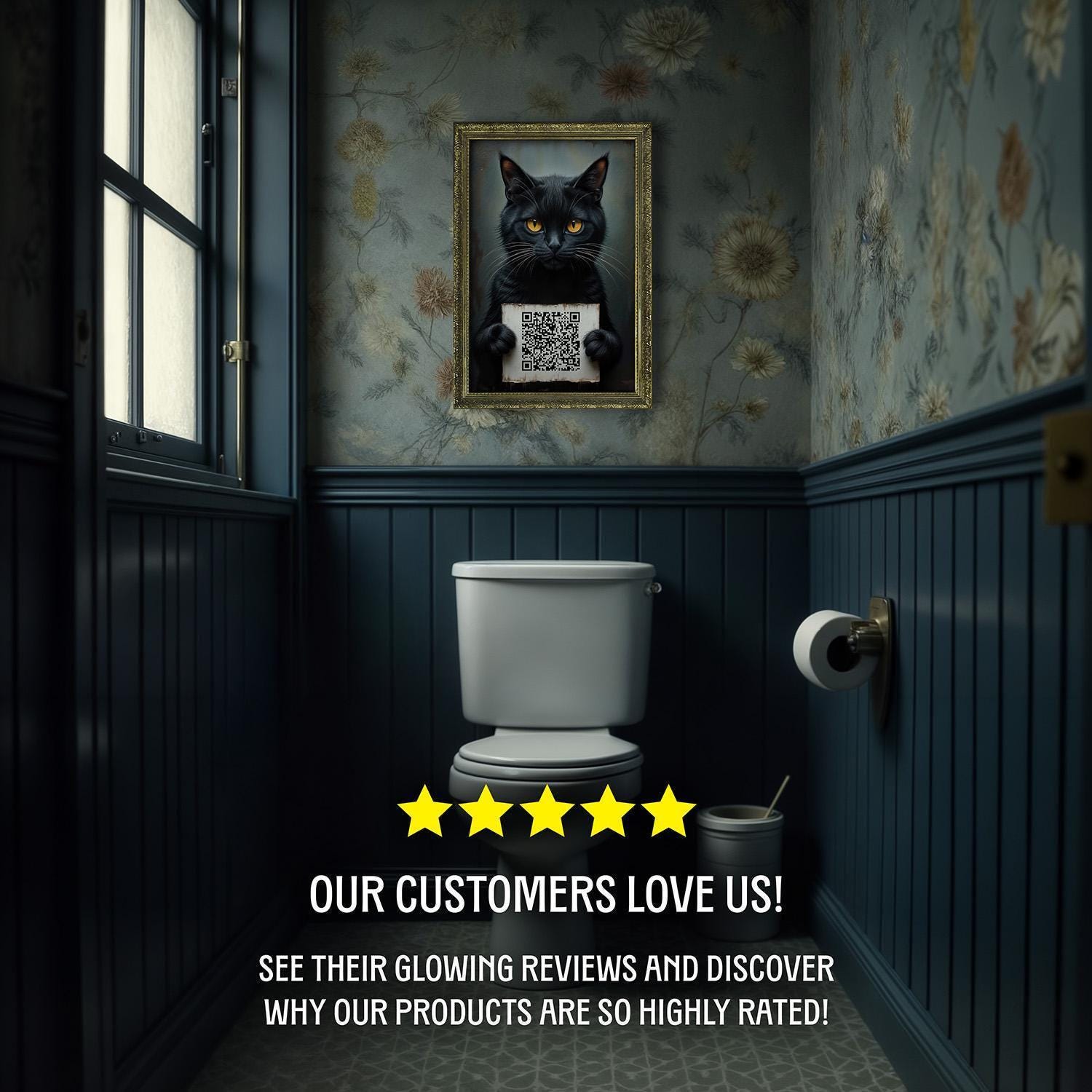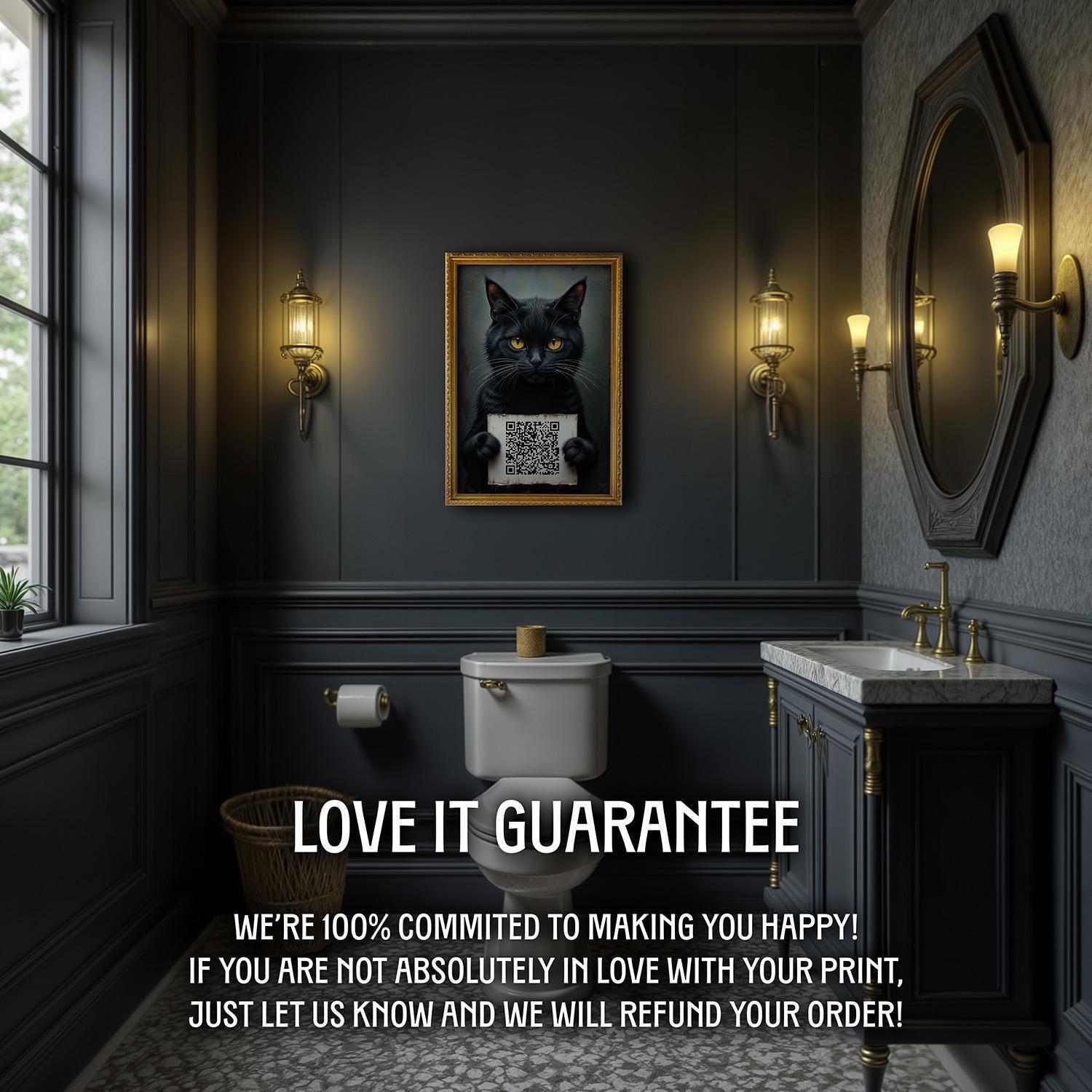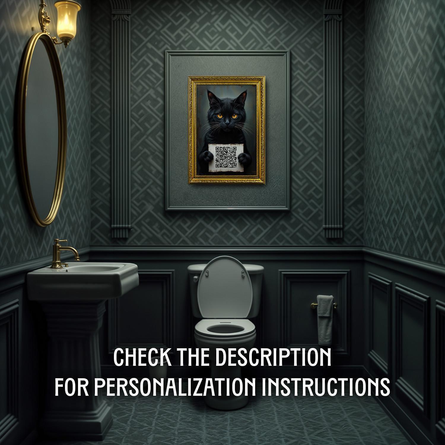 Add a playful yet sophisticated touch to your bathroom with this funny bathroom art featuring a cat with a sign and a custom QR code, perfect for dark academia decor.