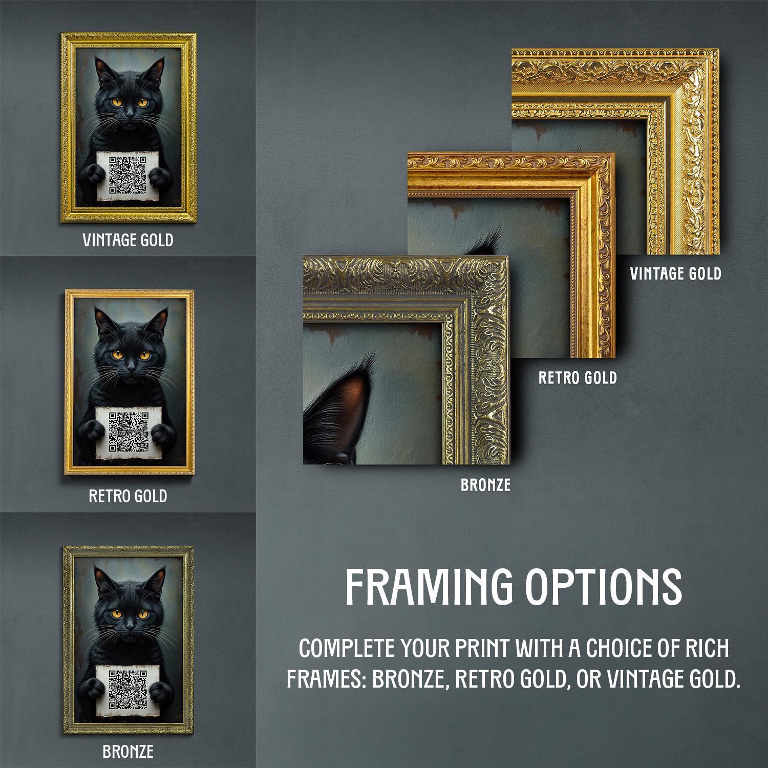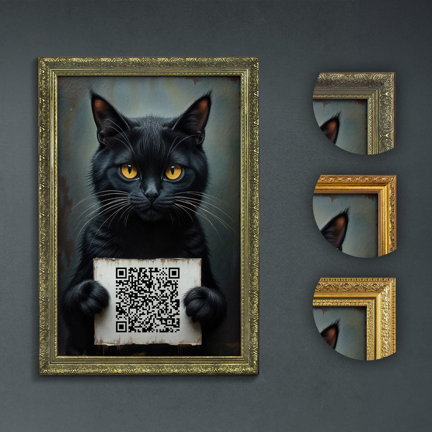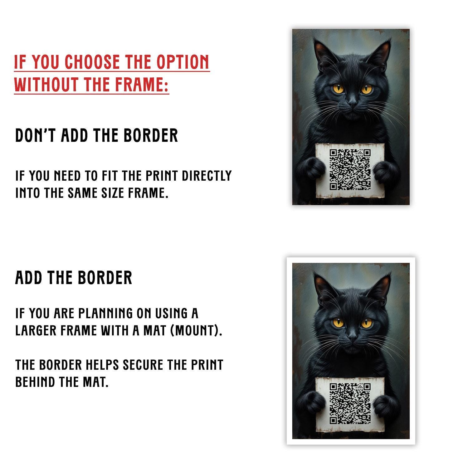 Add a playful yet sophisticated touch to your bathroom with this funny bathroom art featuring a cat with a sign and a custom QR code, perfect for dark academia decor.