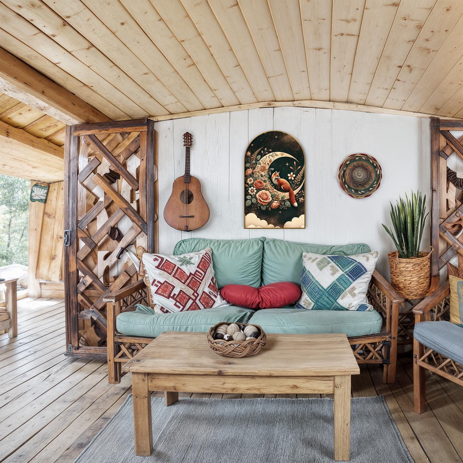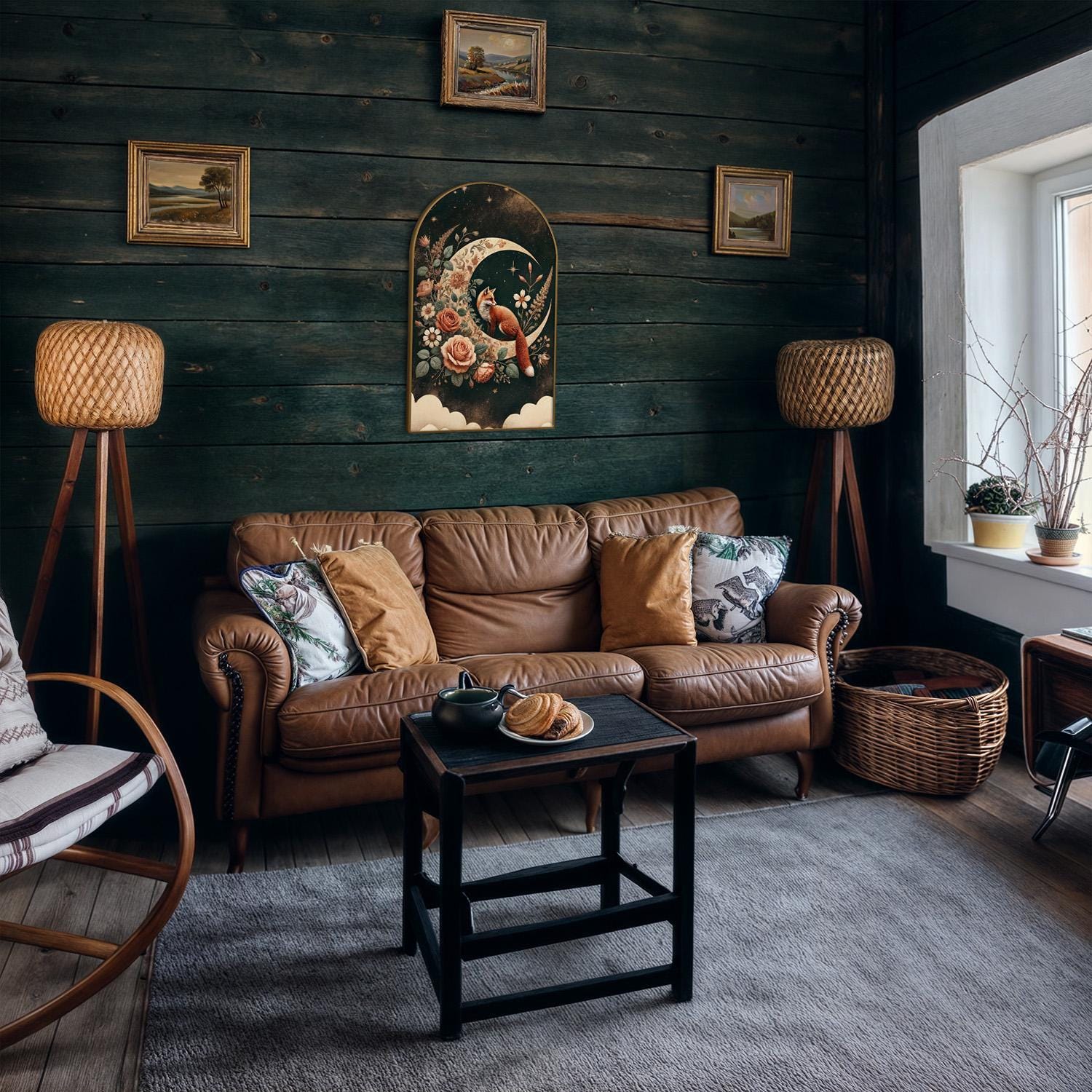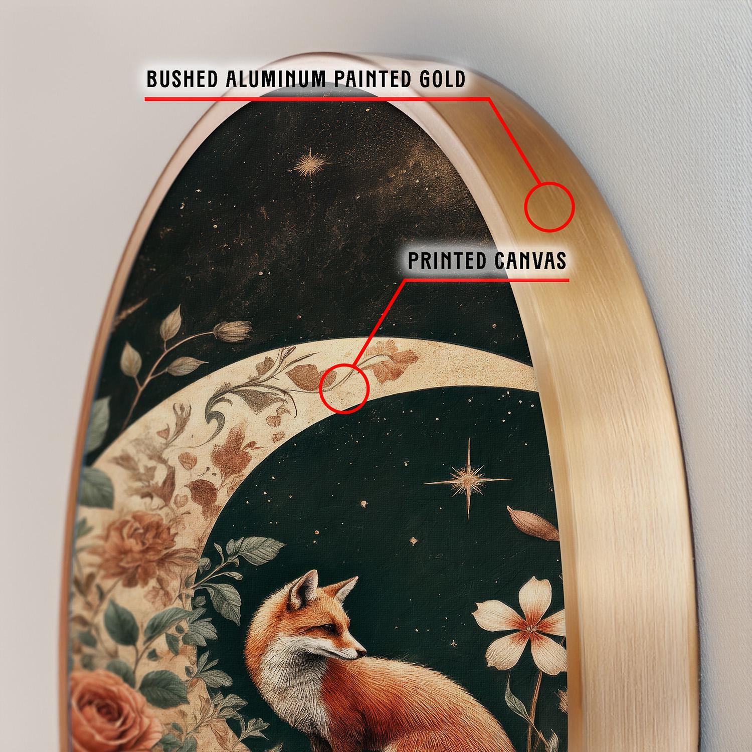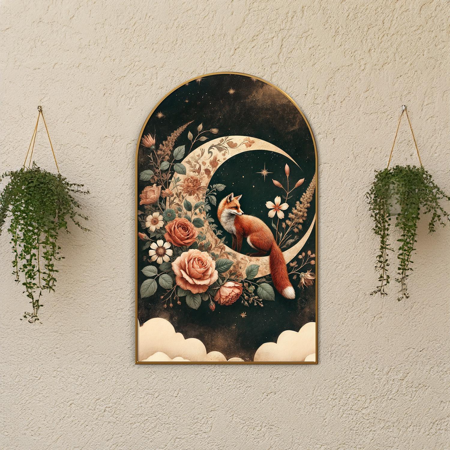 Enhance your space with this enchanting moonlit floral arch canvas featuring a whimsical fox, blending dark cottagecore vibes, rustic boho charm, and magical woodland details into a captivating statement piece.
