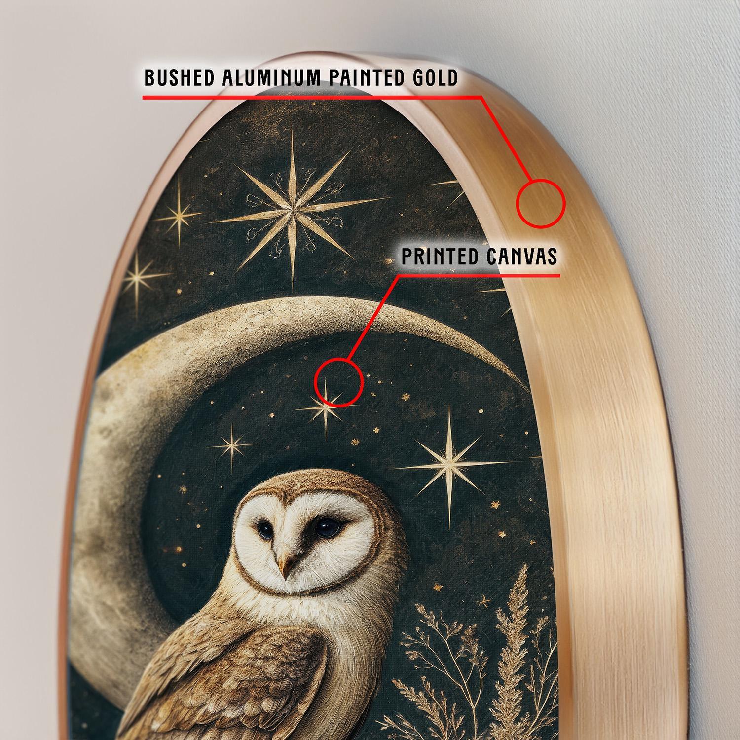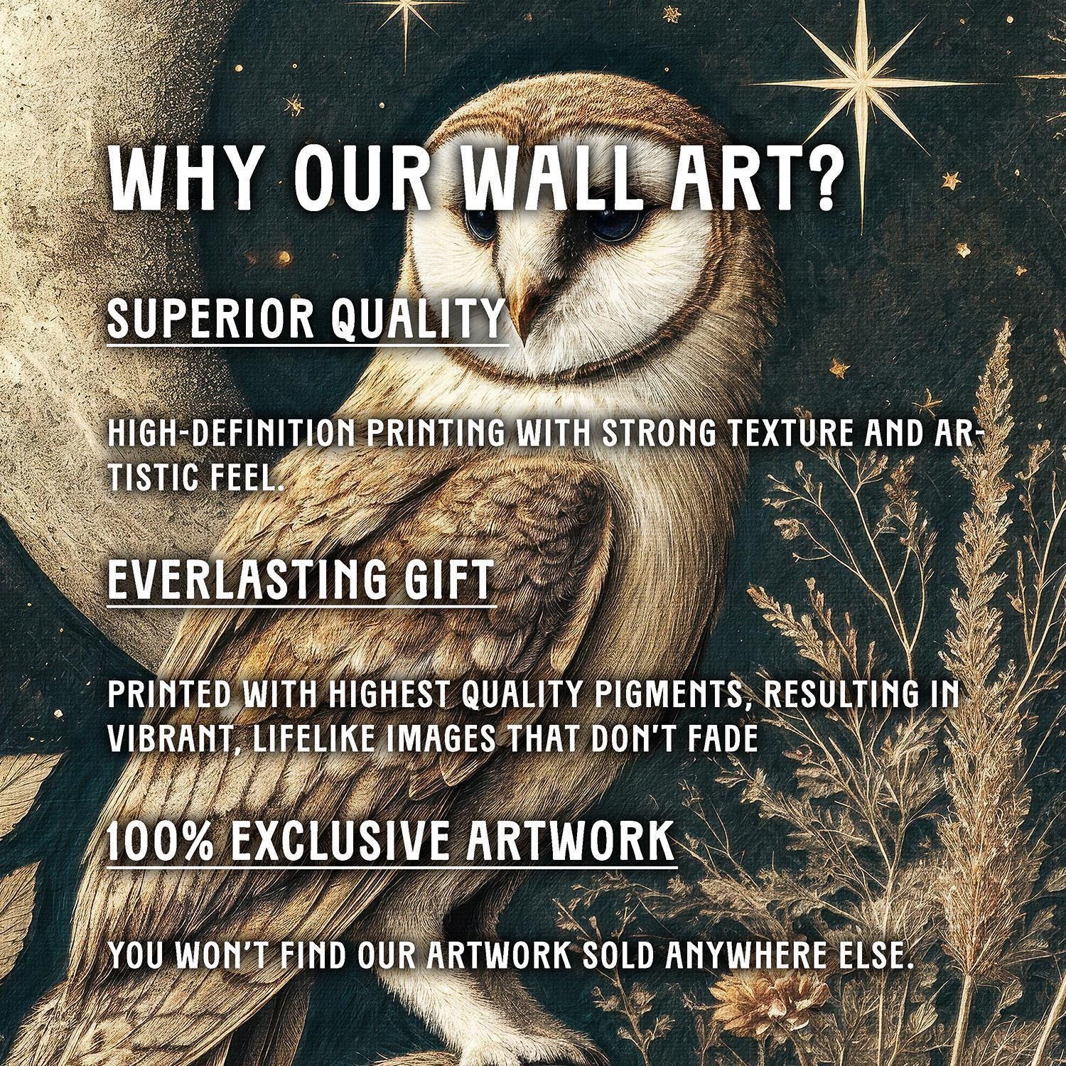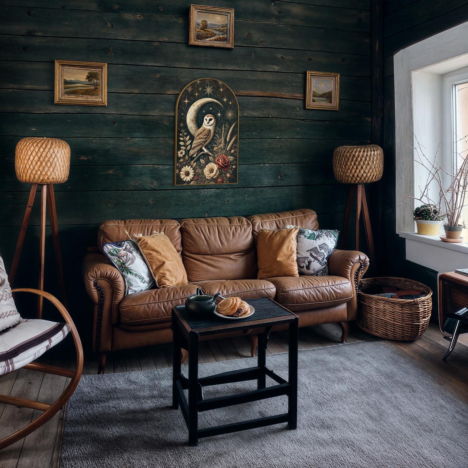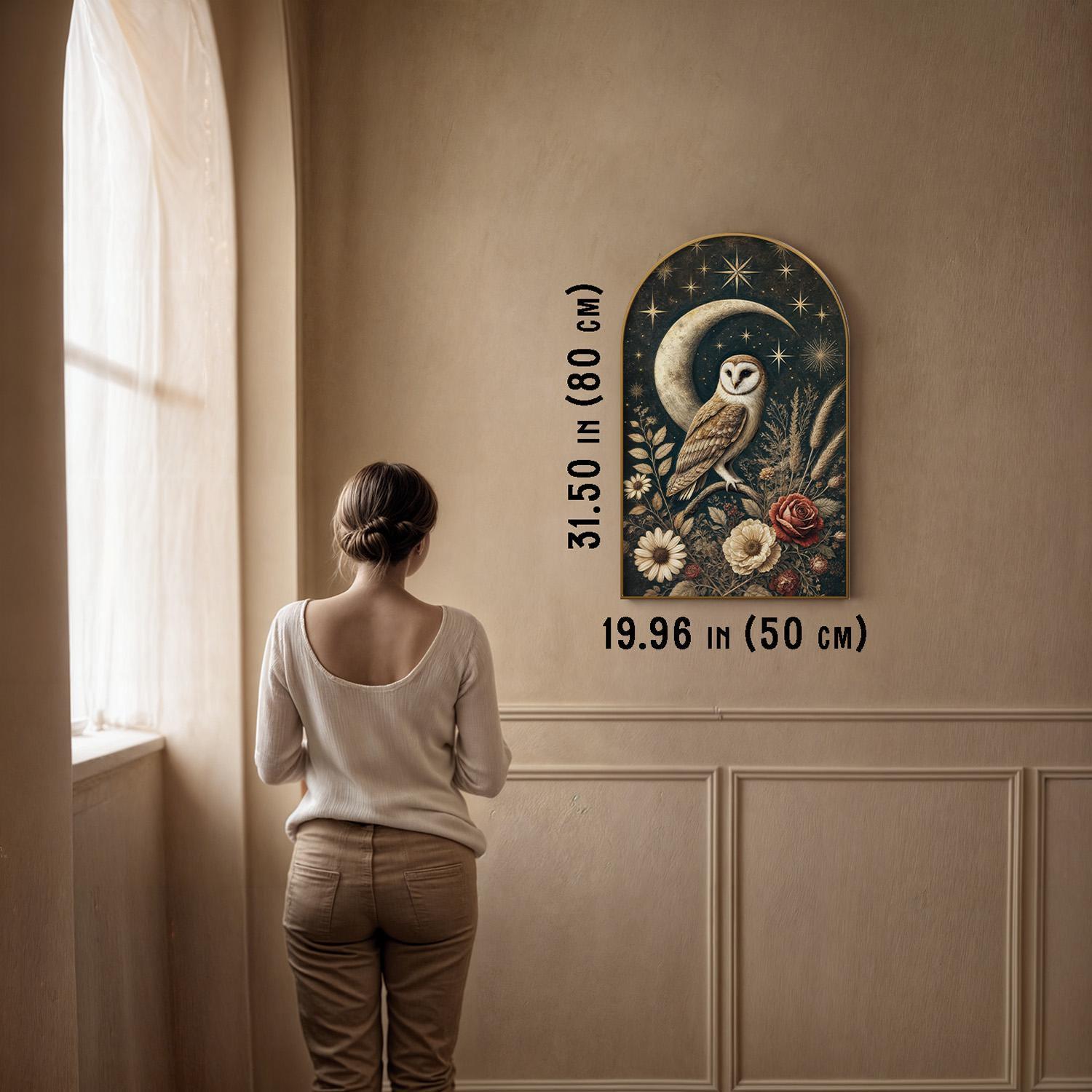 Enhance your home with this enchanting Dark Cottagecore barn owl canvas, featuring a starry moonlit floral arch that blends rustic boho style with woodland charm for a captivating focal point.