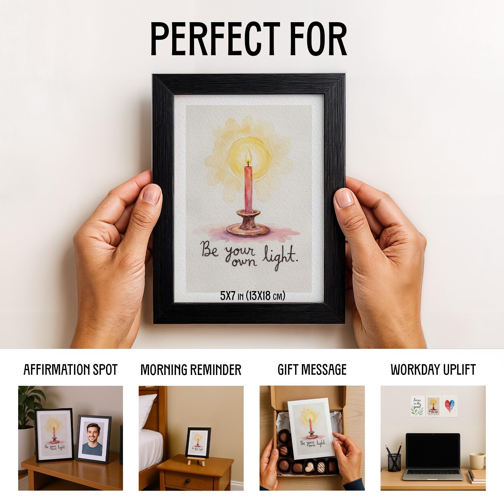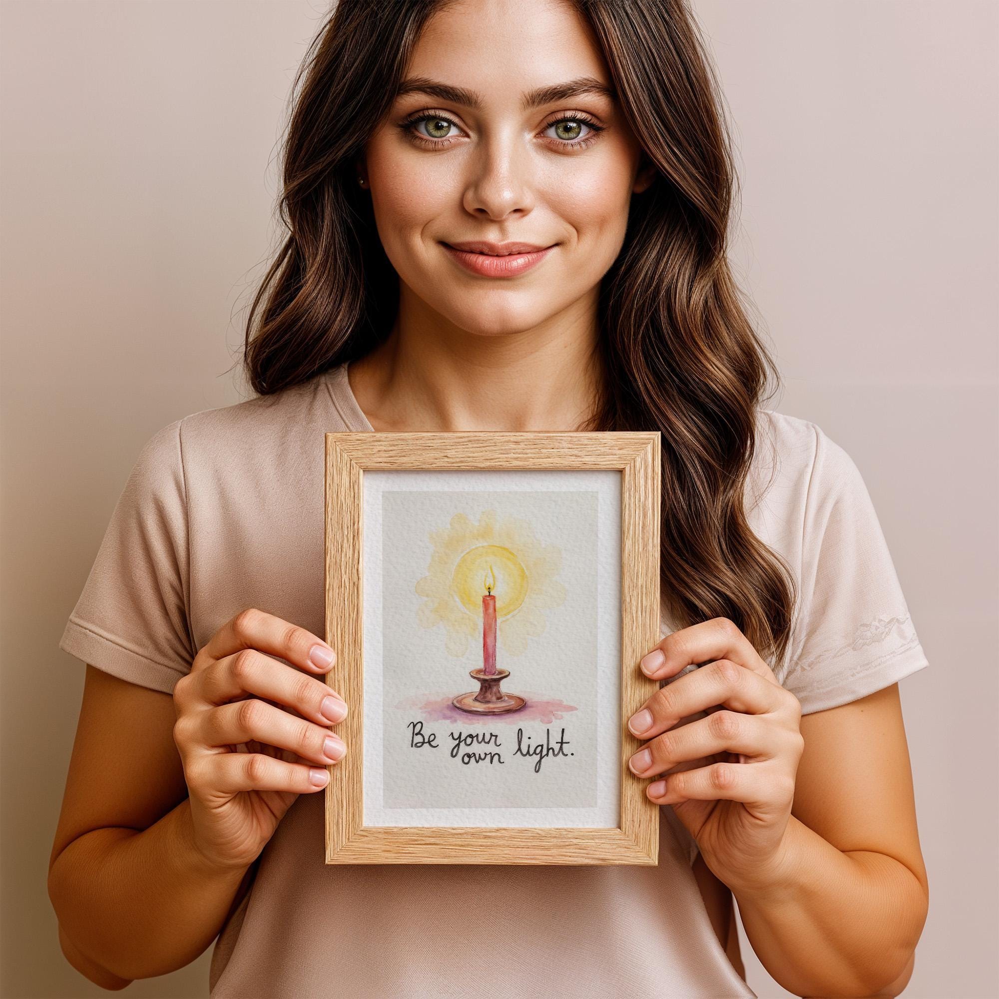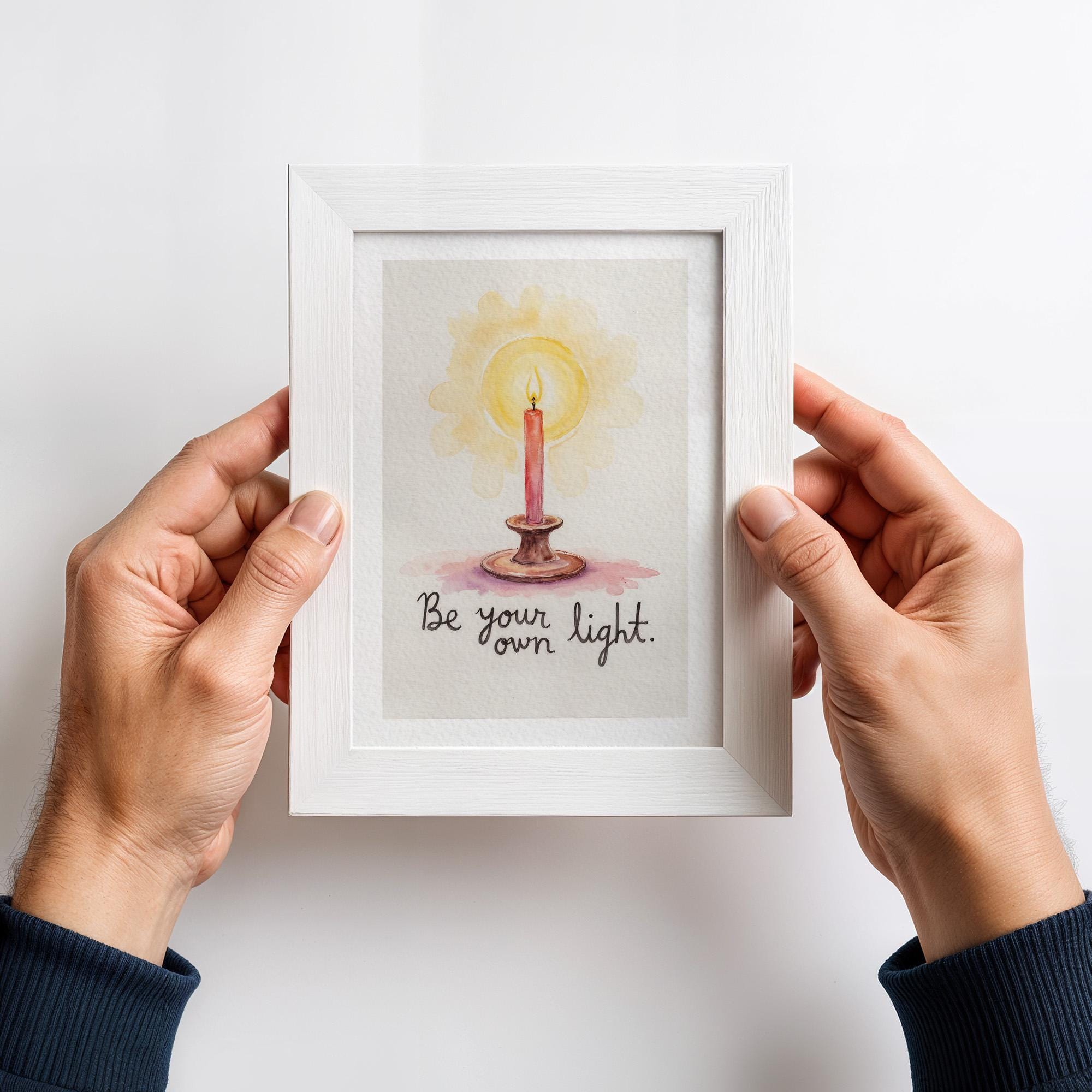Discover a daily dose of inspiration with this motivational print that beautifully captures the essence of self growth through its delicate watercolor quote art. Featuring a softly glowing candle, this affirmation wall art serves as a gentle reminder to "be your own light," filling your space with warmth and positivity. Perfect as a mindfulness gift or uplifting addition to your spiritual home decor, it invites calm and encouragement into any room.