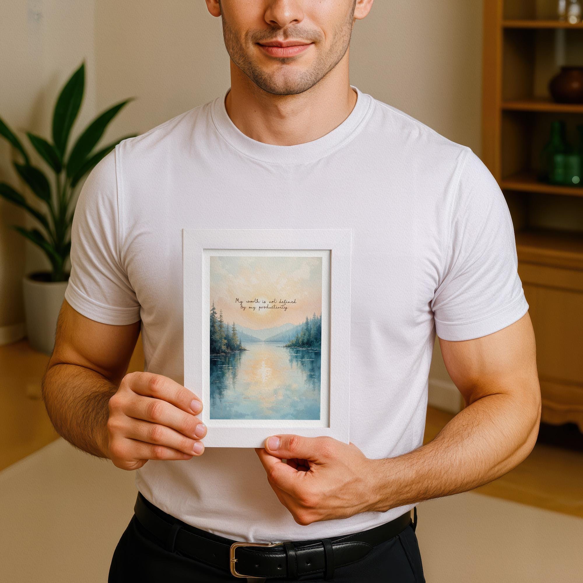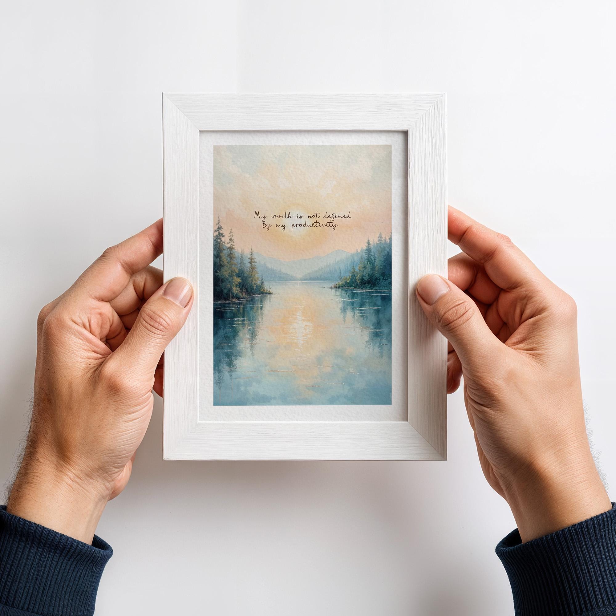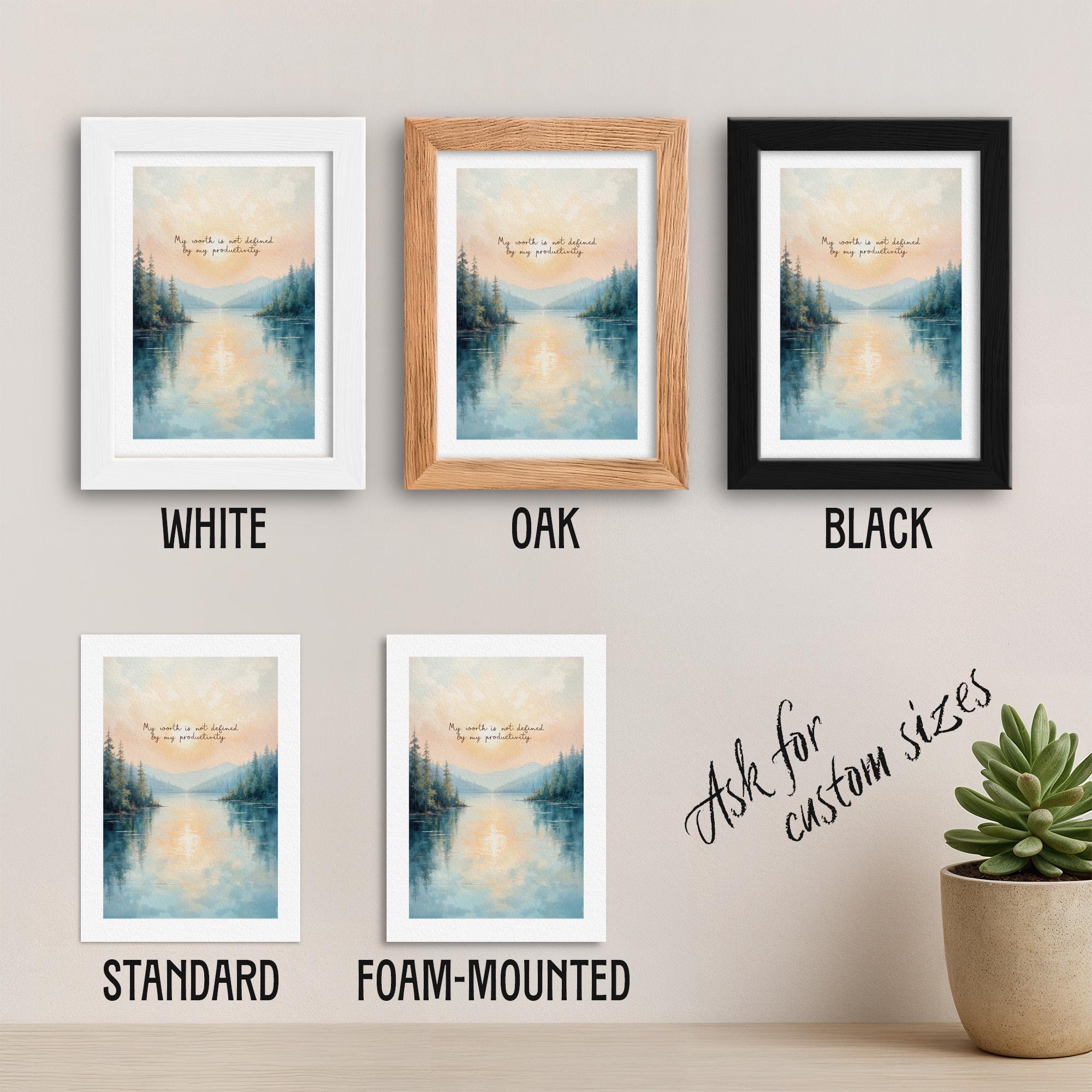 Step into a moment of calm with this serene mountain lake print, crafted to bring a peaceful balance to your space. This nature wall art serves as a gentle self worth reminder, encouraging mindfulness and uplifting your spirit each day. Perfect as calming bedroom art or a thoughtful gift, it inspires healing and positivity in any environment.
