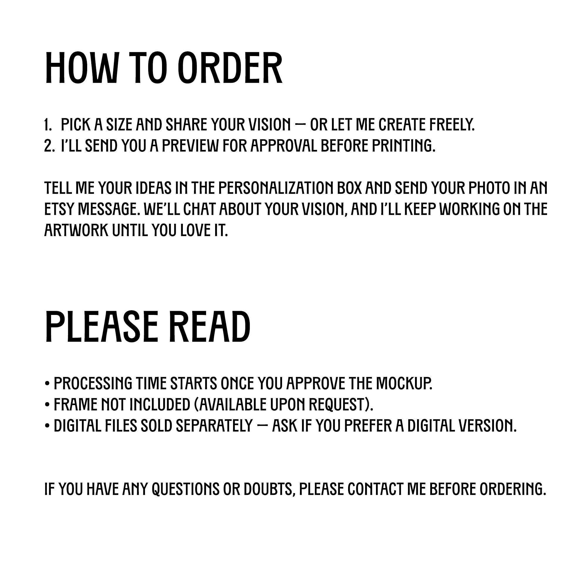 โ Select the size, and share your vision for the mood, colors, or scene, in the personalization box. Alternatively, you can give me complete artistic freedom to interpret your photo.