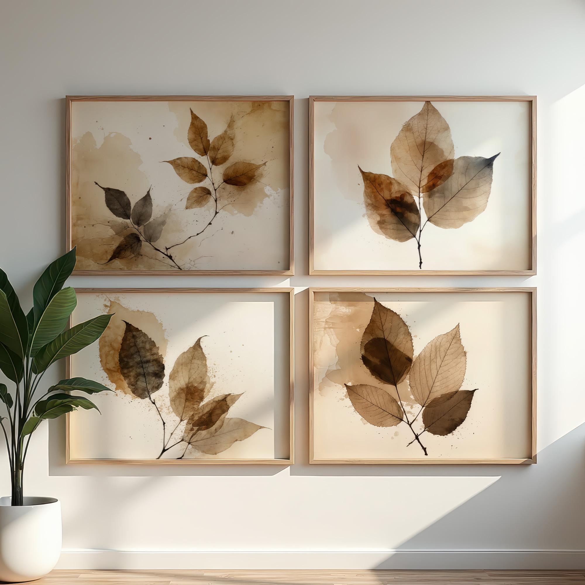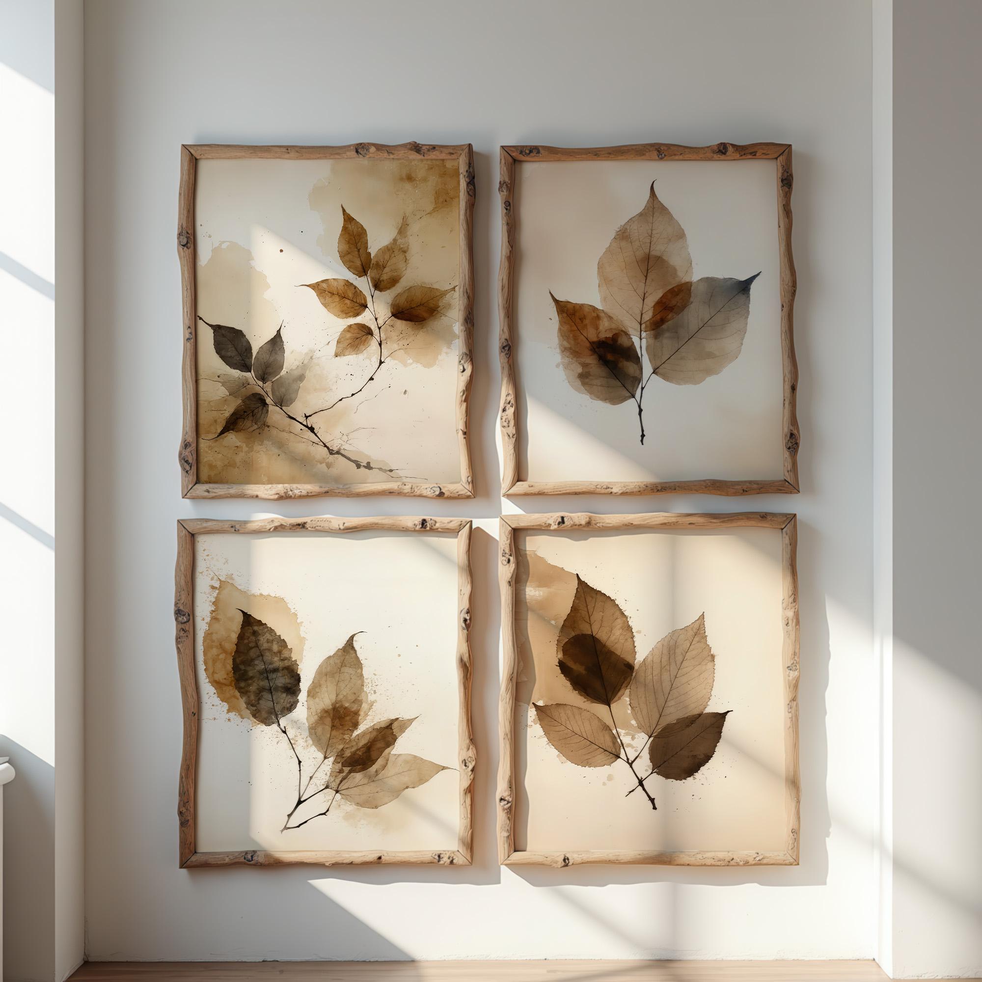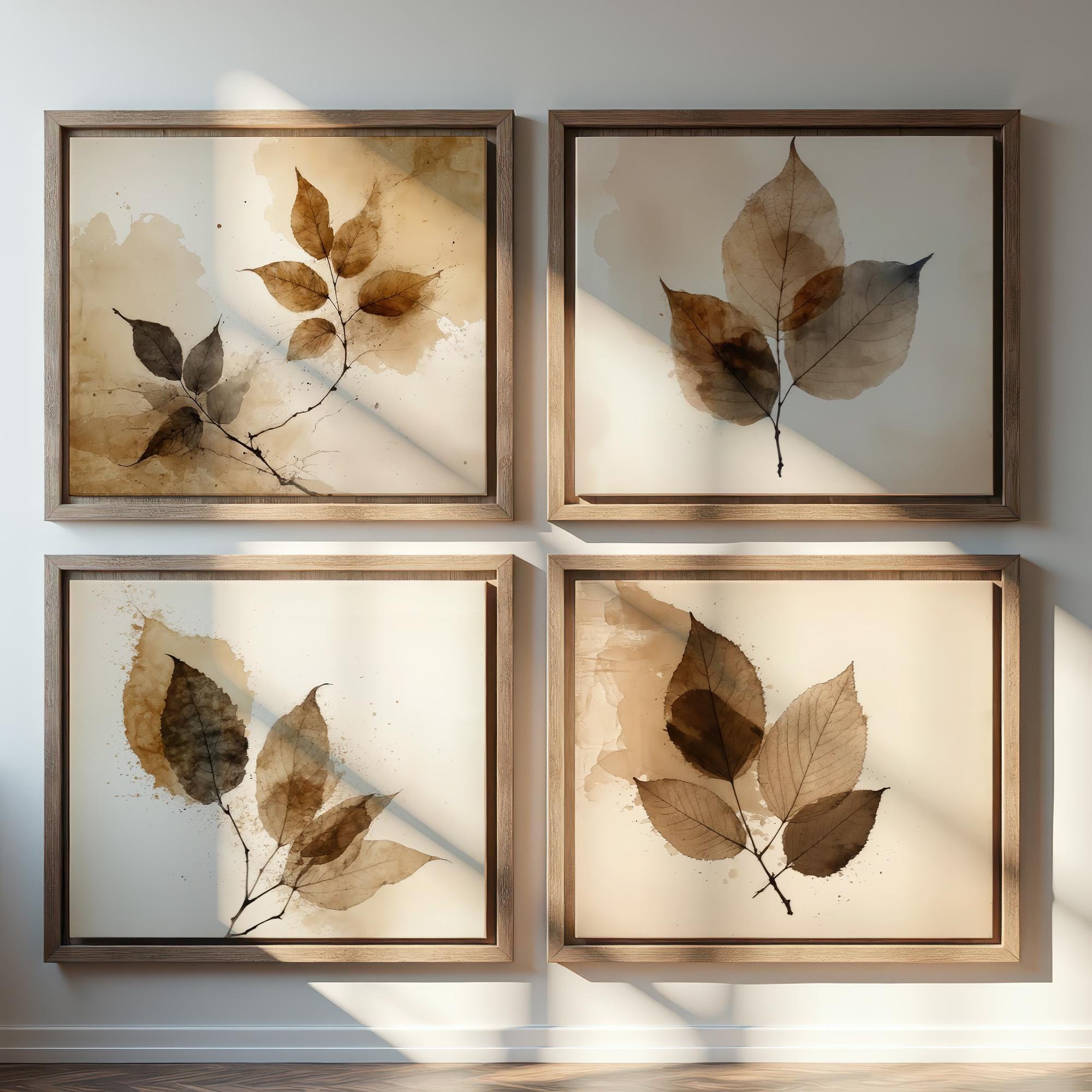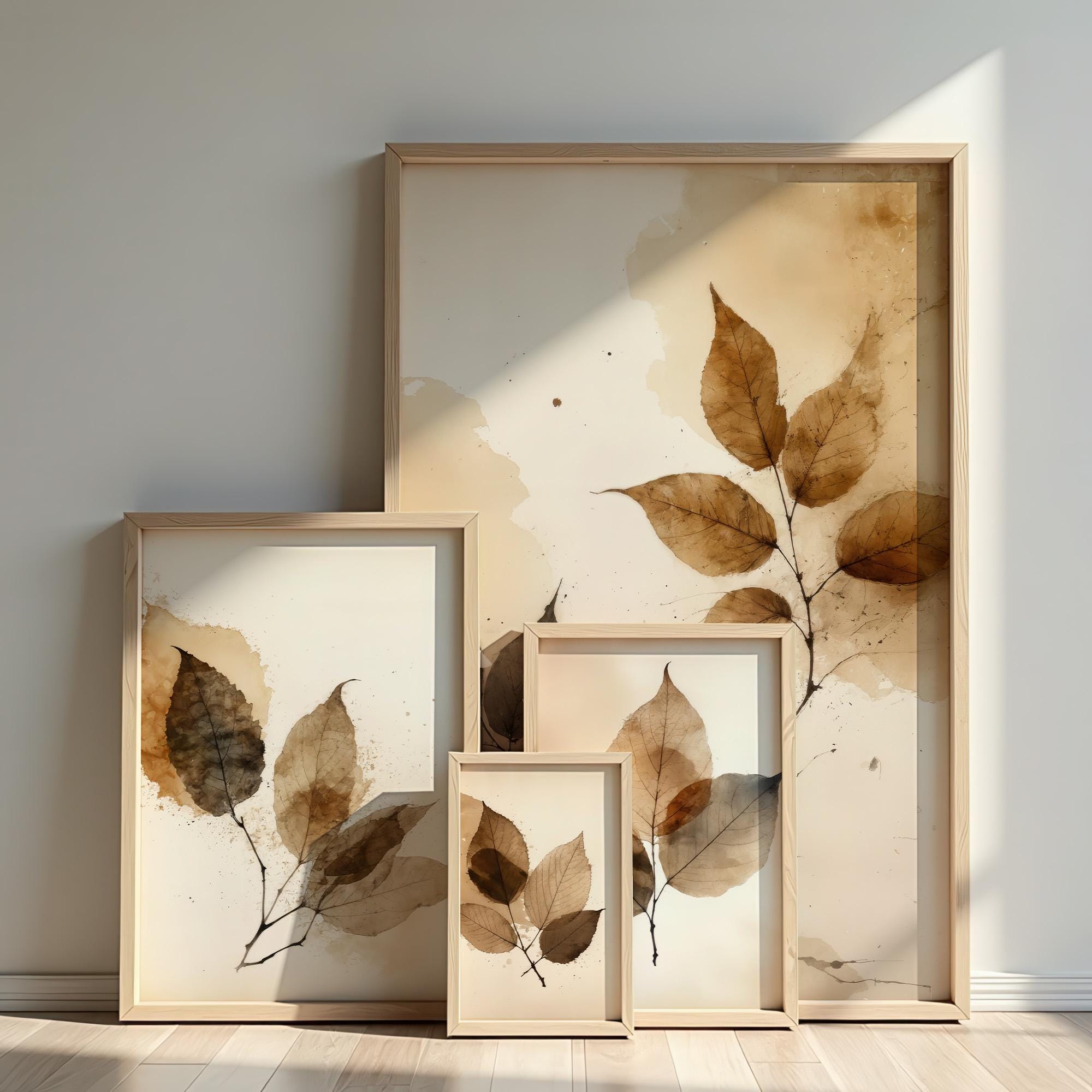 Experience the serene charm of wabi sabi art with this exquisite set of four botanical wall art prints. Each piece showcases delicate dried leaves rendered in soothing earth tone decor, bringing a natural, organic elegance to your space. Perfect for those who appreciate minimalist prints and seek to infuse their home with subtle Japandi wall art influences.