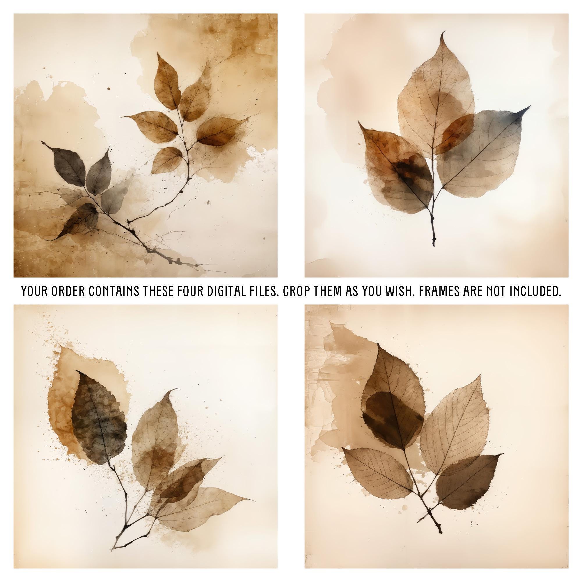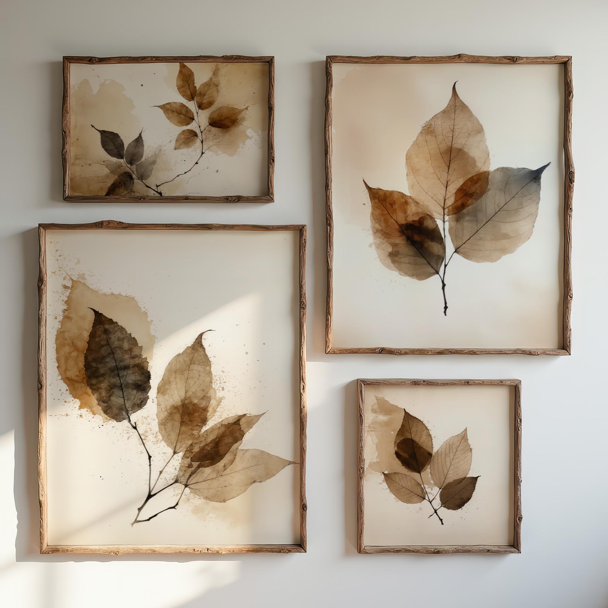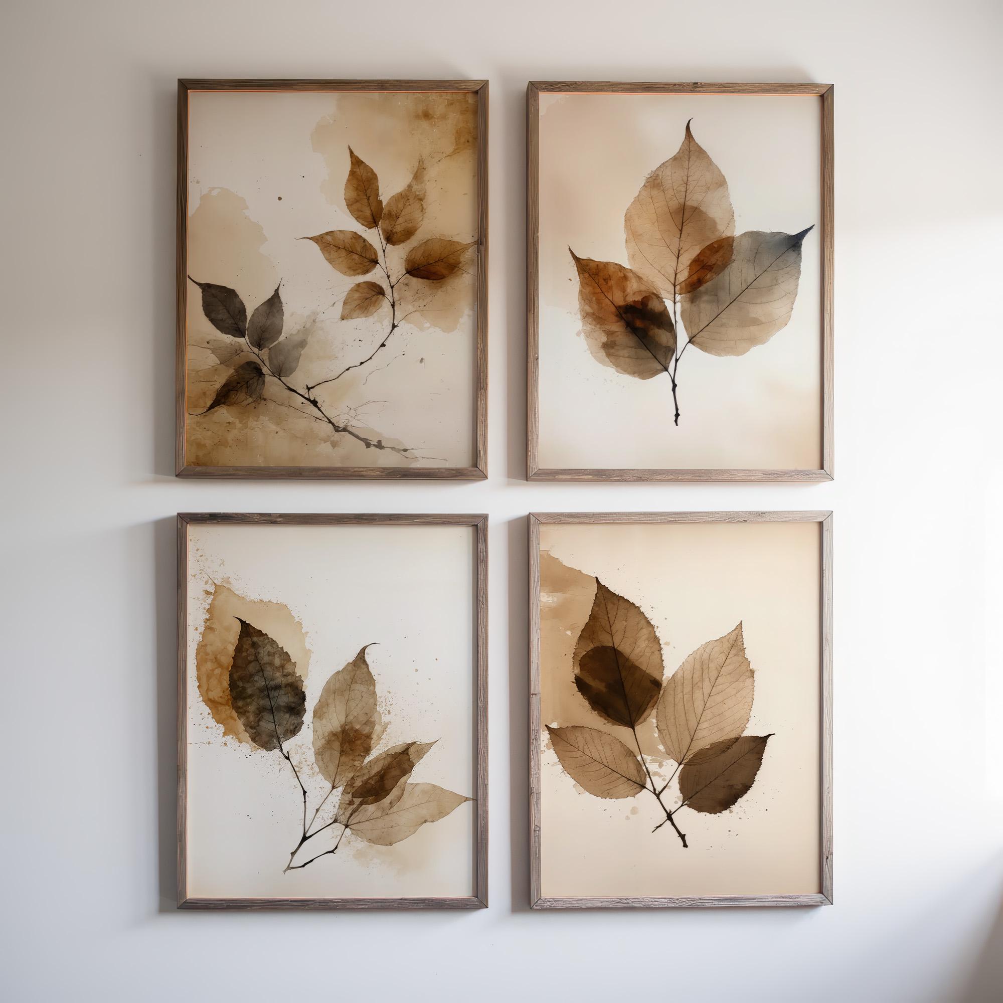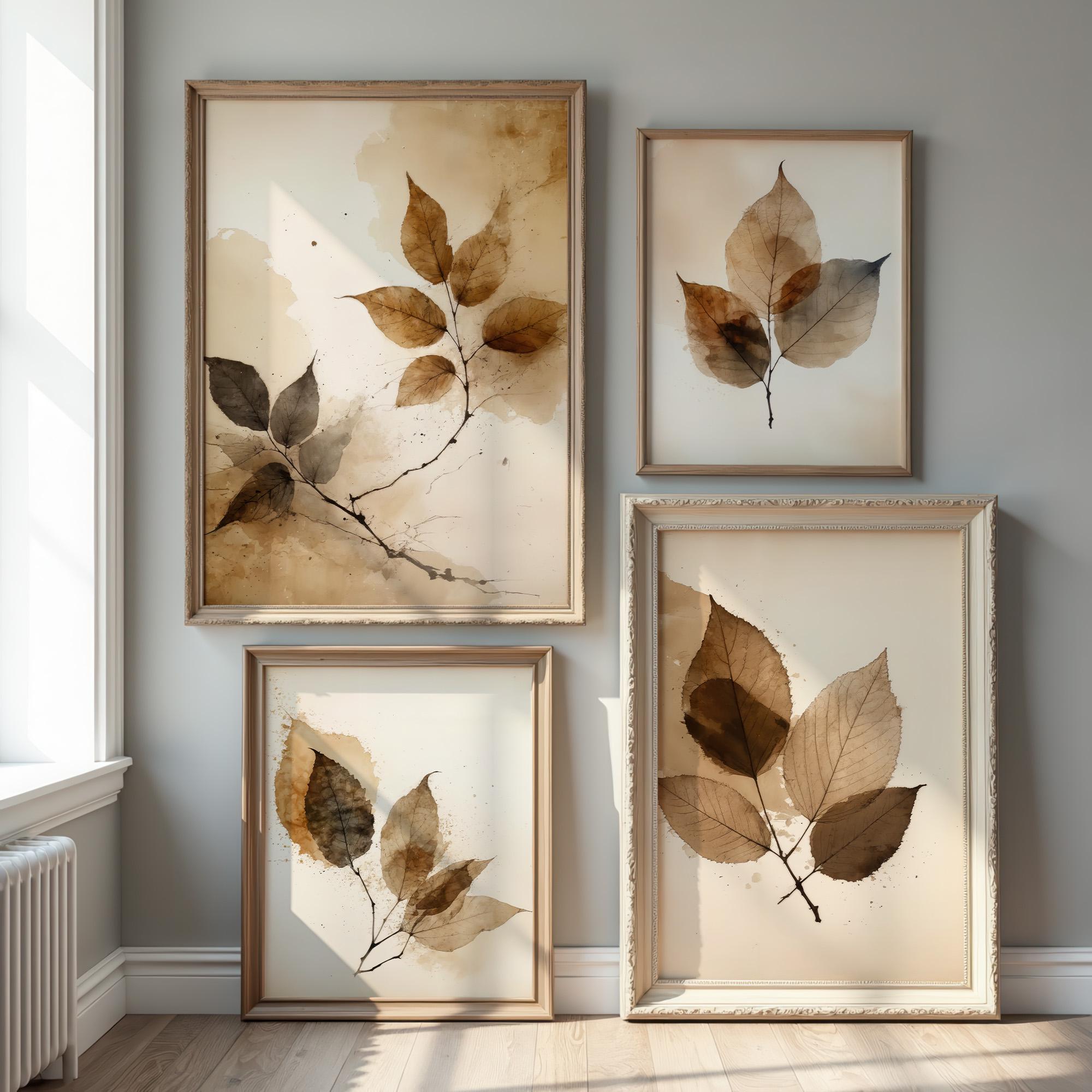 Experience the serene charm of wabi sabi art with this exquisite set of four botanical wall art prints. Each piece showcases delicate dried leaves rendered in soothing earth tone decor, bringing a natural, organic elegance to your space. Perfect for those who appreciate minimalist prints and seek to infuse their home with subtle Japandi wall art influences.