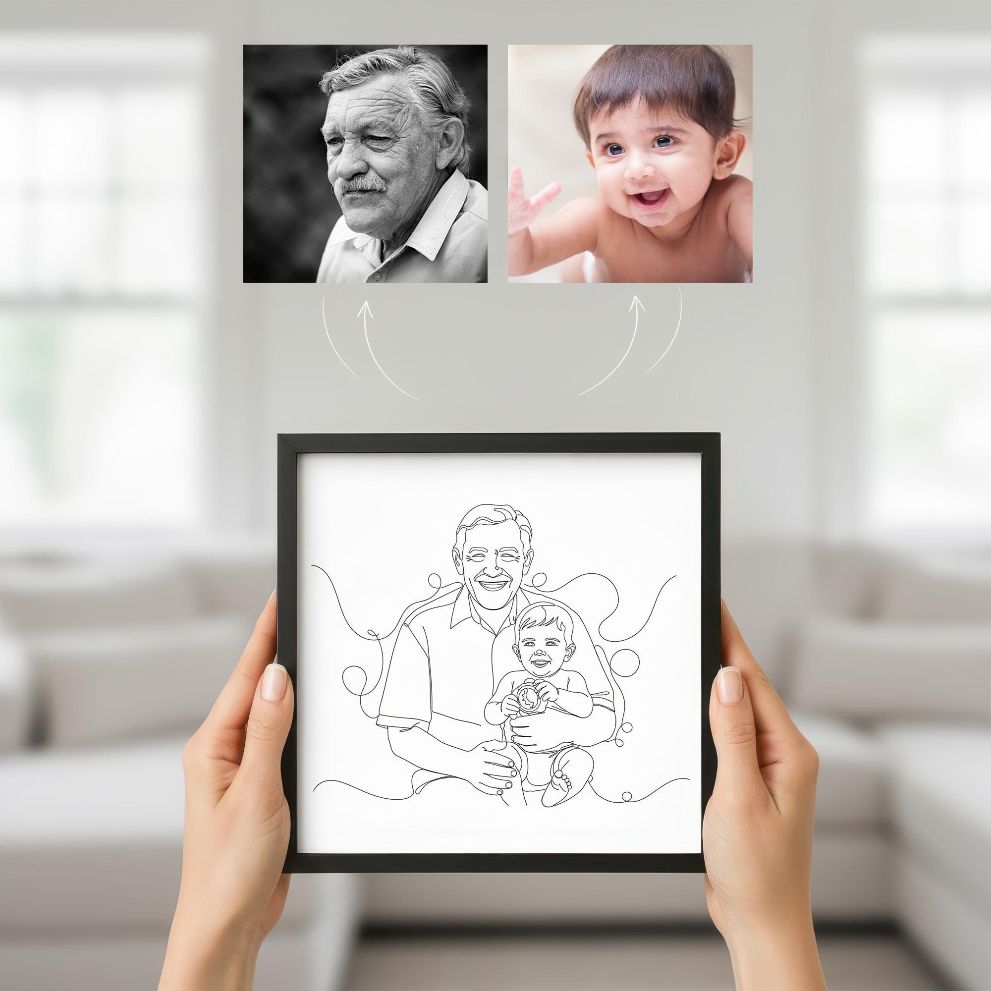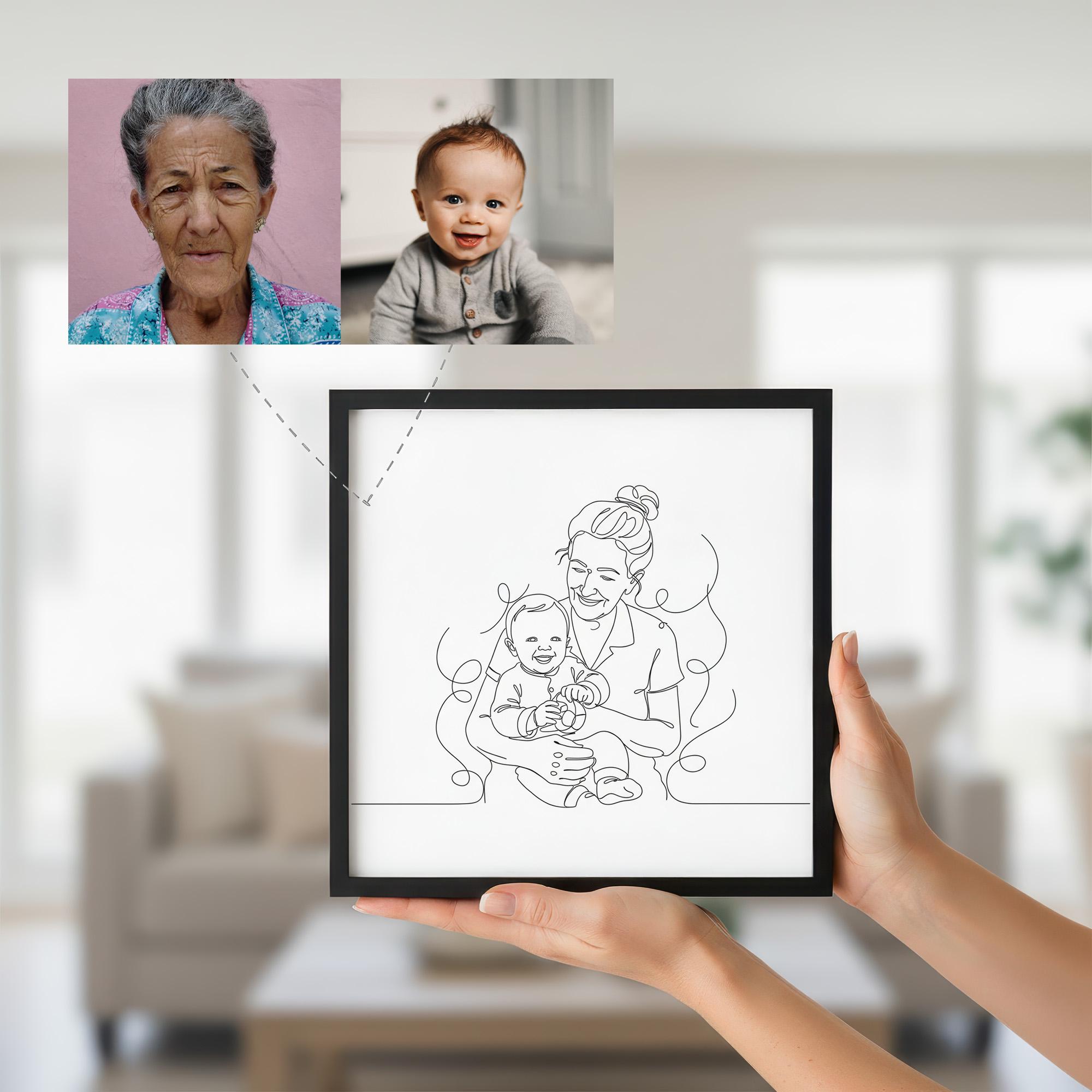 Celebrate the timeless connection between generations with this custom one line portrait, a heartfelt tribute perfect for a memorial gift or family keepsake. This minimalist drawing beautifully merges grandparent and grandchild into a single elegant artwork, capturing their bond in a simple yet deeply emotional style. Crafted as a digital portrait, it offers a unique way to honor loved ones, whether near or far, living or passed away.