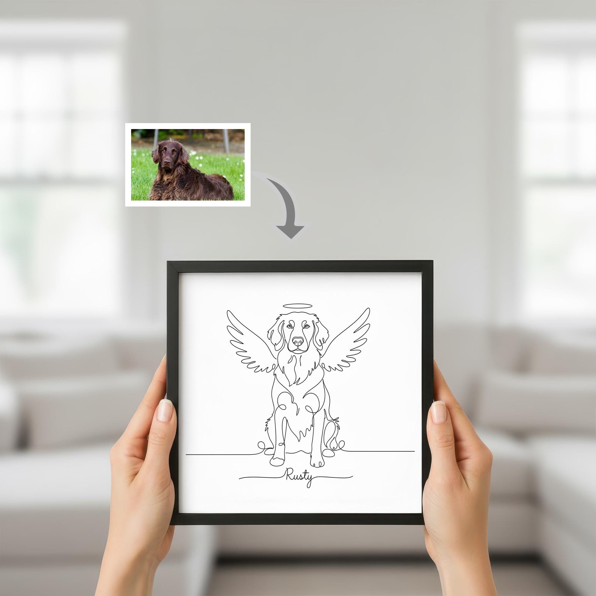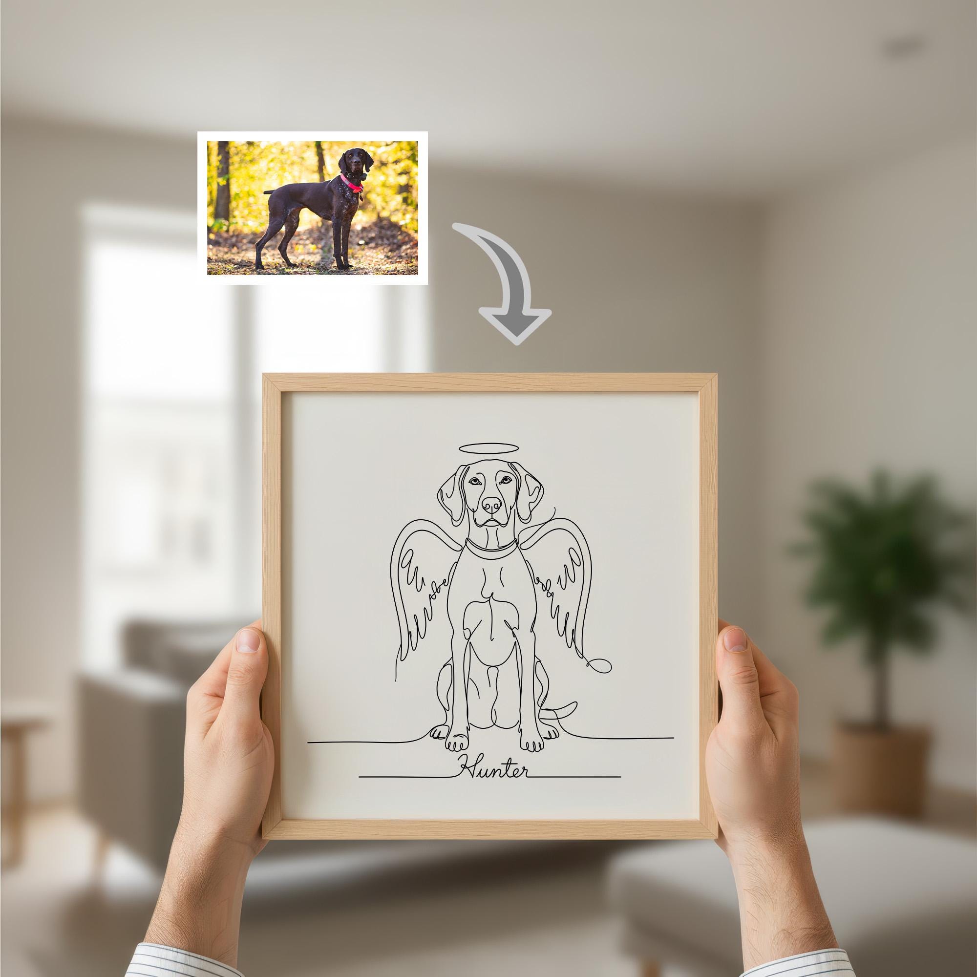 Celebrate the enduring connection with your cherished companion through a custom angel pet portrait that beautifully blends minimalist one line art with delicate angel wings. This digital memorial art offers a heartfelt pet loss tribute, capturing your furry friend's spirit in elegant black and white drawing. Perfect as a pet sympathy gift, it serves as a timeless keepsake to honor and remember your beloved friend.