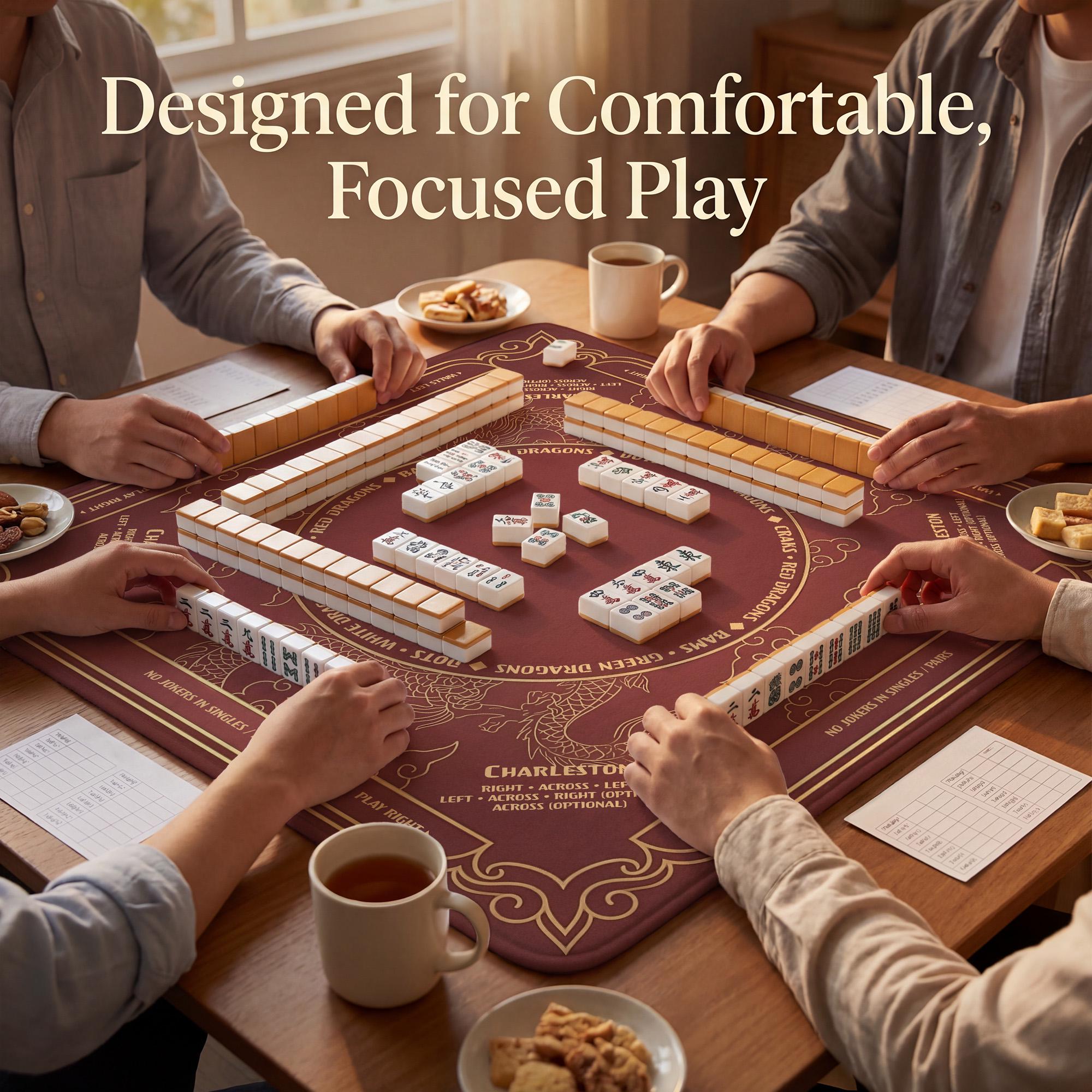 Elevate your Mahjong experience with a personalized game mat designed for both casual players and Mahjong clubs alike. This smooth play surface reduces tile noise, creating a serene atmosphere perfect for intense matches or family game night. Crafted with a non-slip rubber mat base, it stays firmly in place while being portable enough to roll up into the included carry pouch.