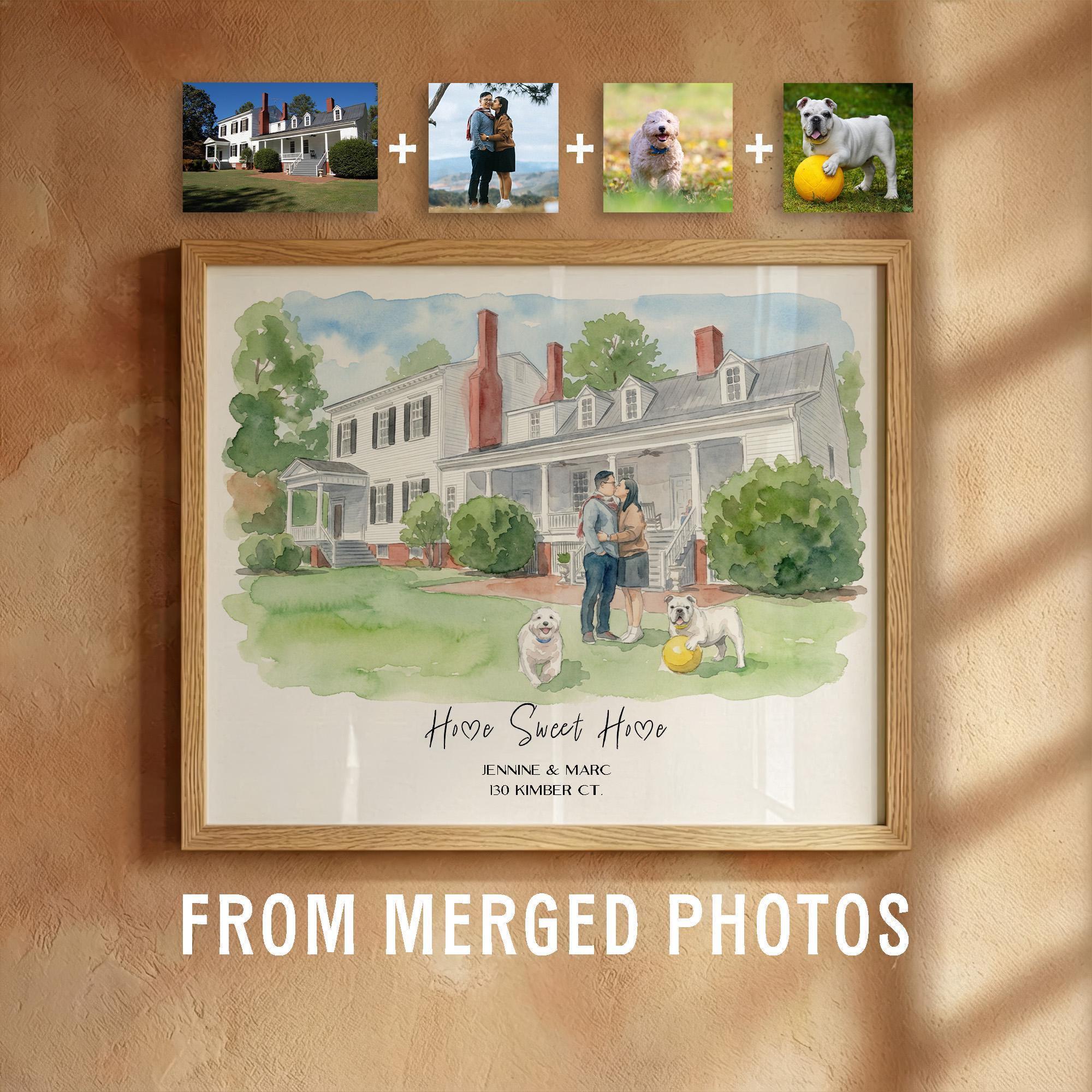 A fully personalized, digitally painted yet hand-finished style watercolor portrait featuring your house, you, and optional pets β always unique, never mass-produced.