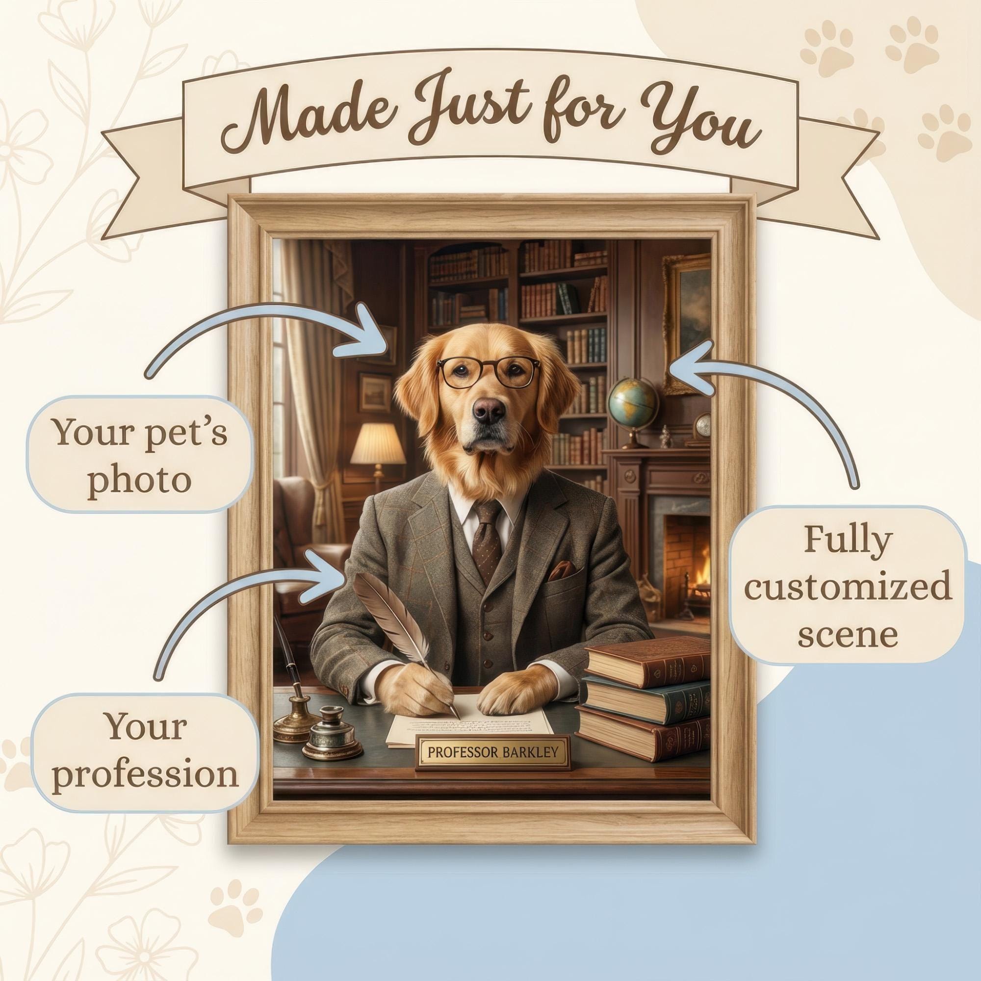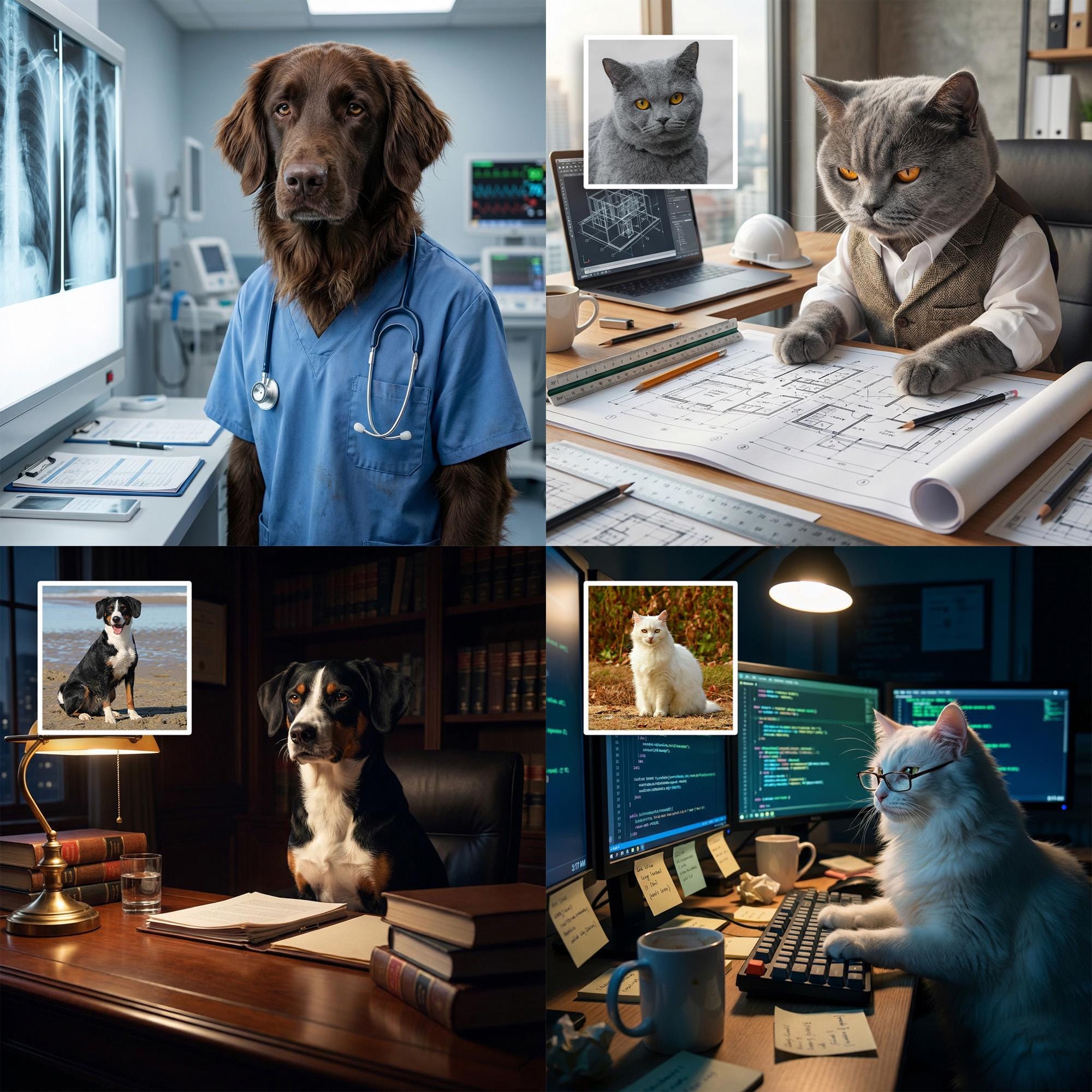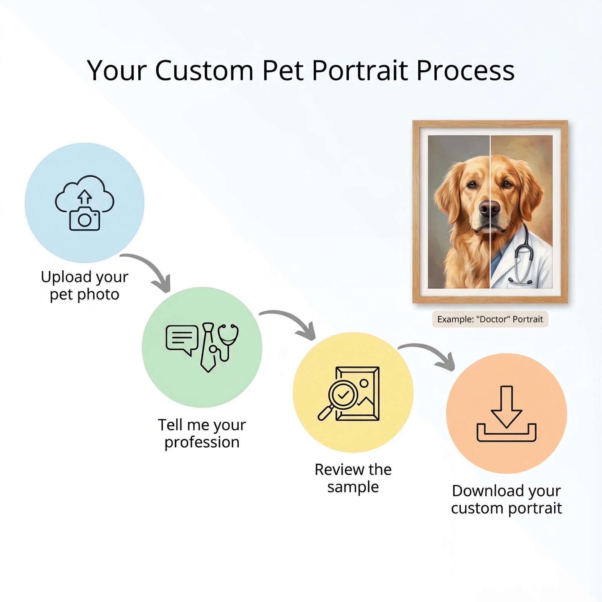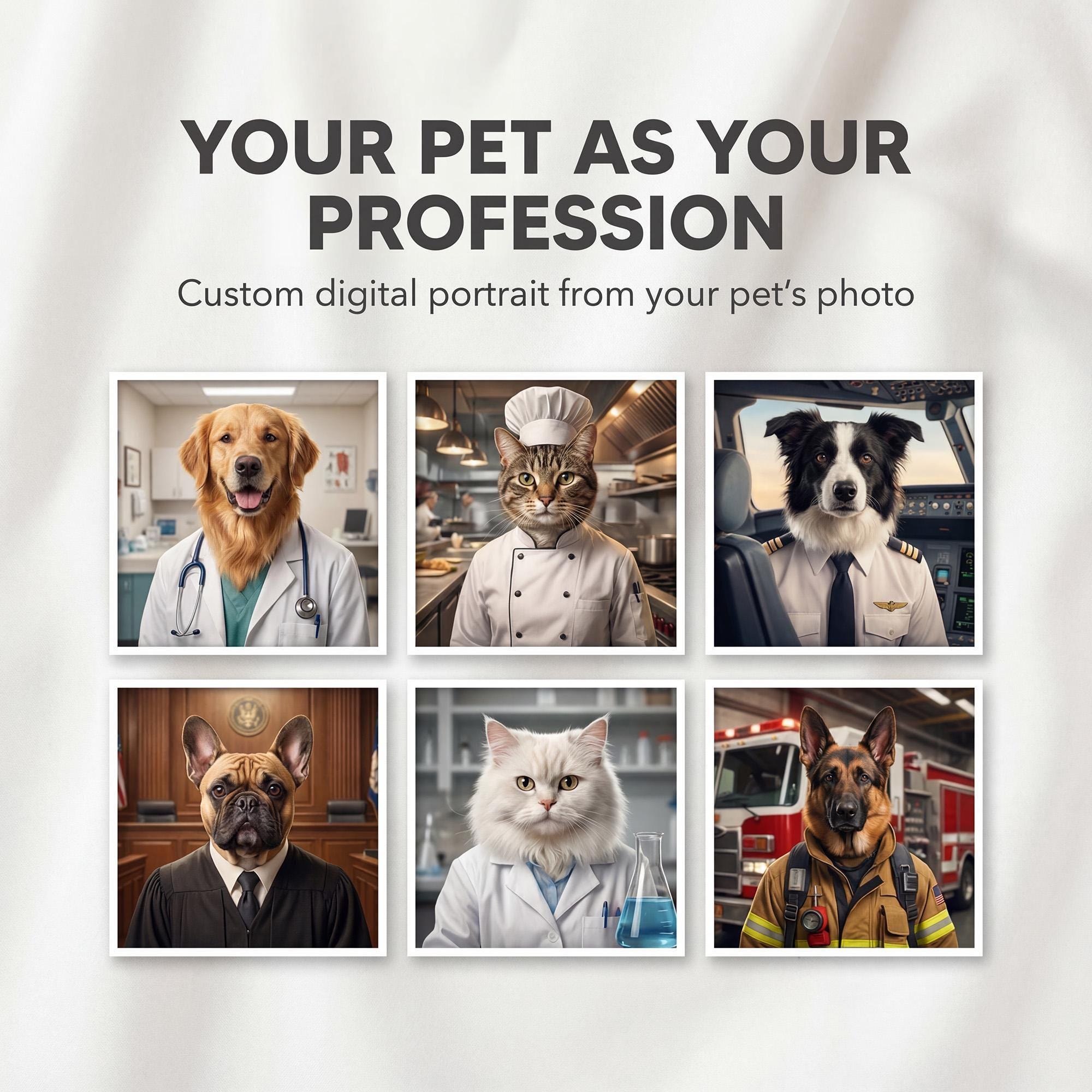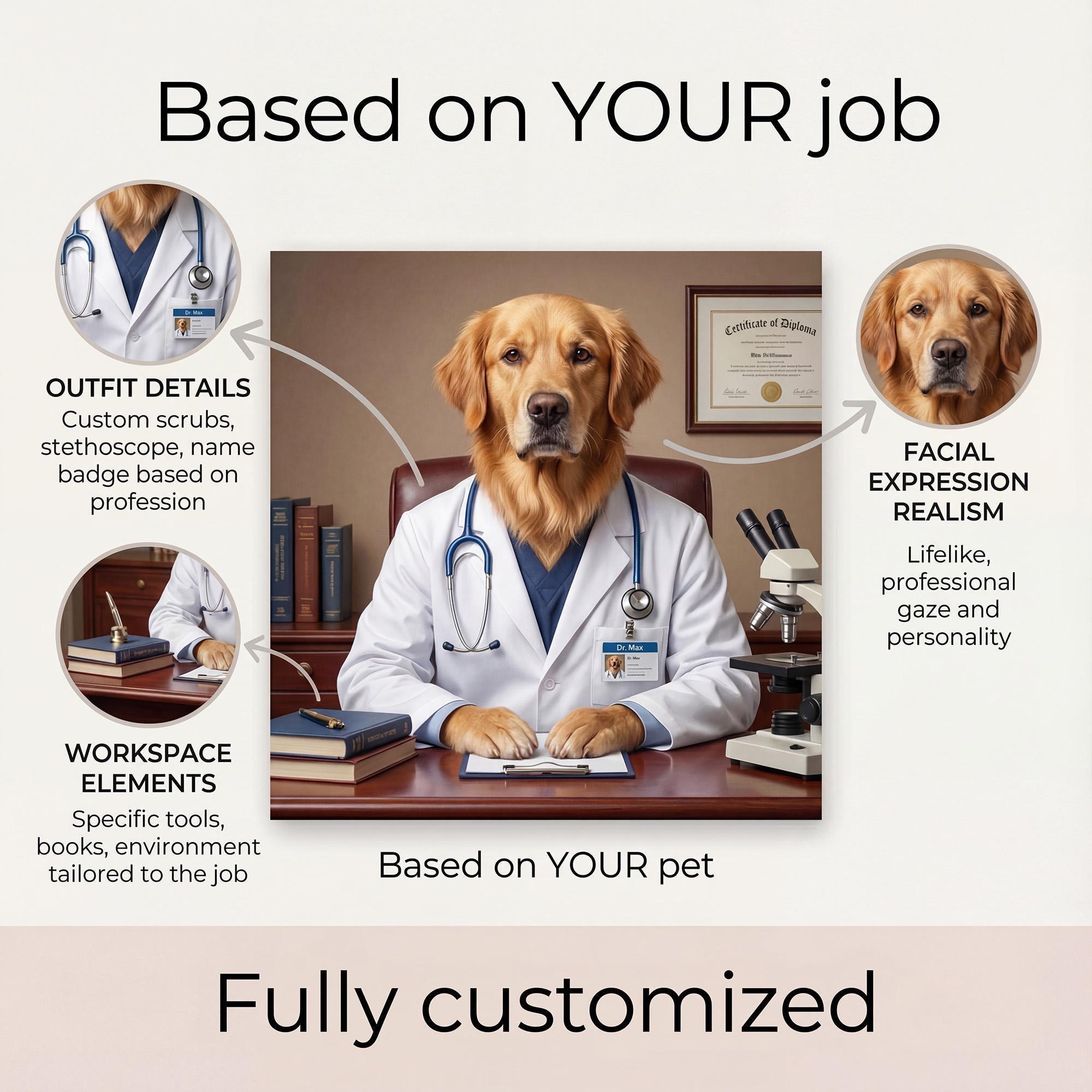 Imagine your beloved pet stepping into your shoes with a custom pet portrait that captures their unique personality, as a professional would. This cinematic pet art transforms your dog or cat into a realistic, story-driven scene inspired by your chosen profession, blending subtle humor with photorealistic detail. Whether you're looking for a funny pet portrait, digital pet art, or a unique pet gift, this custom creation makes a memorable keepsake or conversation-starting wall art.