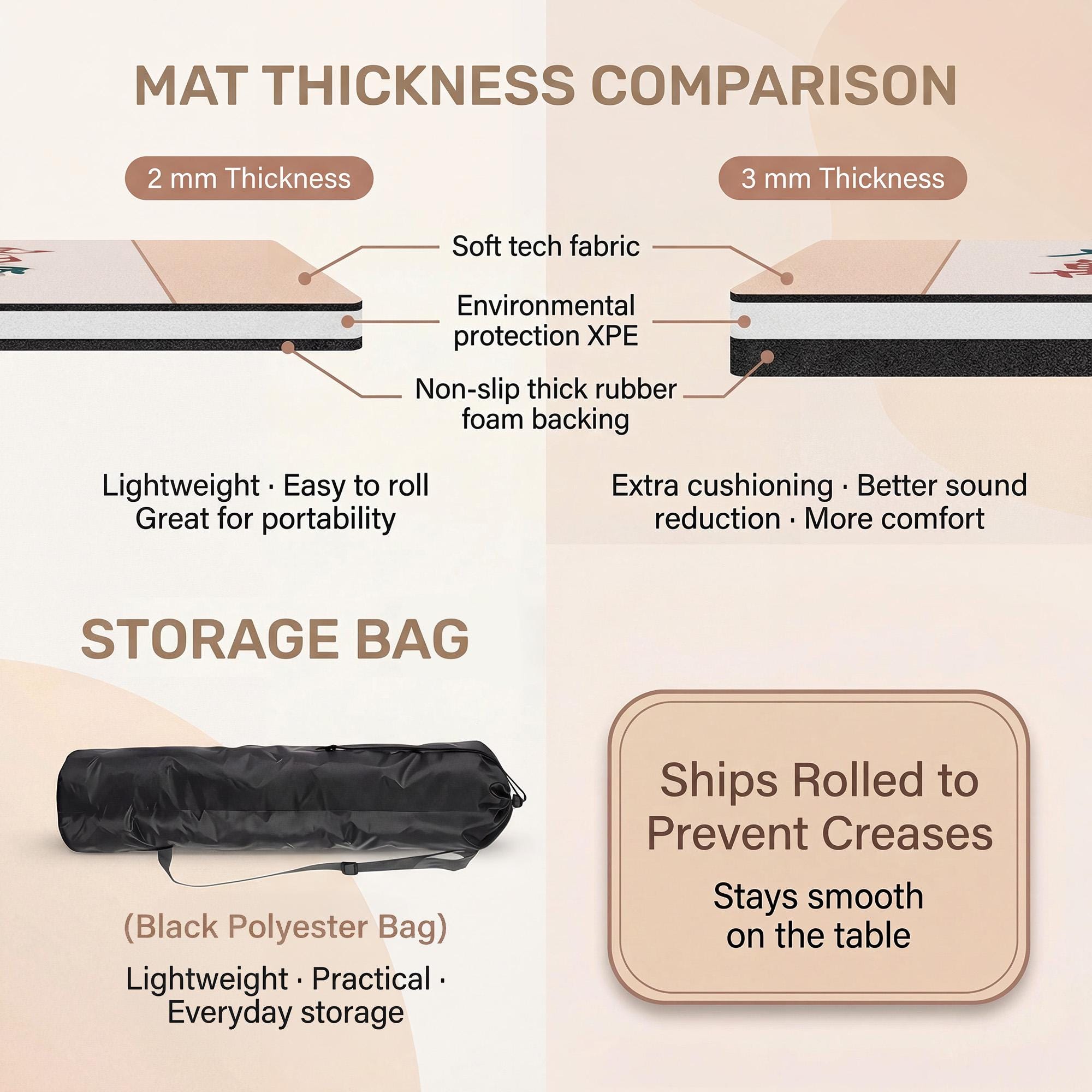 - Non-slip rubber backing keeps the mat firmly in place on any table, protecting surfaces from scratches and dents
