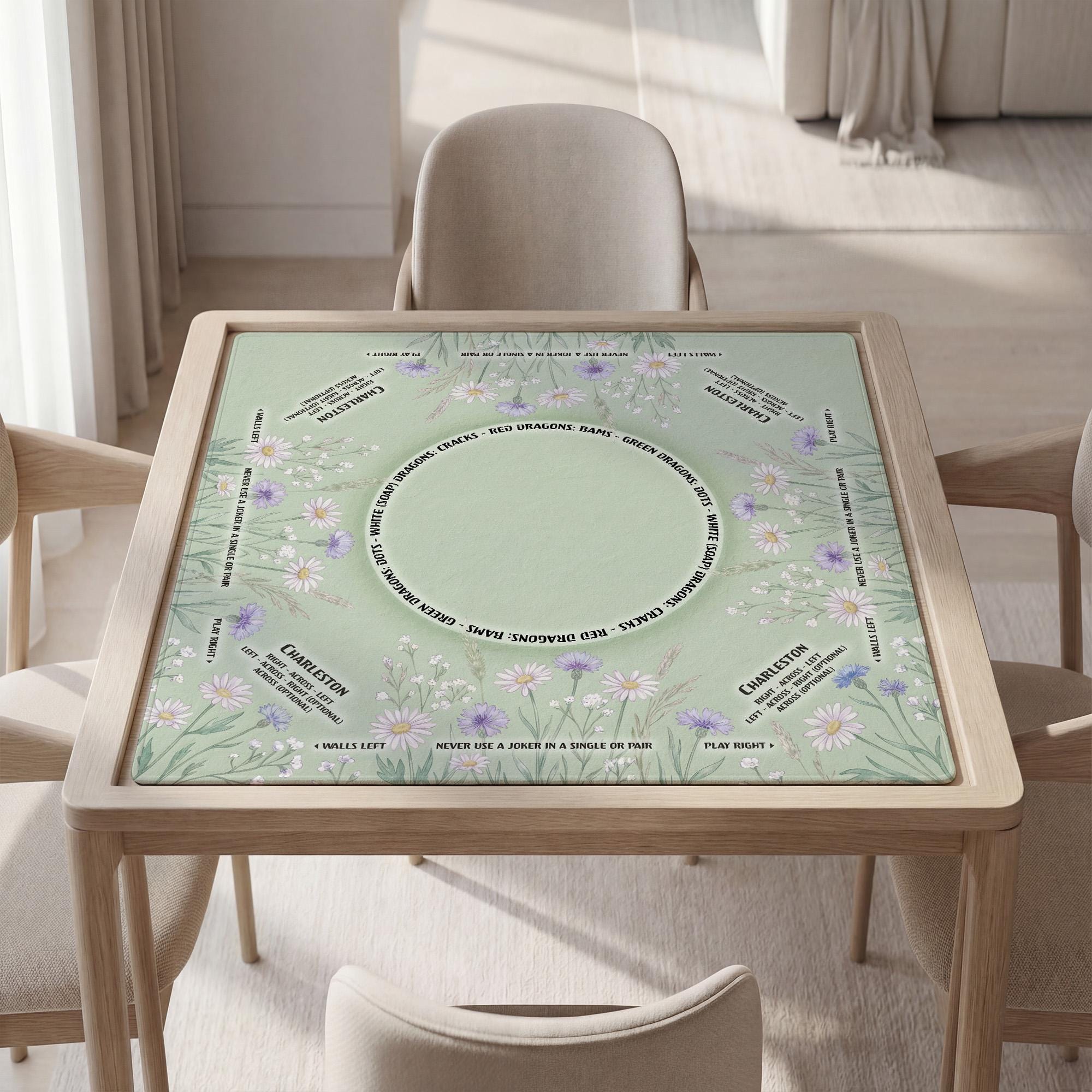 Immerse yourself in serene gameplay with this customizable mahjong game mat, featuring a soft sage green palette and delicate field flowers that bring a fresh, elegant floral style to your table. Designed for smooth play, the quiet tile surface reduces noise while the non slip rubber backing ensures stability during every round. Whether at home or on the go, this portable mahjong mat includes a handy carry pouch for effortless transport.