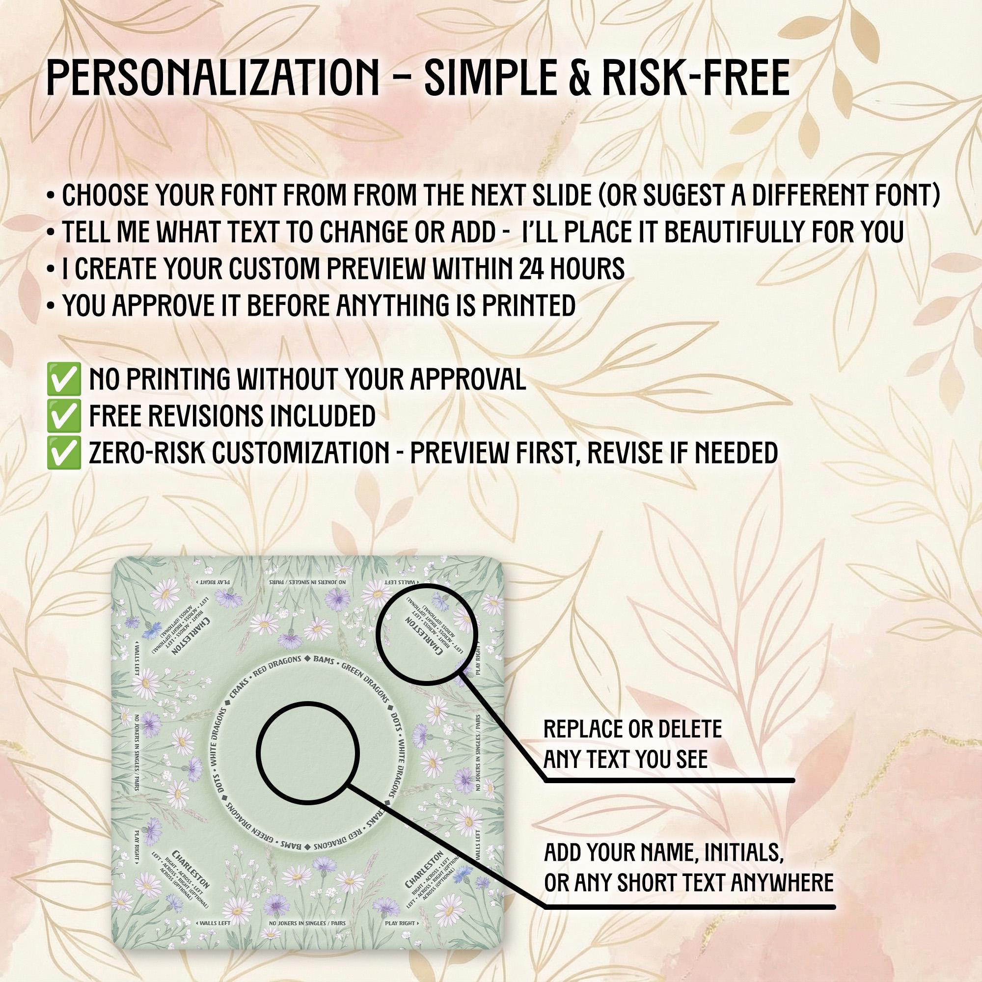 Immerse yourself in serene gameplay with this customizable mahjong game mat, featuring a soft sage green palette and delicate field flowers that bring a fresh, elegant floral style to your table. Designed for smooth play, the quiet tile surface reduces noise while the non slip rubber backing ensures stability during every round. Whether at home or on the go, this portable mahjong mat includes a handy carry pouch for effortless transport.