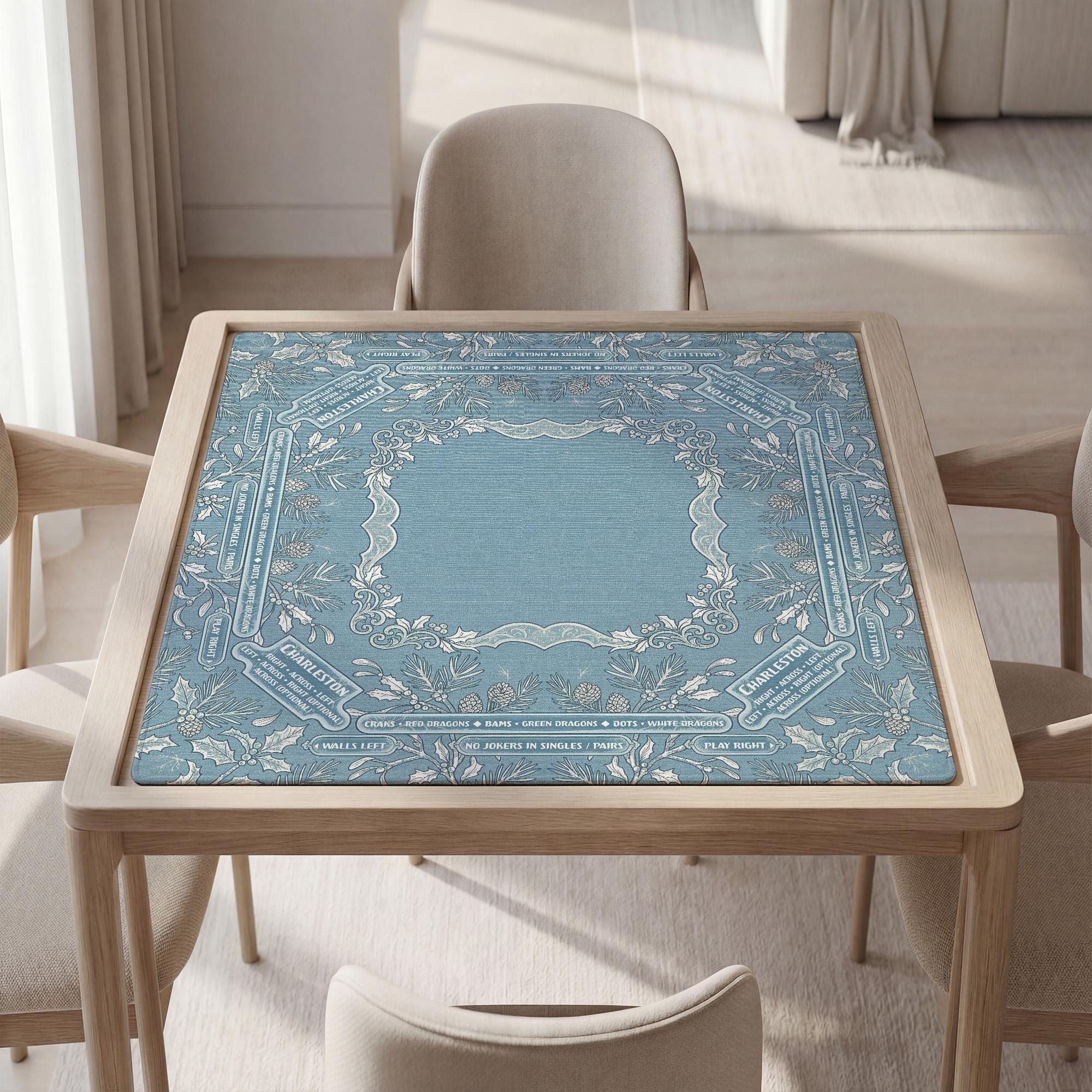 Immerse yourself in the serene charm of this winter-inspired mahjong mat, where soft seasonal blue tones and elegant botanical designs create a calm playing surface perfect for quiet tile playing. Crafted to enhance your game nights, this custom mahjong mat offers personalization options that let you add a monogram or text for a truly unique touch. Whether you prefer the clean look of the text-free version or a personalized centerpiece, this mat brings both style and function to your table.
