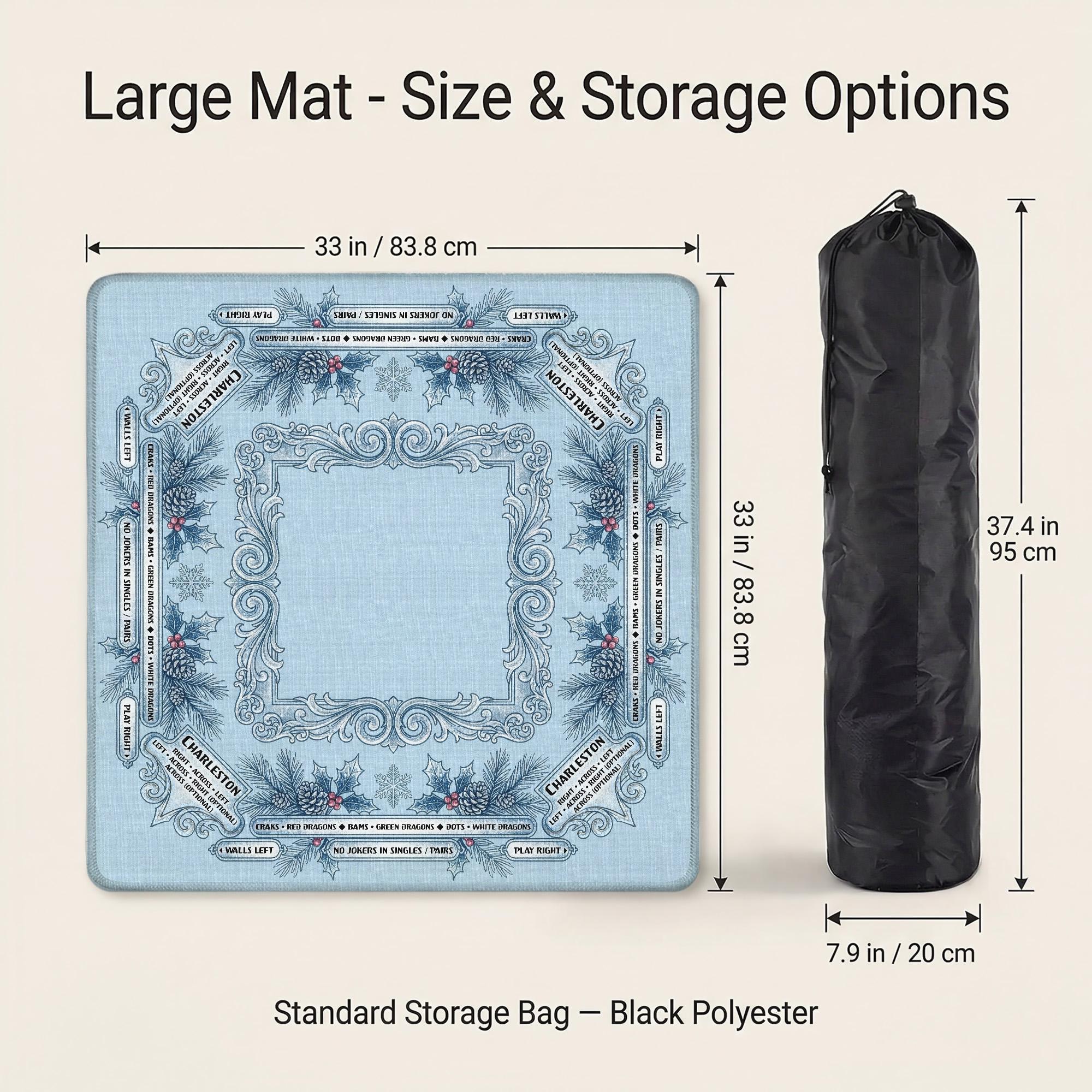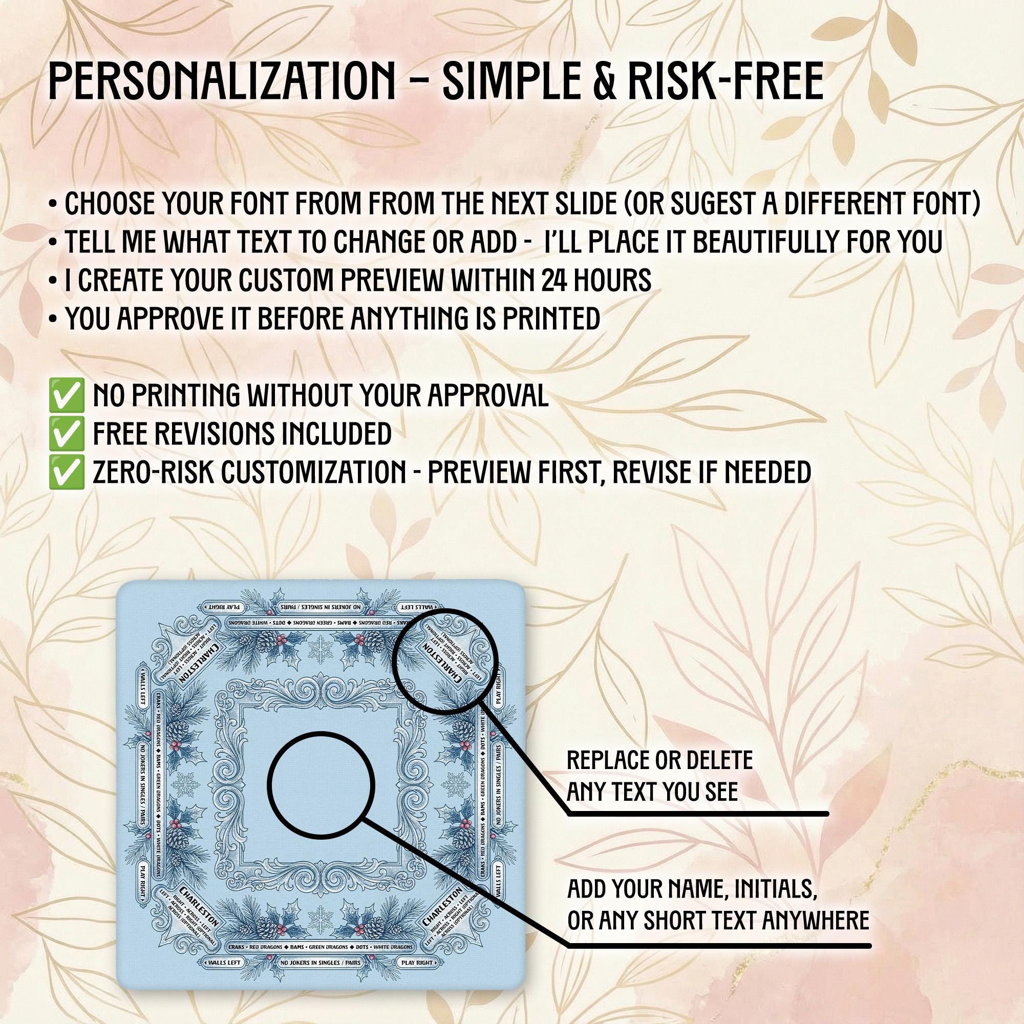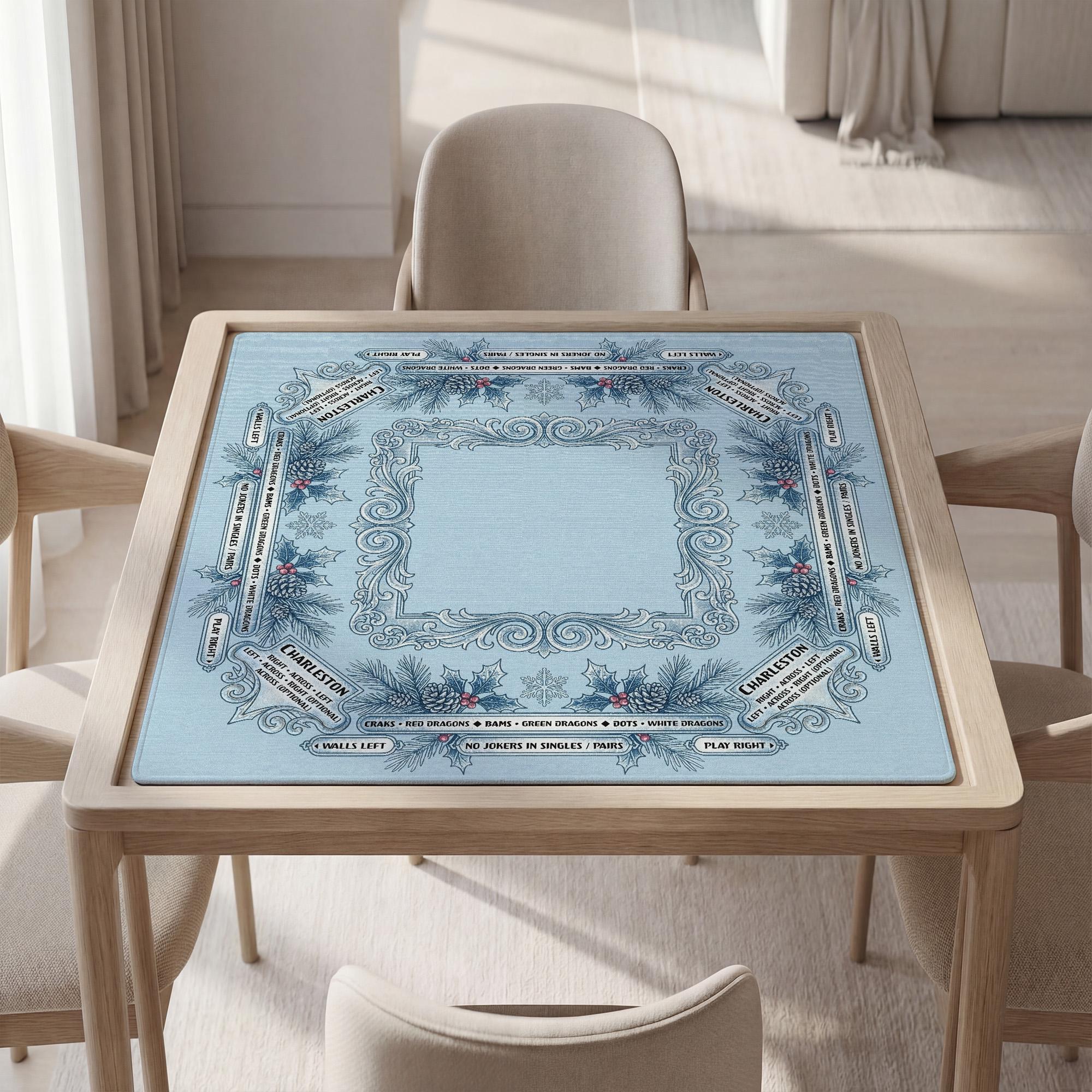 Experience the tranquil elegance of our winter-inspired mahjong mat, designed to bring a calm playing surface to your game nights. Featuring soothing seasonal blue tones and delicate botanical patterns, this mat enhances every match with its smooth game mat feel and quiet tile playing benefits. Personalize your experience with custom text or monograms, making this winter mahjong mat uniquely yours.
