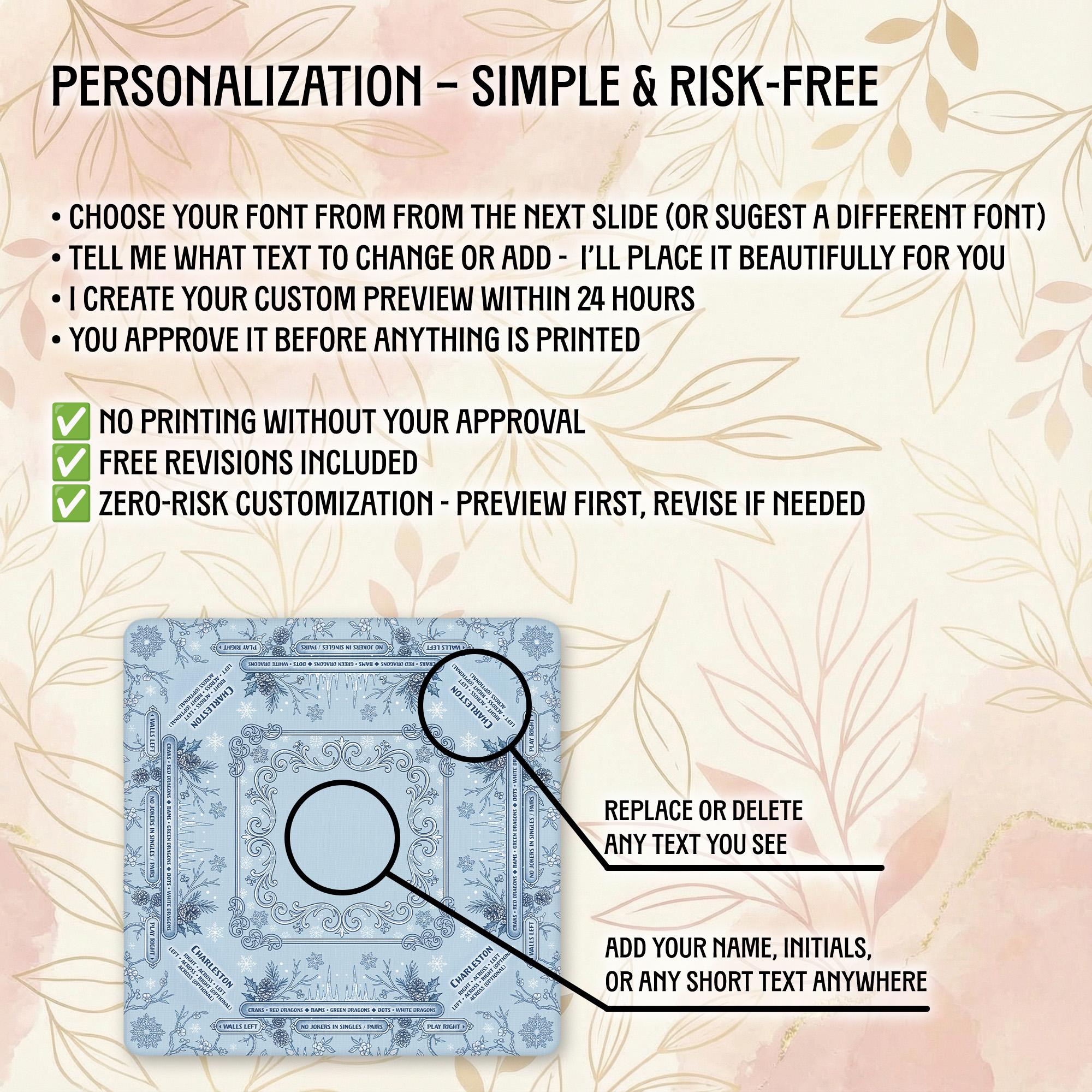 Immerse yourself in the serene charm of our winter-inspired mahjong mat, where seasonal blue tones and a delicate botanical pattern create a tranquil backdrop for your game nights. Designed with a smooth game surface and quiet tile playing benefits, this mat elevates every match with elegance and comfort. Personalize your experience with custom text or monograms, making this non-slip mat uniquely yours and perfect for thoughtful gifting.
