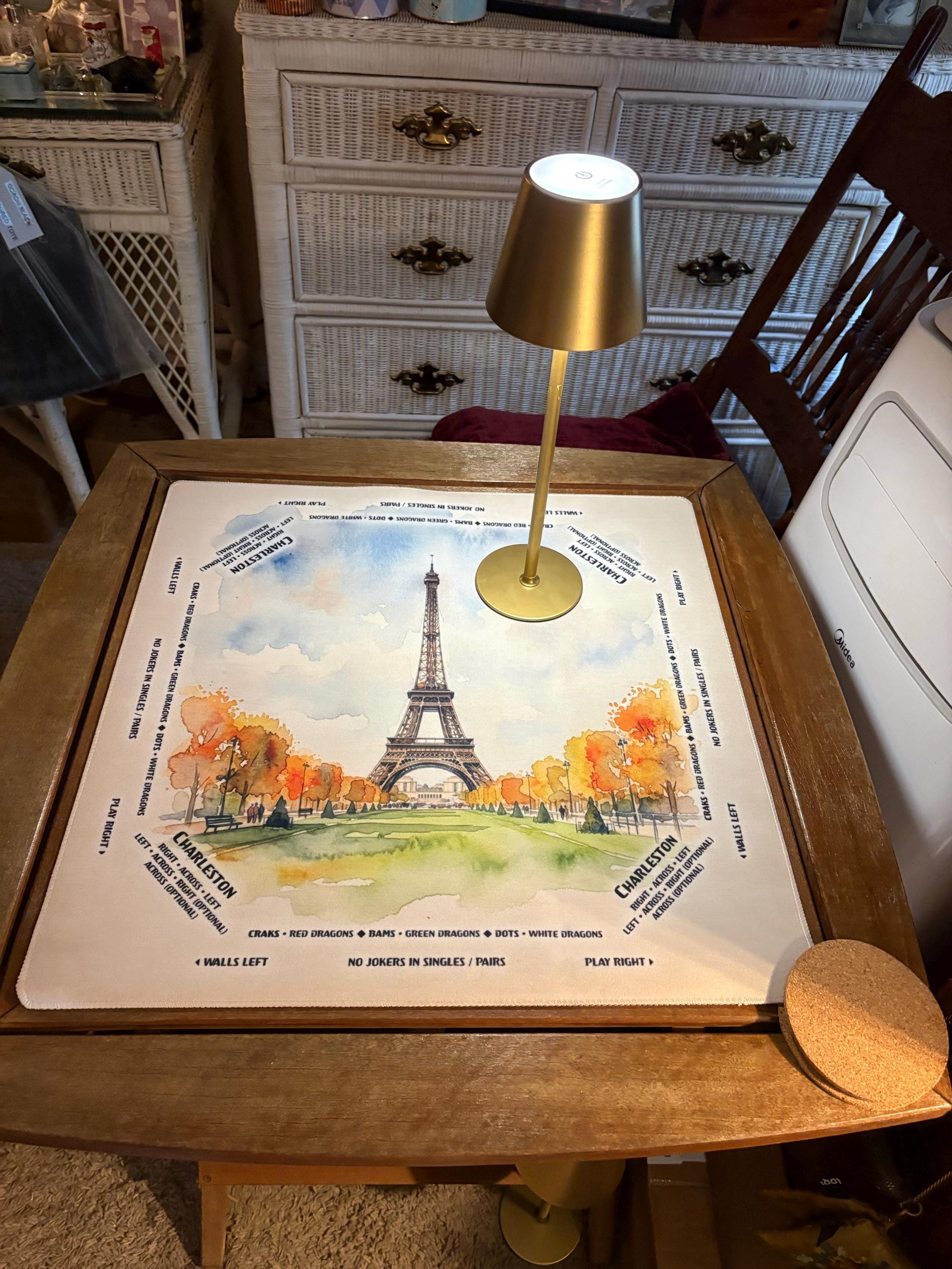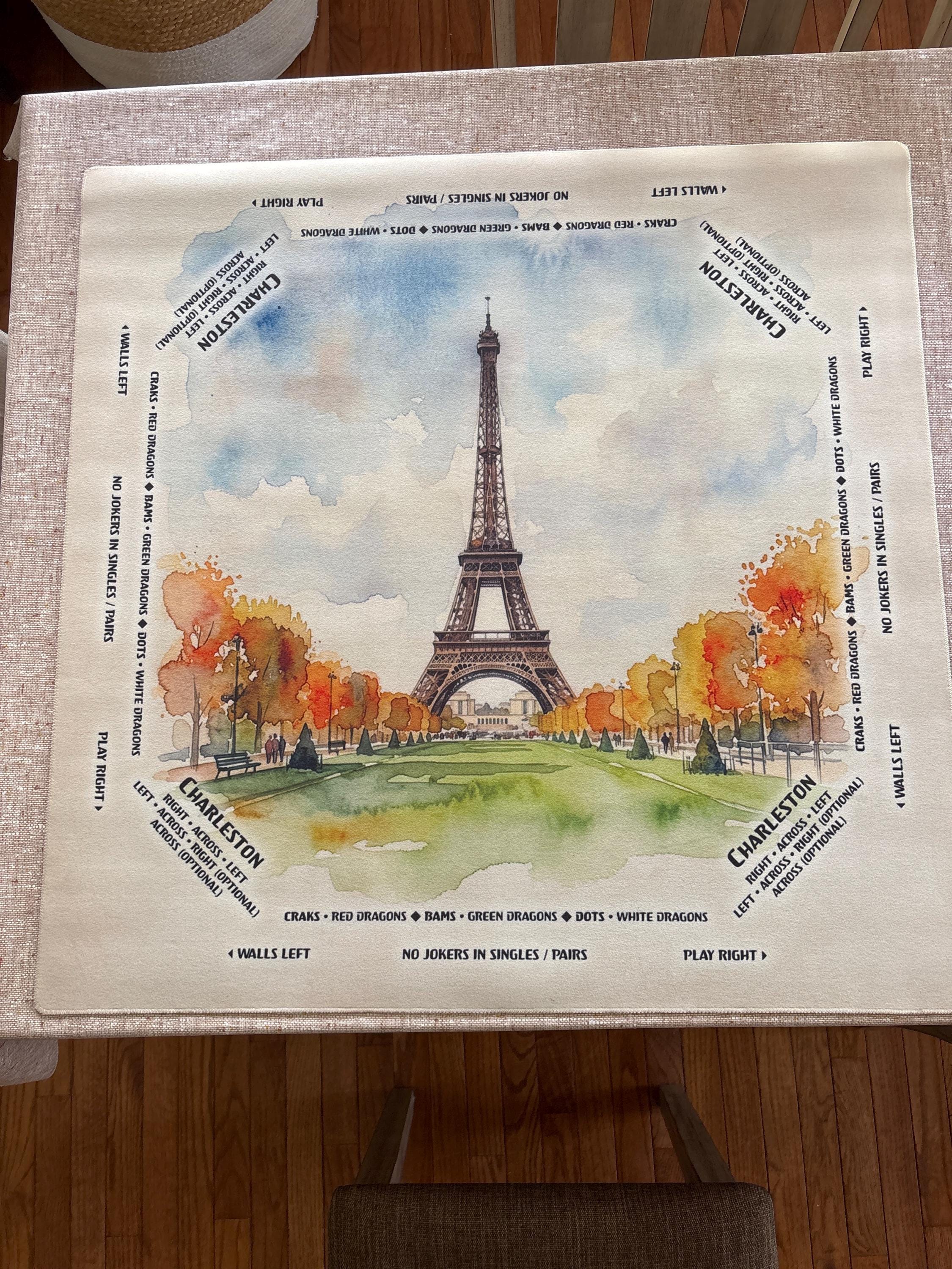 This custom mahjong mat was even more beautiful in person! Itโs very unique with the water colors and the Eiffel Tower. It looks like a painting. 10/10 highly recommend. I gave it to my friend as a gift and she was thrilled!