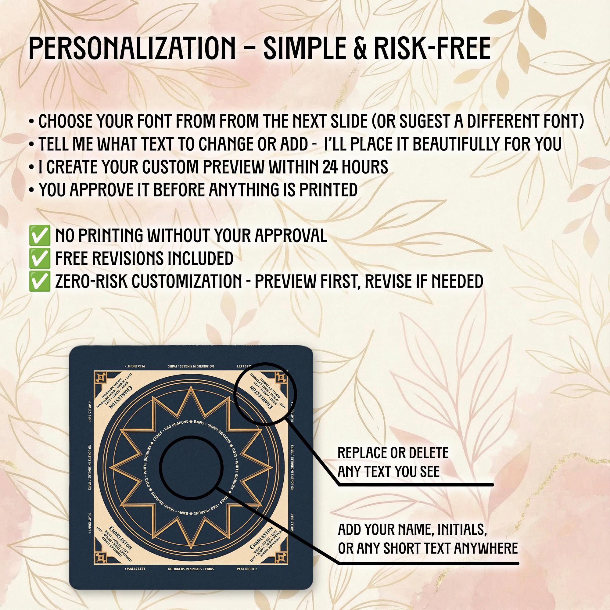 Our shop is dedicated to creating thoughtful, high-quality accessories that enhance your gaming moments. Each personalized Mahjong mat is carefully crafted with attention to detail and shipped promptly to bring joy to your game nights and special occasions.