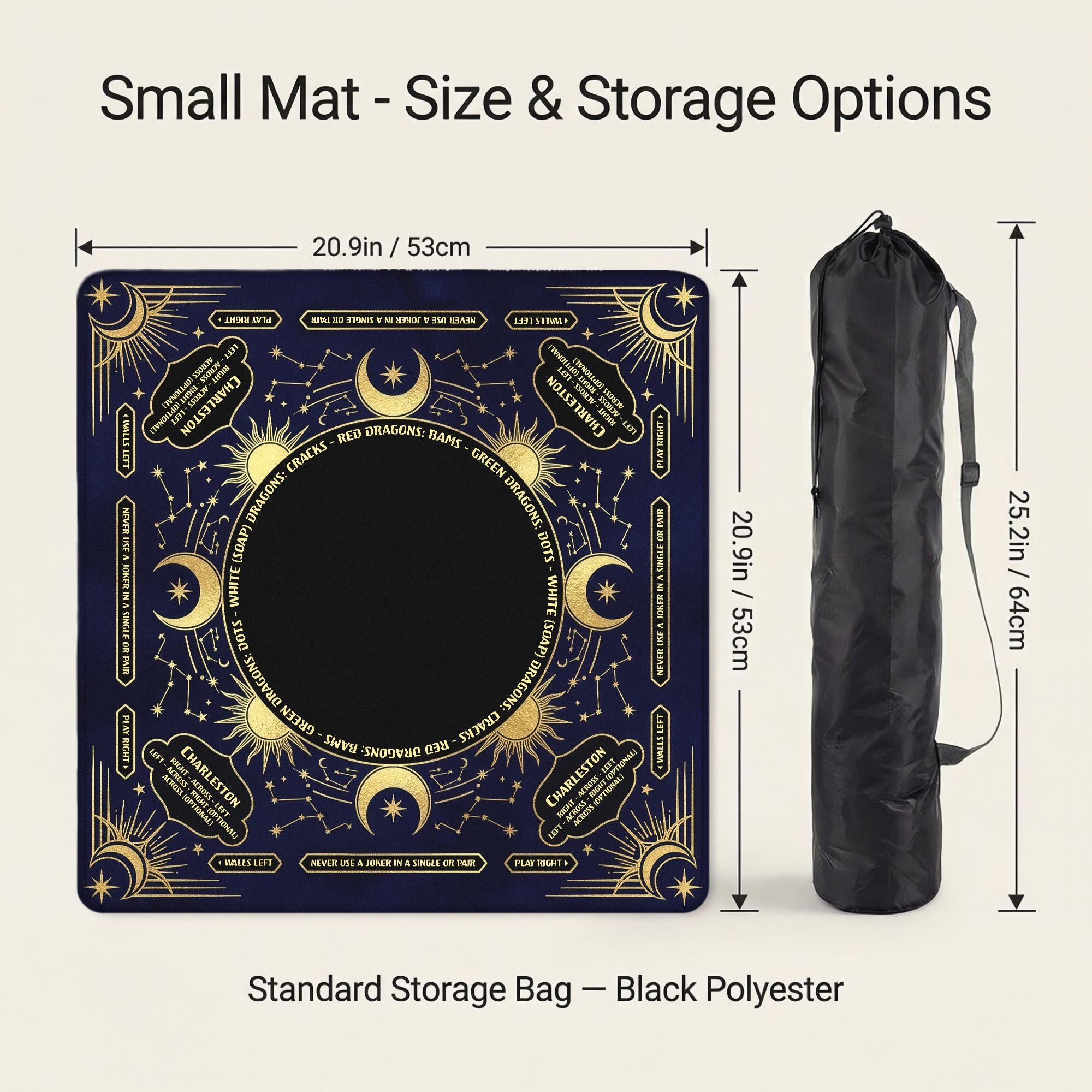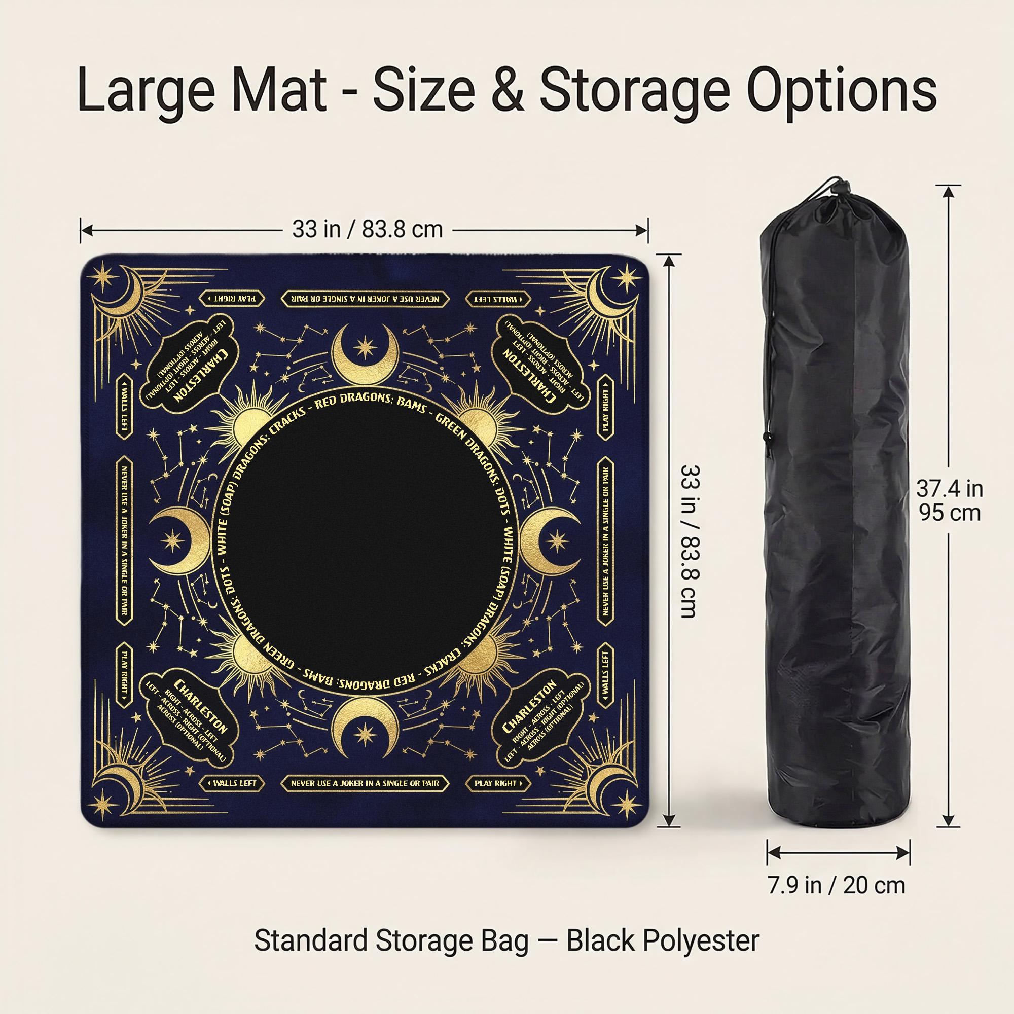 Elevate your game nights with this elegant mahjong mat, where a celestial navy gold design meets thoughtful functionality. Crafted with a soft polyester top and non slip rubber backing, this mat ensures a smooth, noise reducing surface perfect for any mahjong player gift or casual game night. Its custom personalization option adds a unique touch, making each game feel truly special.