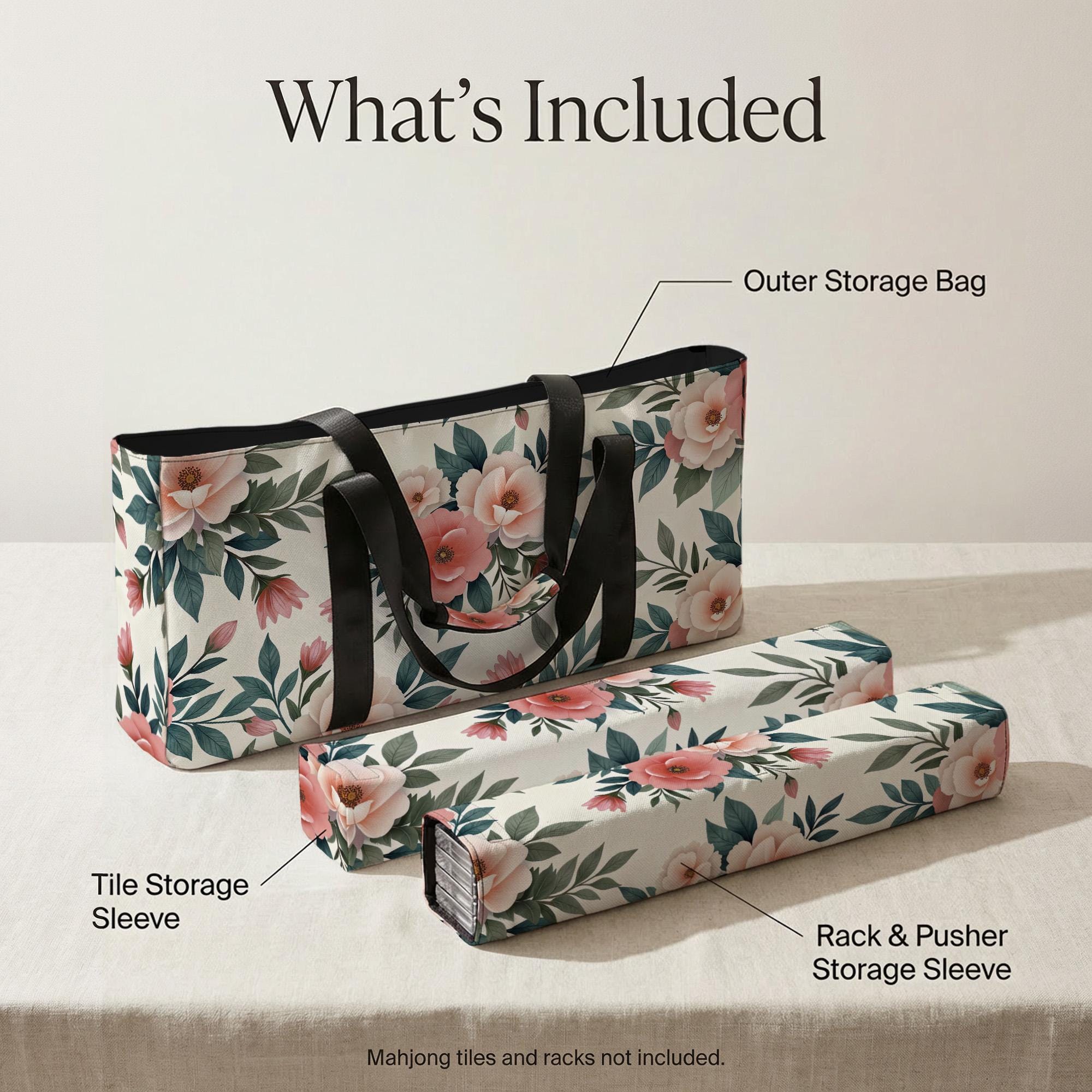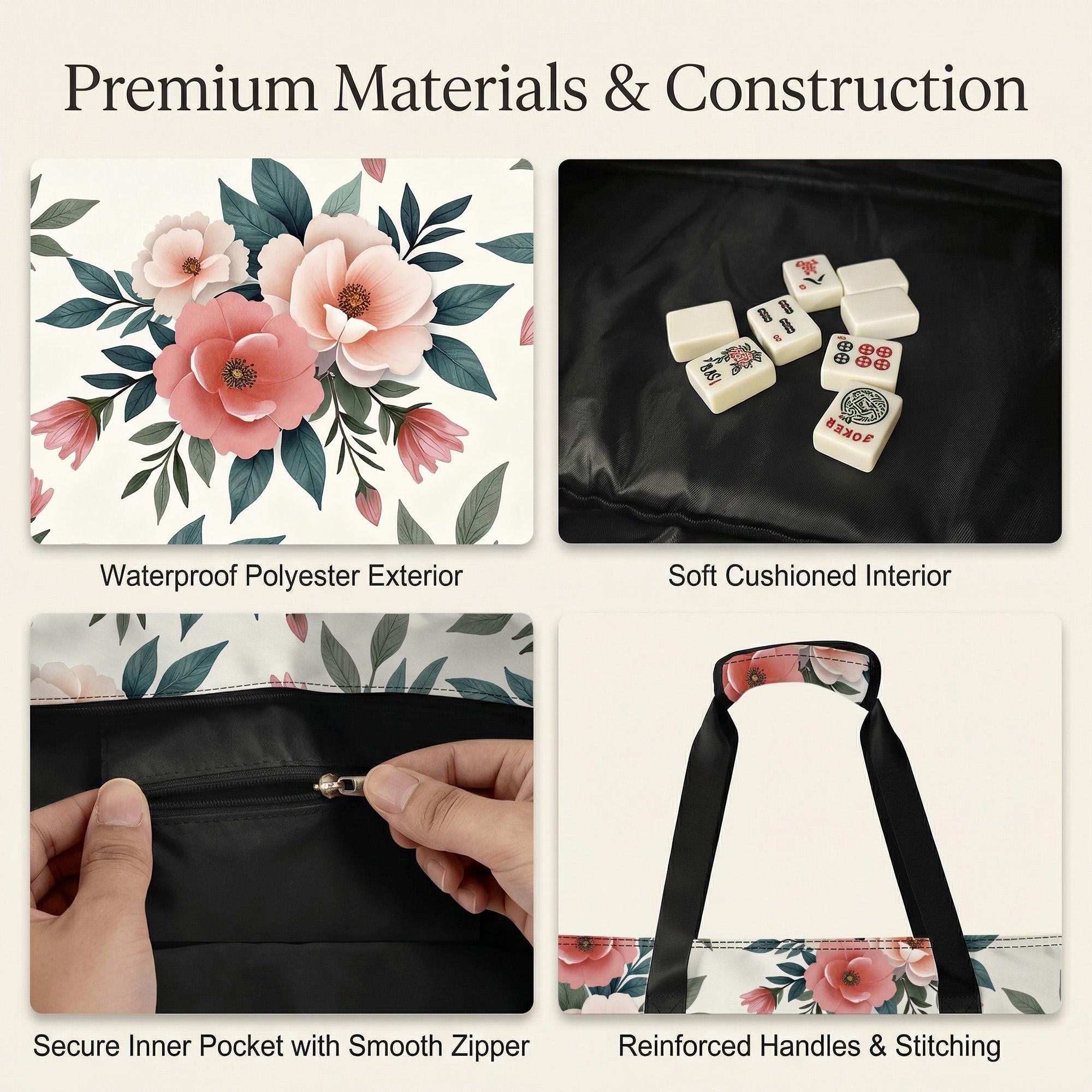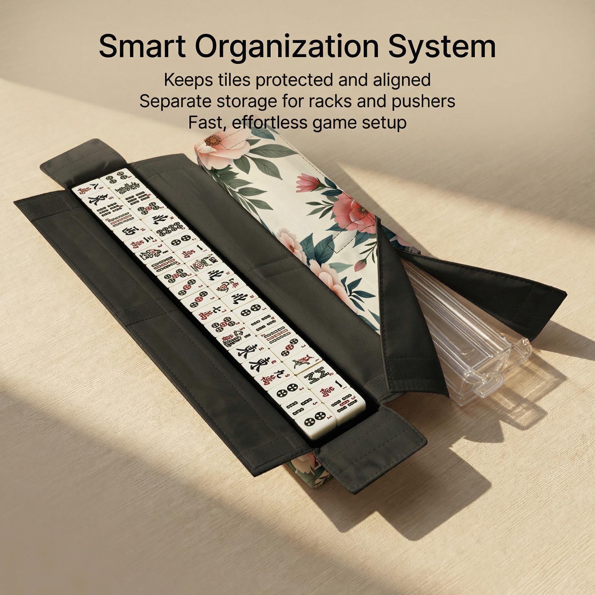 Elevate your mahjong experience with this beautifully designed mahjong storage bag set, perfect for travel-friendly organization and seamless game nights. Crafted with care, the floral-patterned organizer elegantly protects your tiles, racks, and pushers while adding a chic touch to your gaming essentials. Whether youβre heading to a club or hosting at home, this durable mahjong storage bag ensures quick game setup and stylish portability.