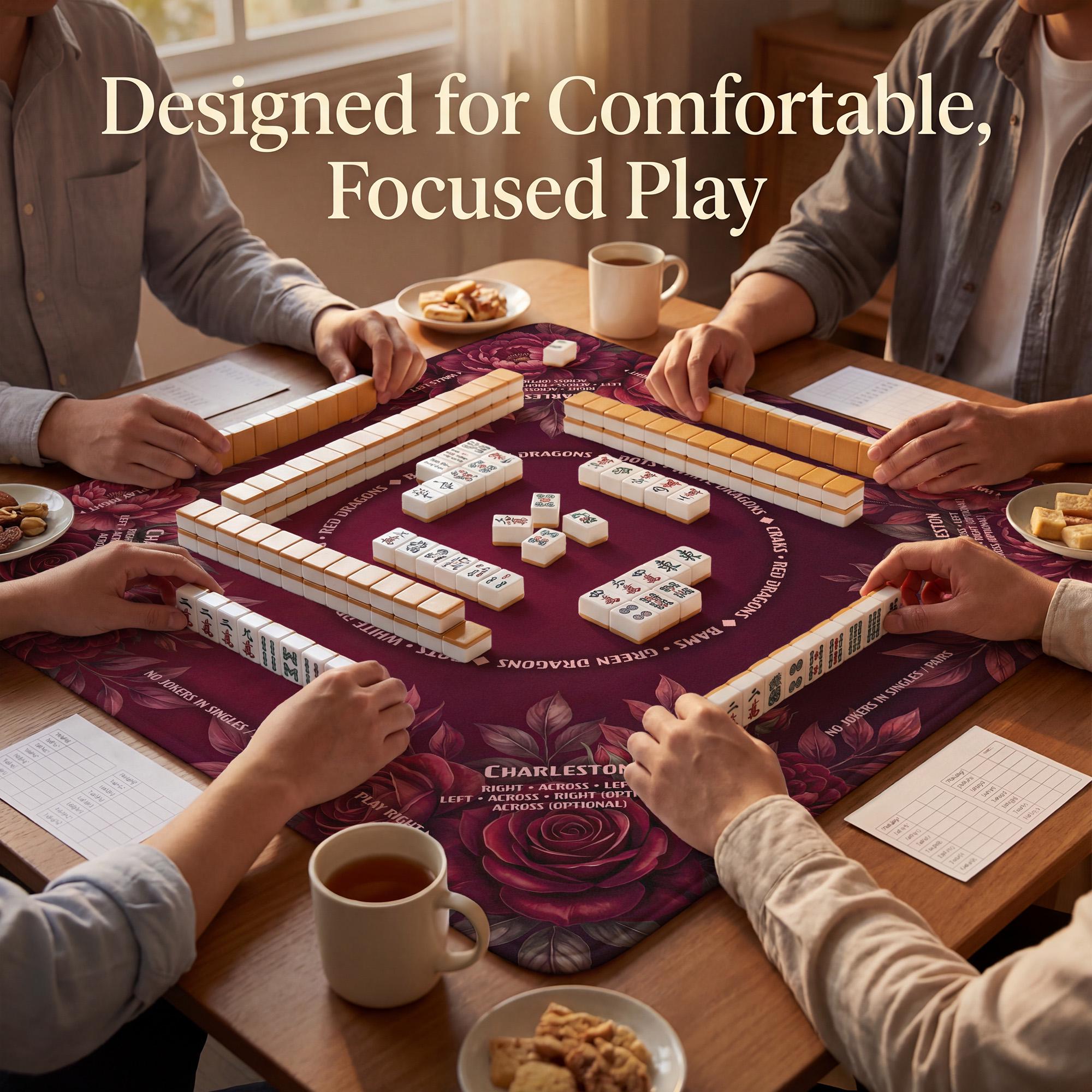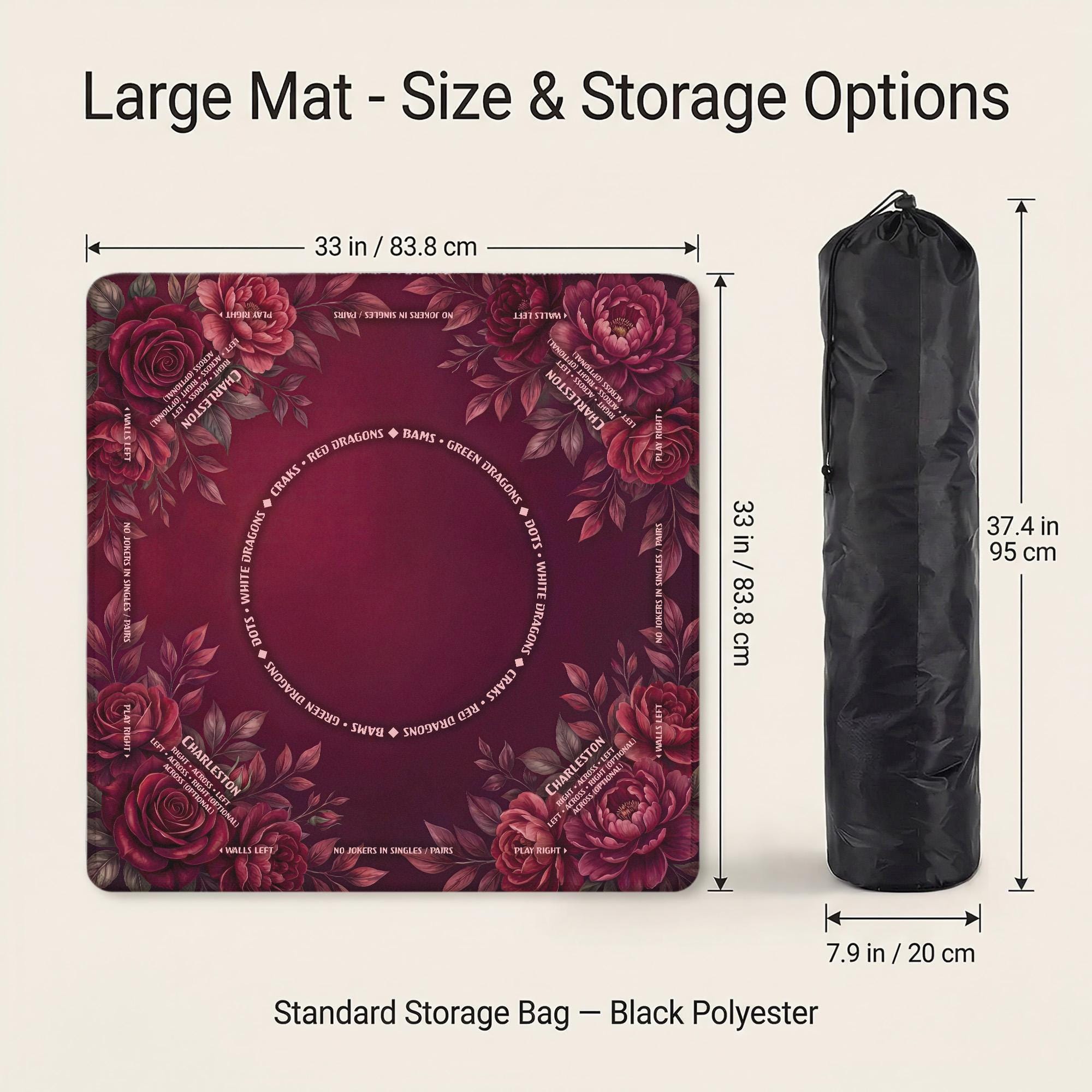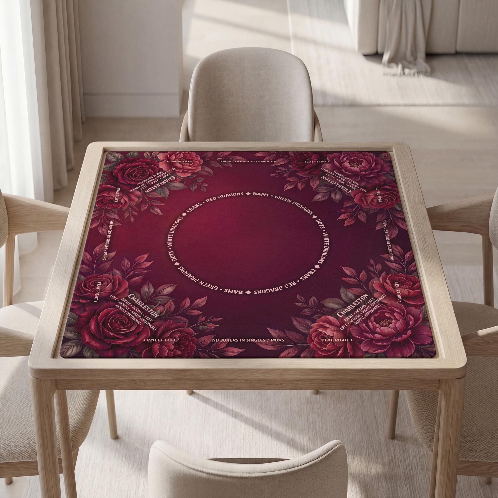 Rich burgundy floral mahjong mat with roses, designed for smooth, quiet play with a non-slip backing, waterproof surface, and optional personalization. Available in multiple sizes and thicknesses, each mat lays flat, reduces tile noise, and includes a storage bag for elegant game nights anywhere.