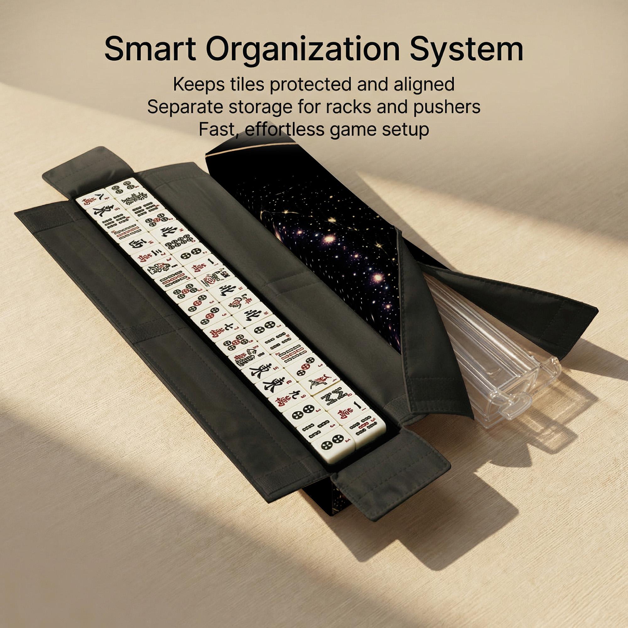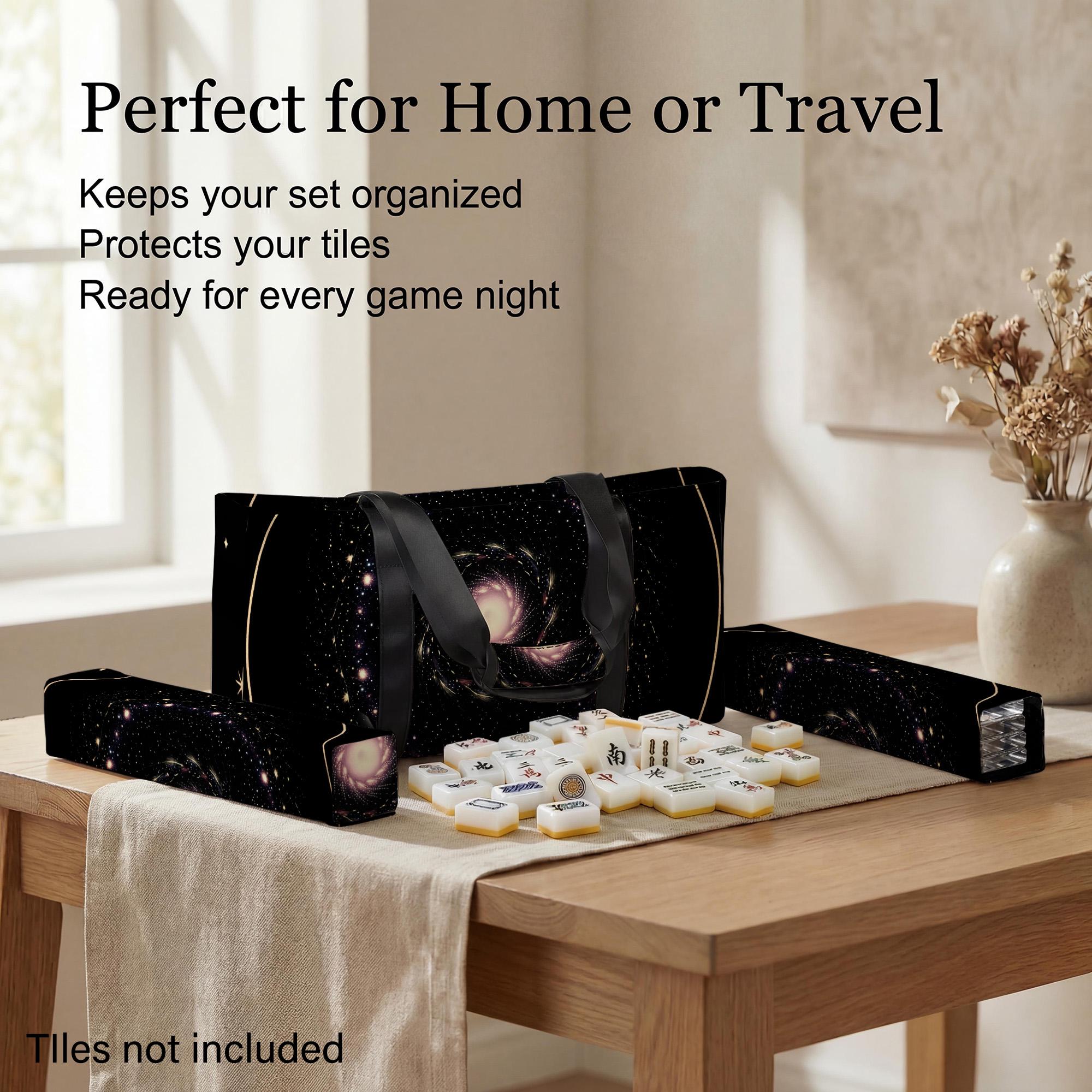 Upgrade your game night with this complete mahjong storage system featuring a waterproof outer carry bag, dedicated tile sleeve, and separate rack & pusher storage for smart organization and protection. Designed to fit standard mahjong sets, this lightweight yet structured travel case keeps everything aligned, secure, and ready for effortless setup at home or on the go.