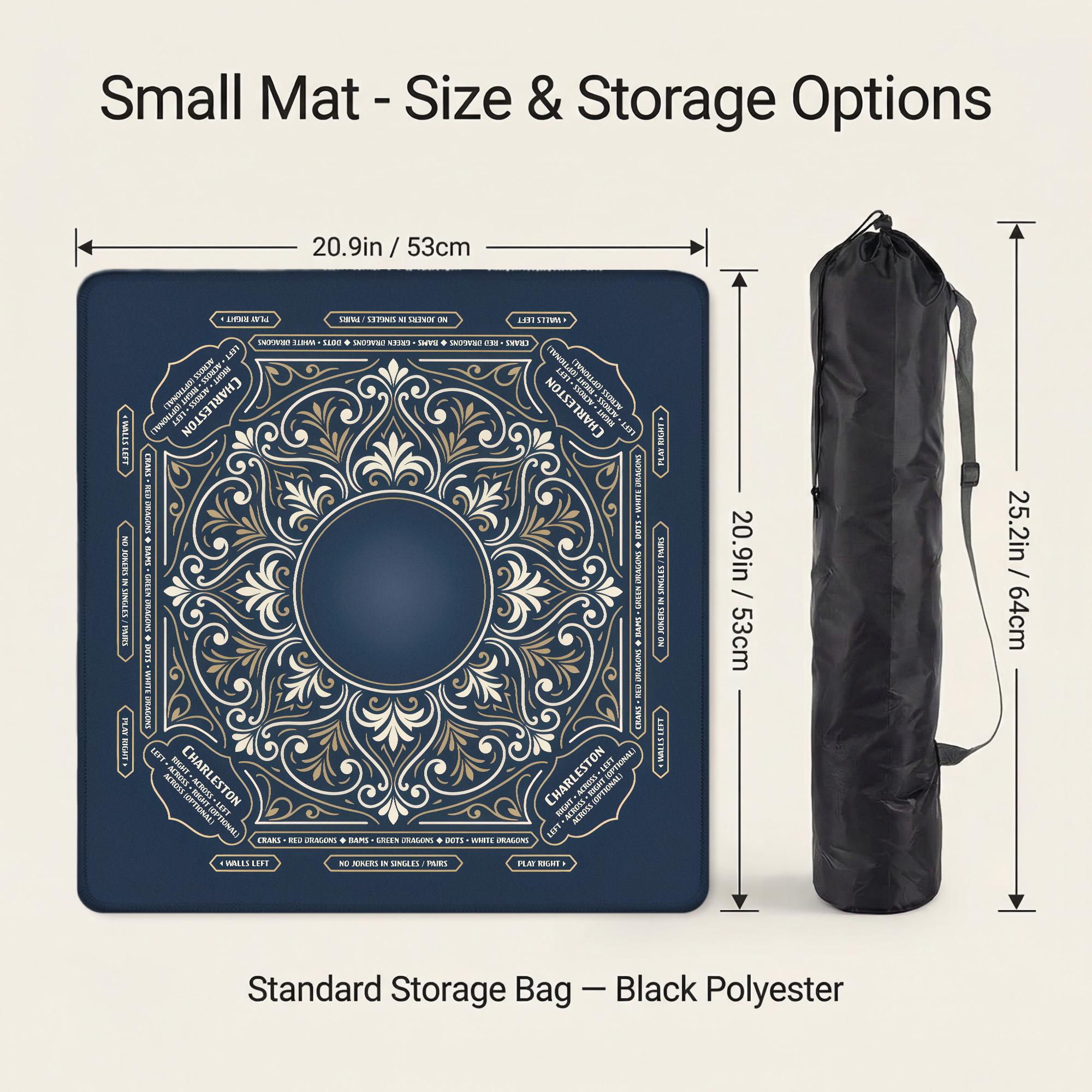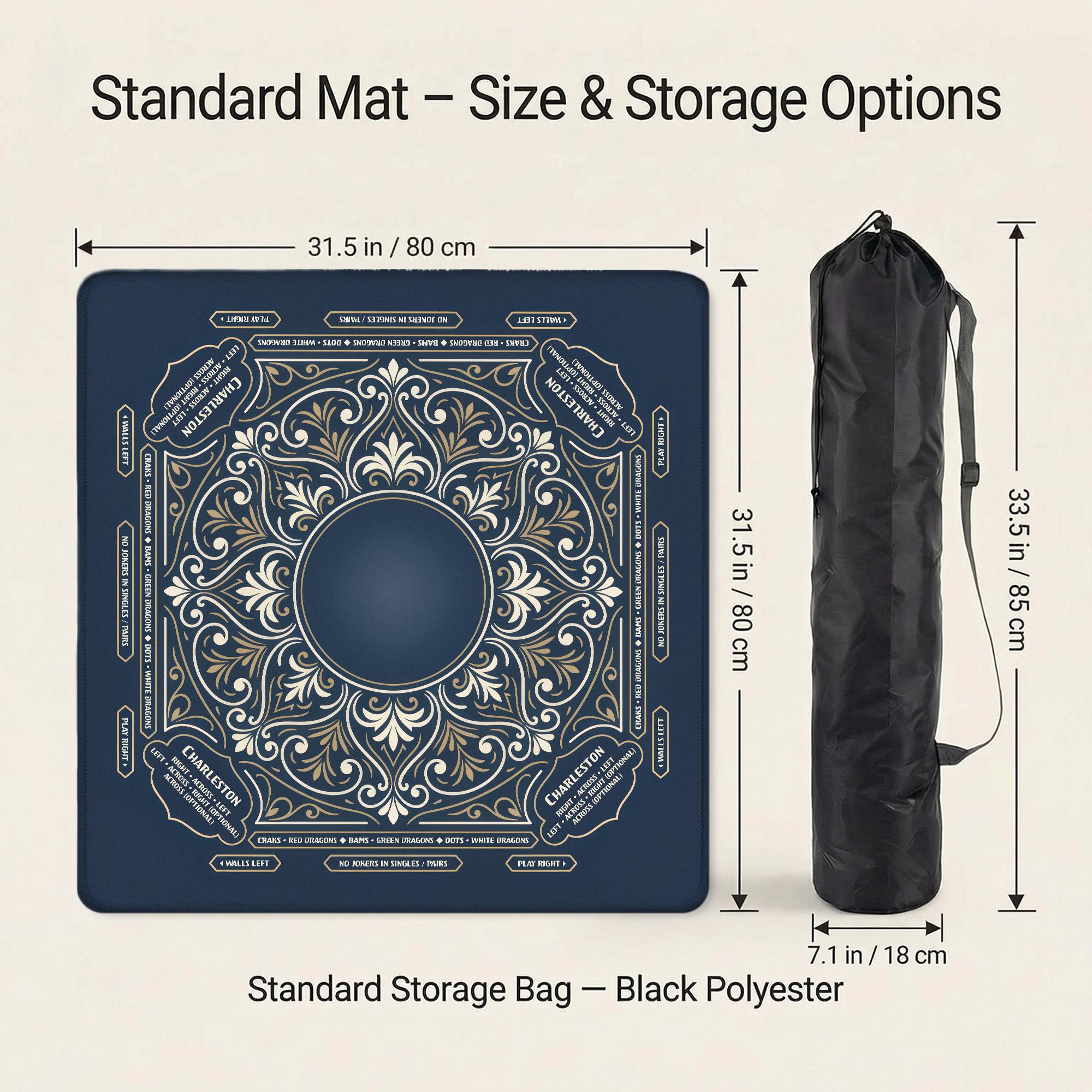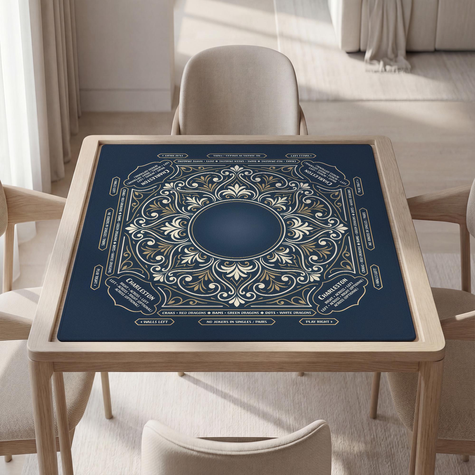 Elegant navy and gold American mahjong mat designed for smooth, quiet play with anti-slip backing and optional personalization. Choose your size and thickness, add custom text if desired, and enjoy a premium mat that rolls flat and stores easily in the included bag.
