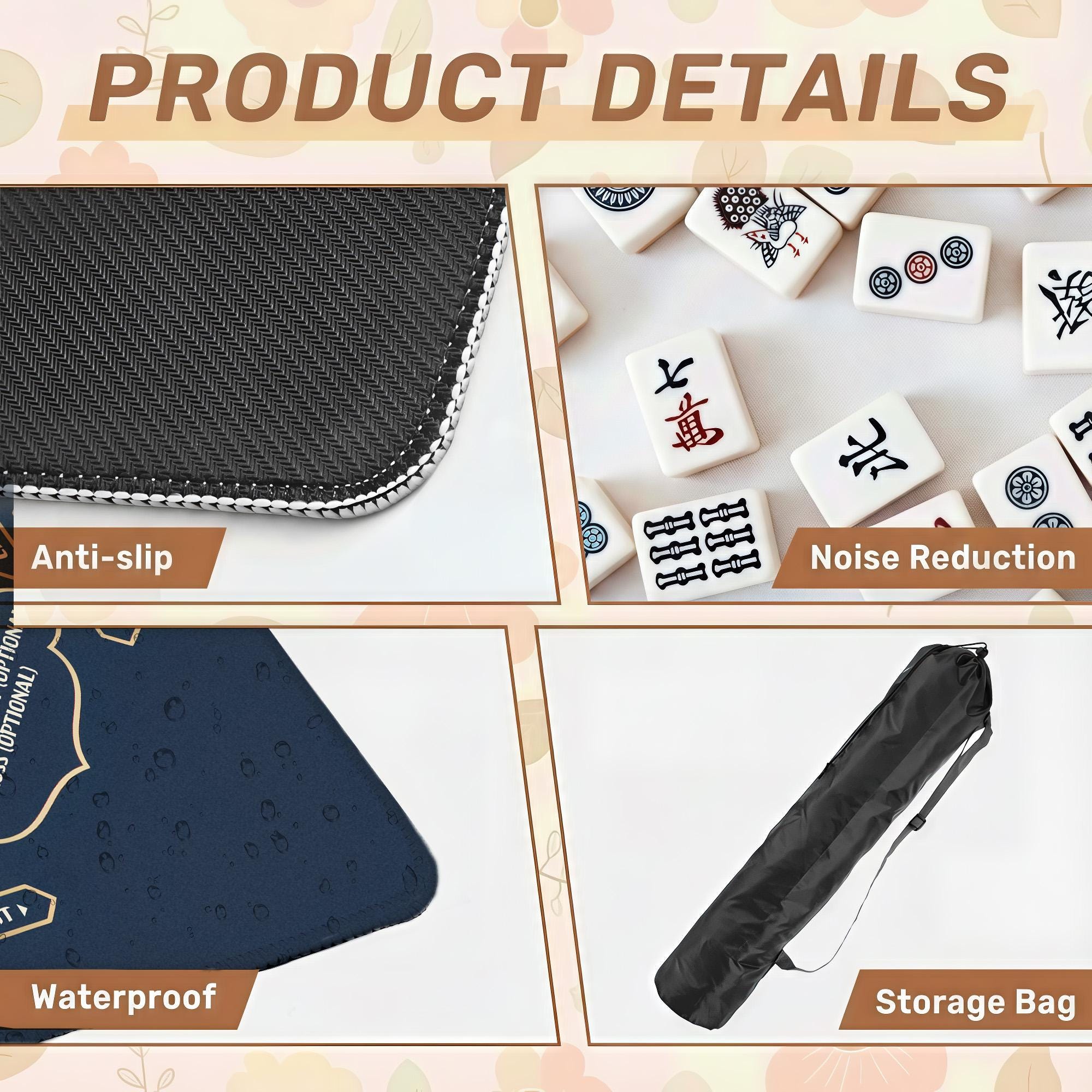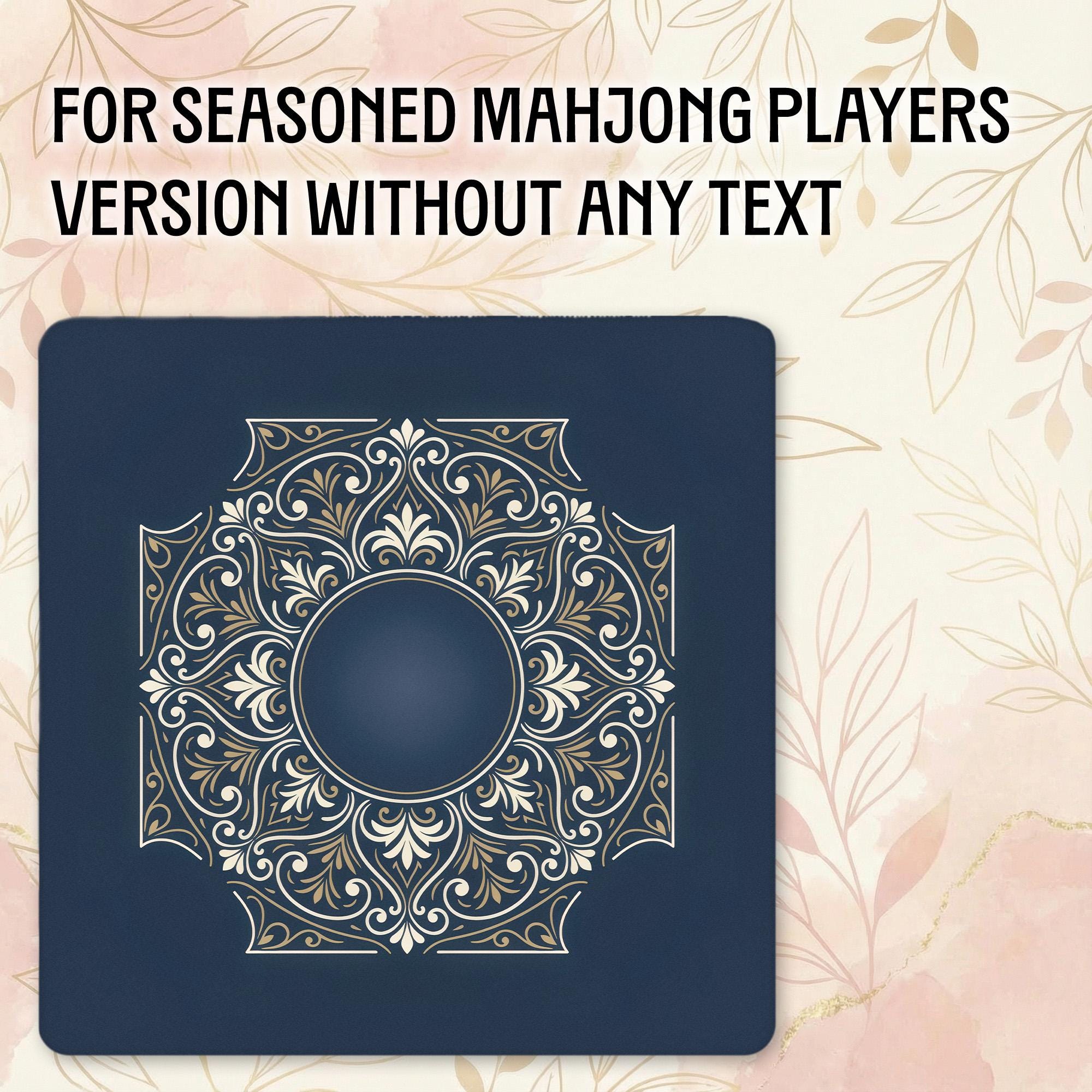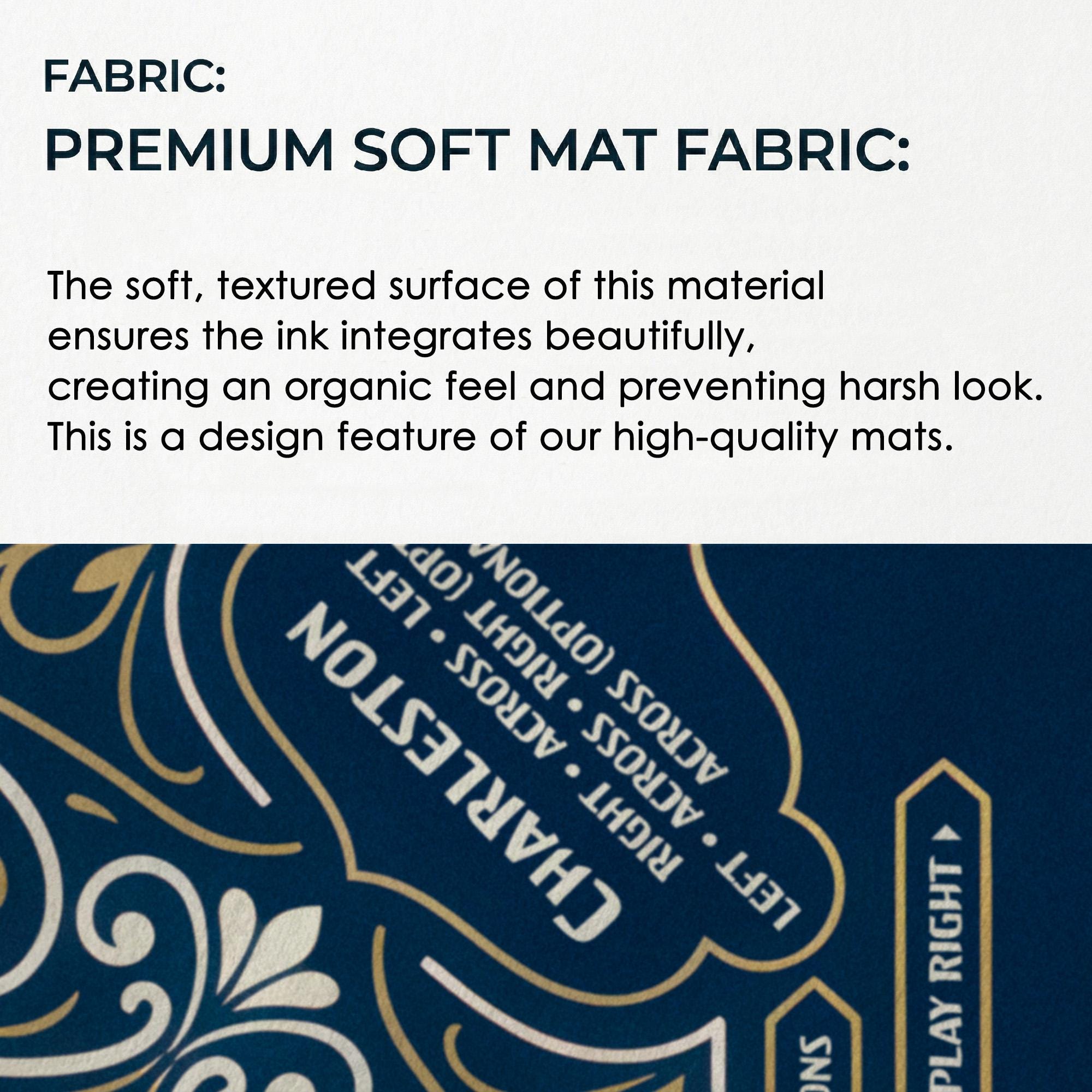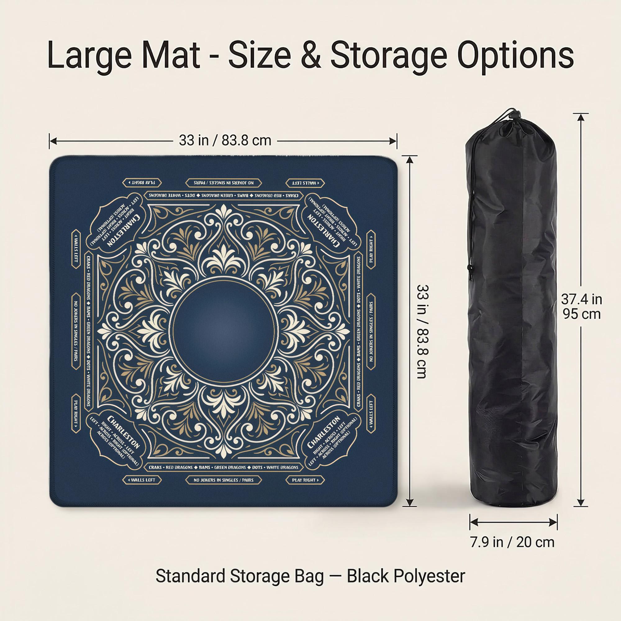 Elegant navy and gold American mahjong mat designed for smooth, quiet play with anti-slip backing and optional personalization. Choose your size and thickness, add custom text if desired, and enjoy a premium mat that rolls flat and stores easily in the included bag.