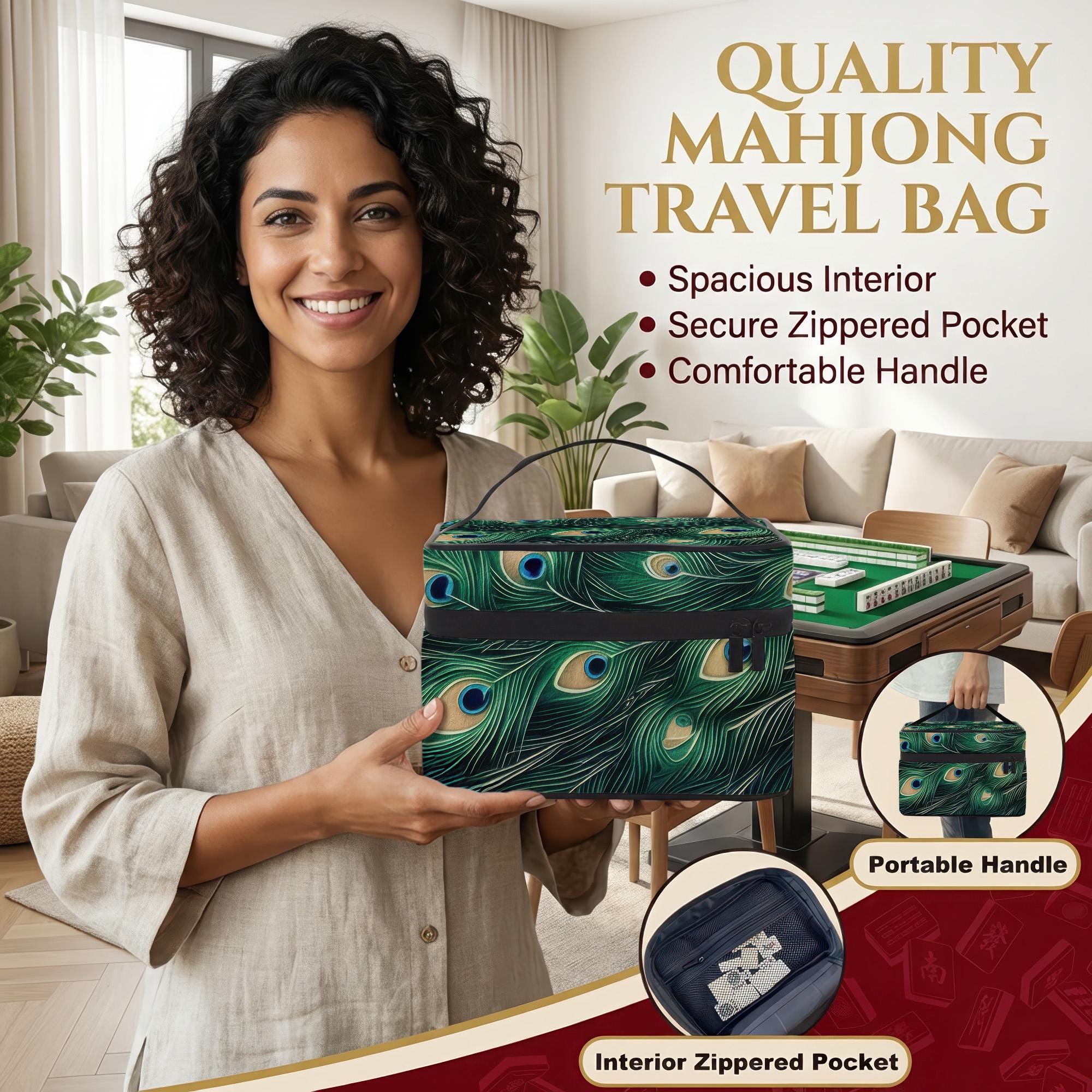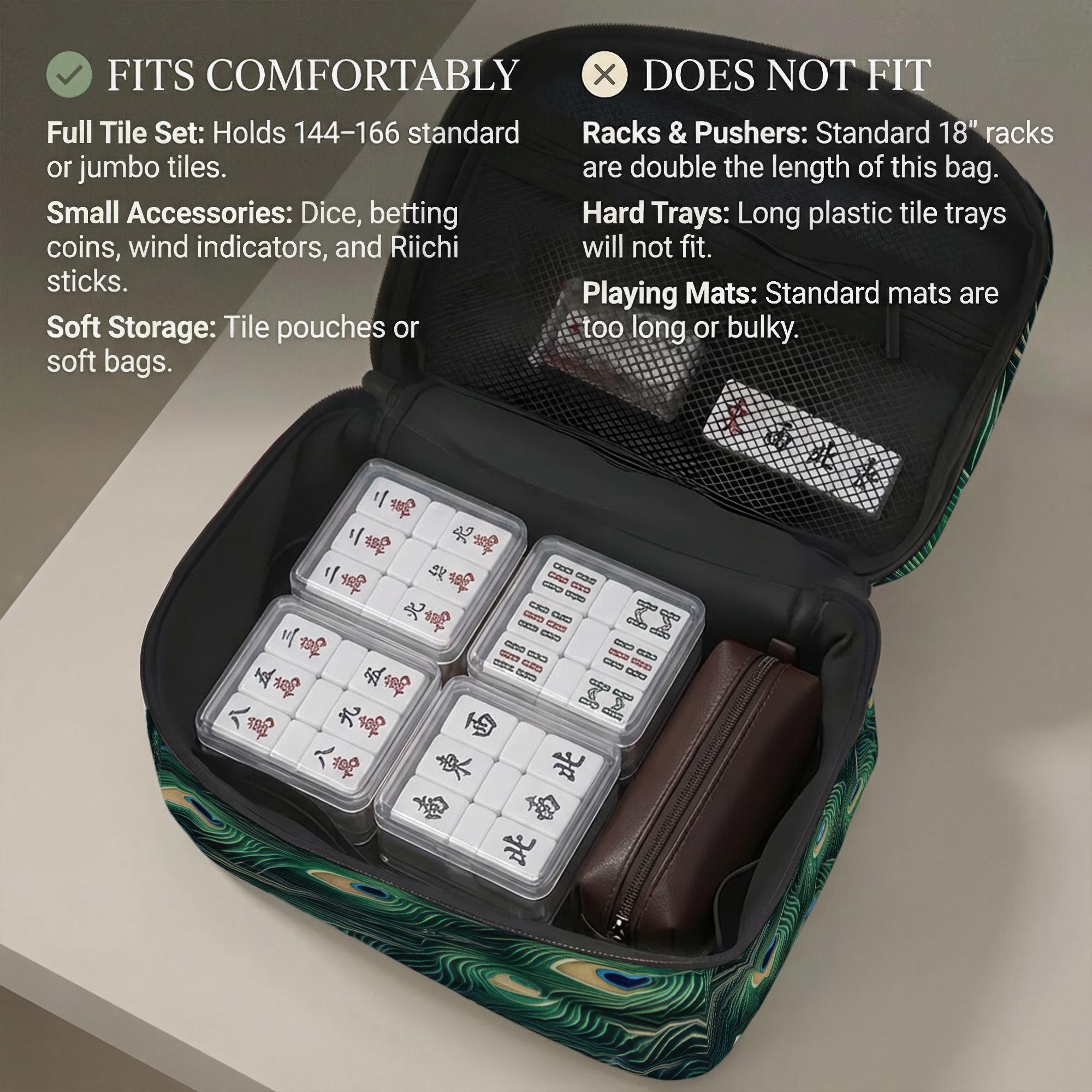 Experience the perfect blend of style and function with this peacock patterned travel bag designed specifically for American mahjong enthusiasts. Whether heading to a club game or packing for a mahjong game night, this lightweight game bag offers an elegant solution to keep your full tile set organized and secure. Crafted with care, it brings thoughtful design and durability together, making it an ideal choice for retirees, club players, and anyone who cherishes their mahjong accessories.