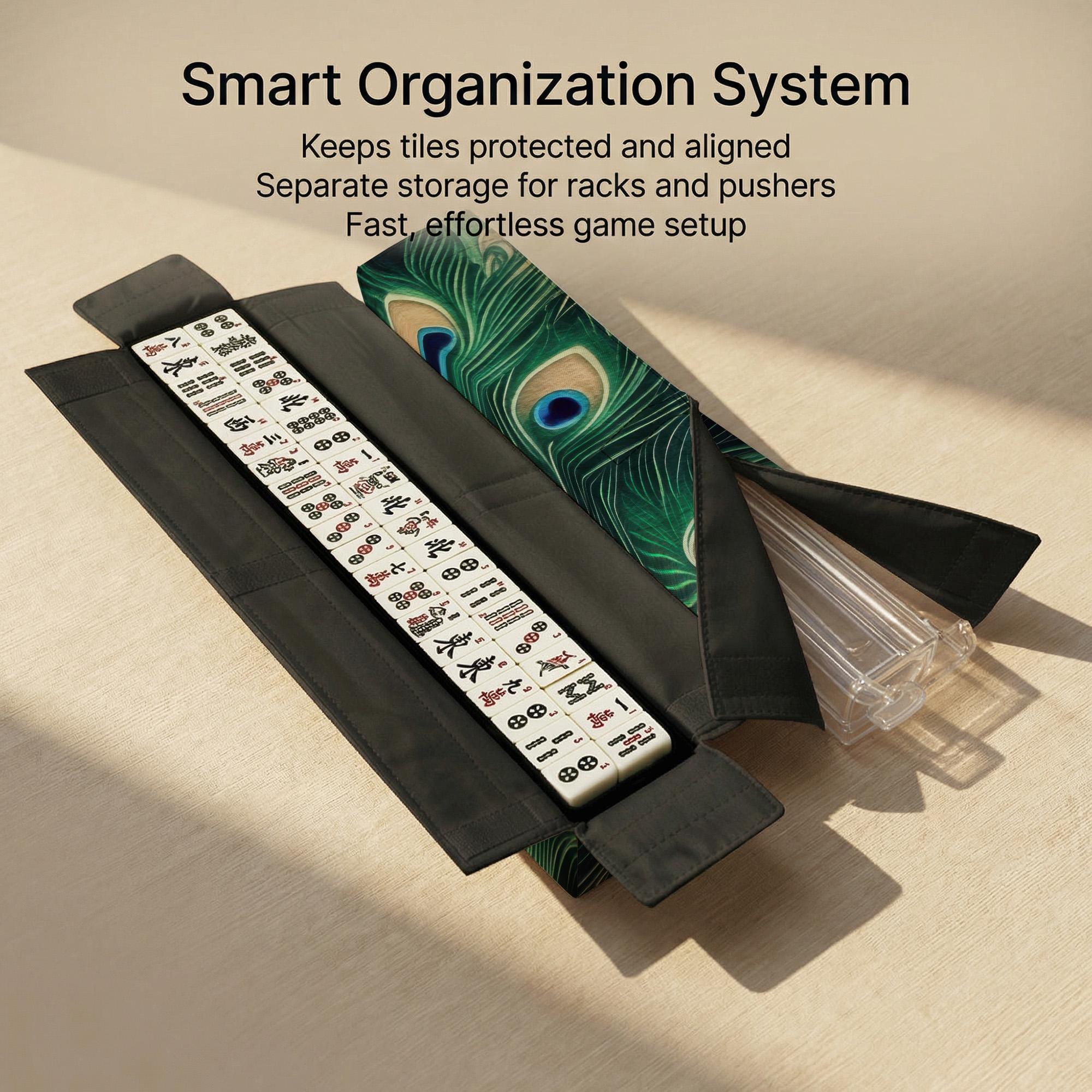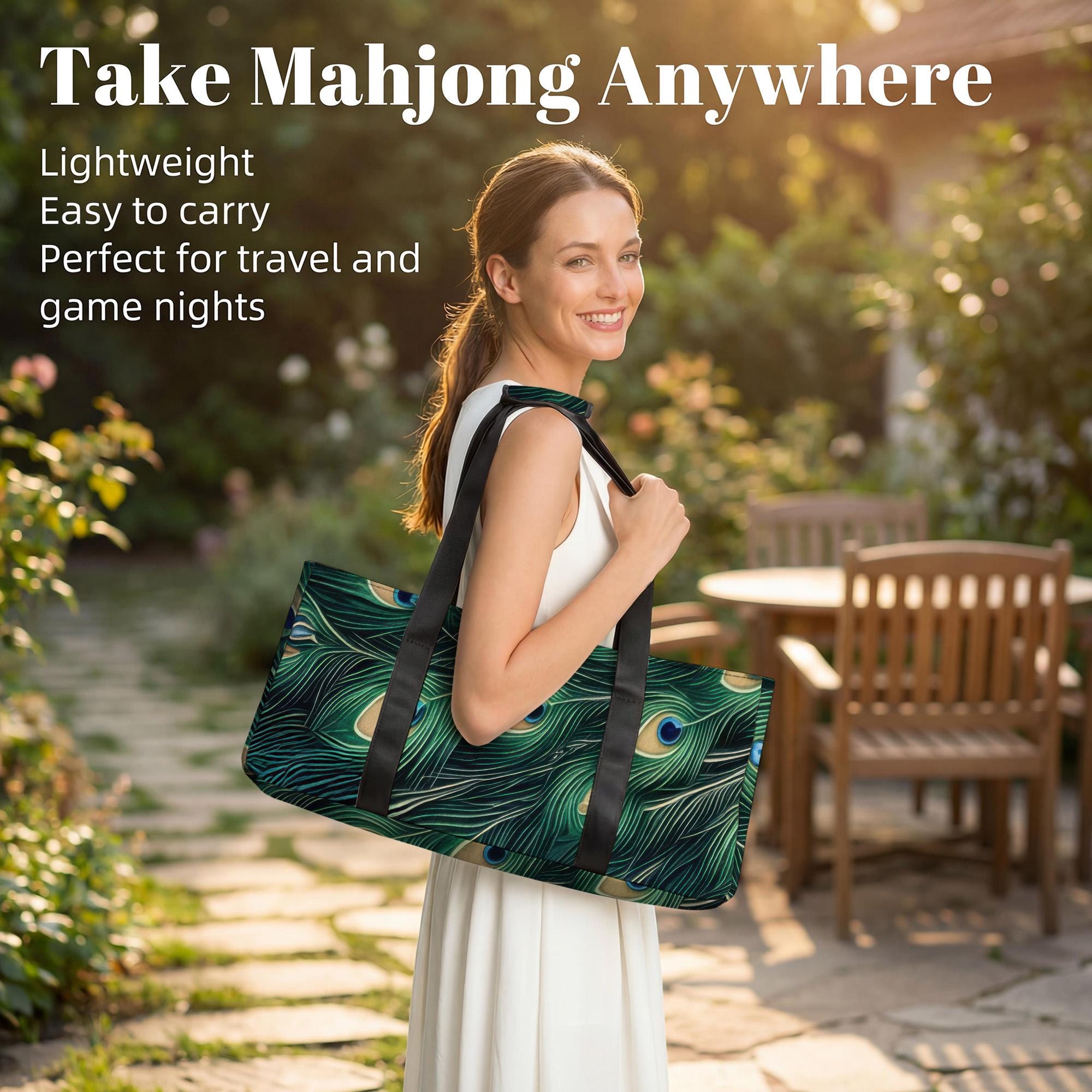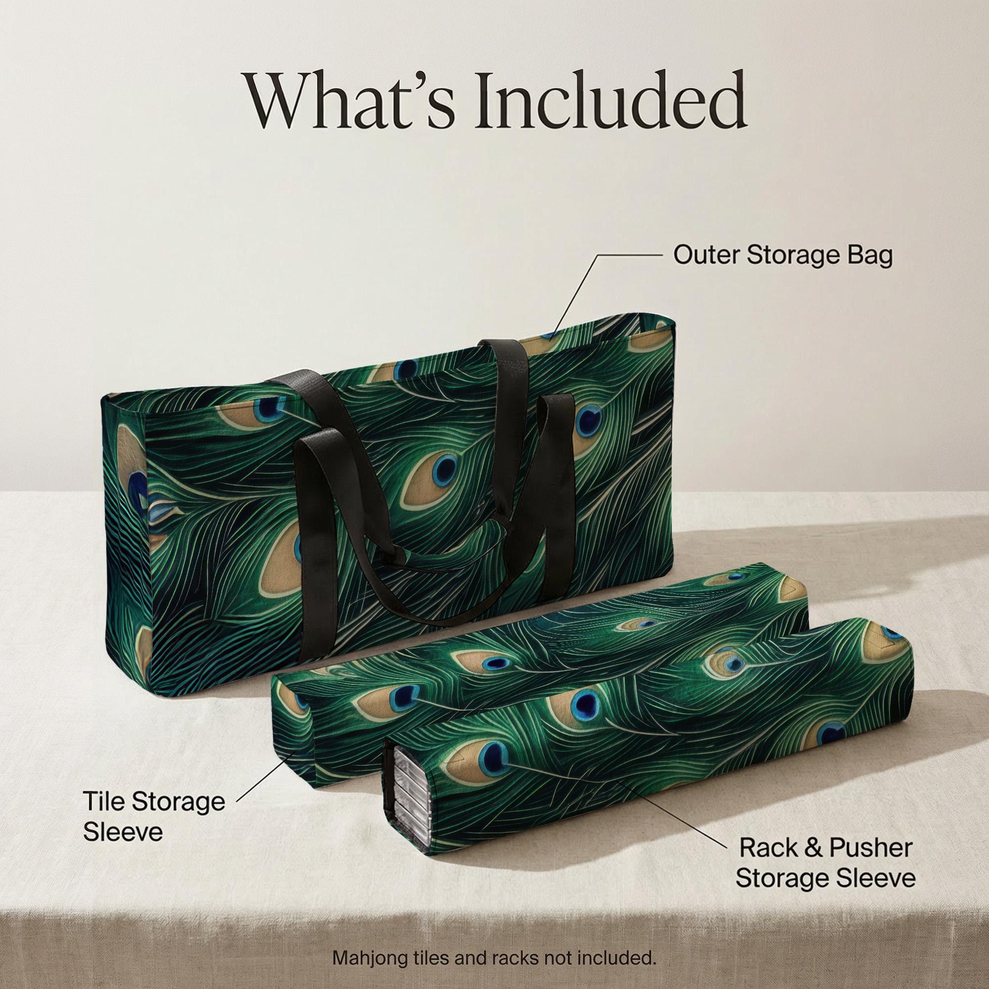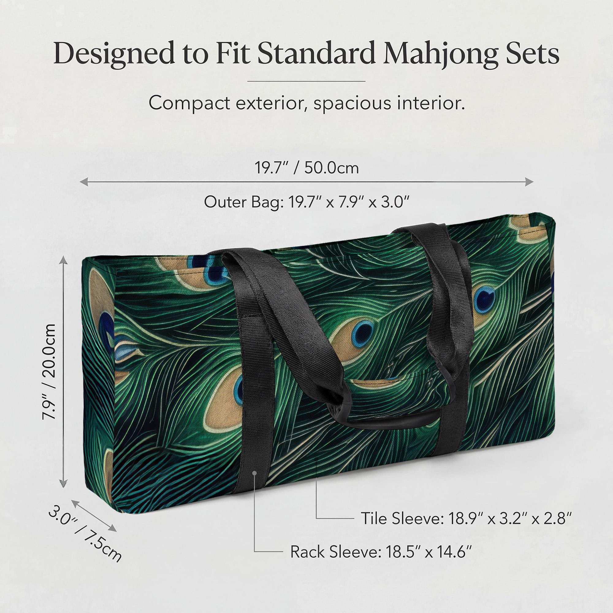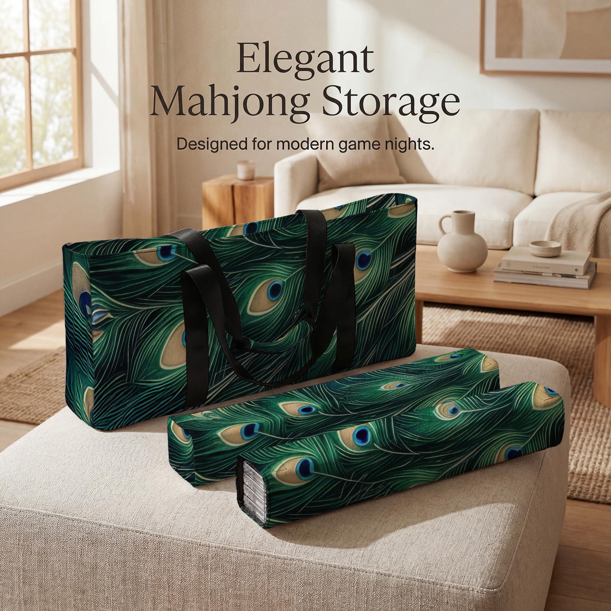 Elegant peacock-print storage set keeps your mahjong tiles, racks, and pushers organized, protected, and ready for every game night. Includes a spacious outer carry bag plus separate cushioned sleeves for tiles and racks, designed to fit standard American mahjong sets.