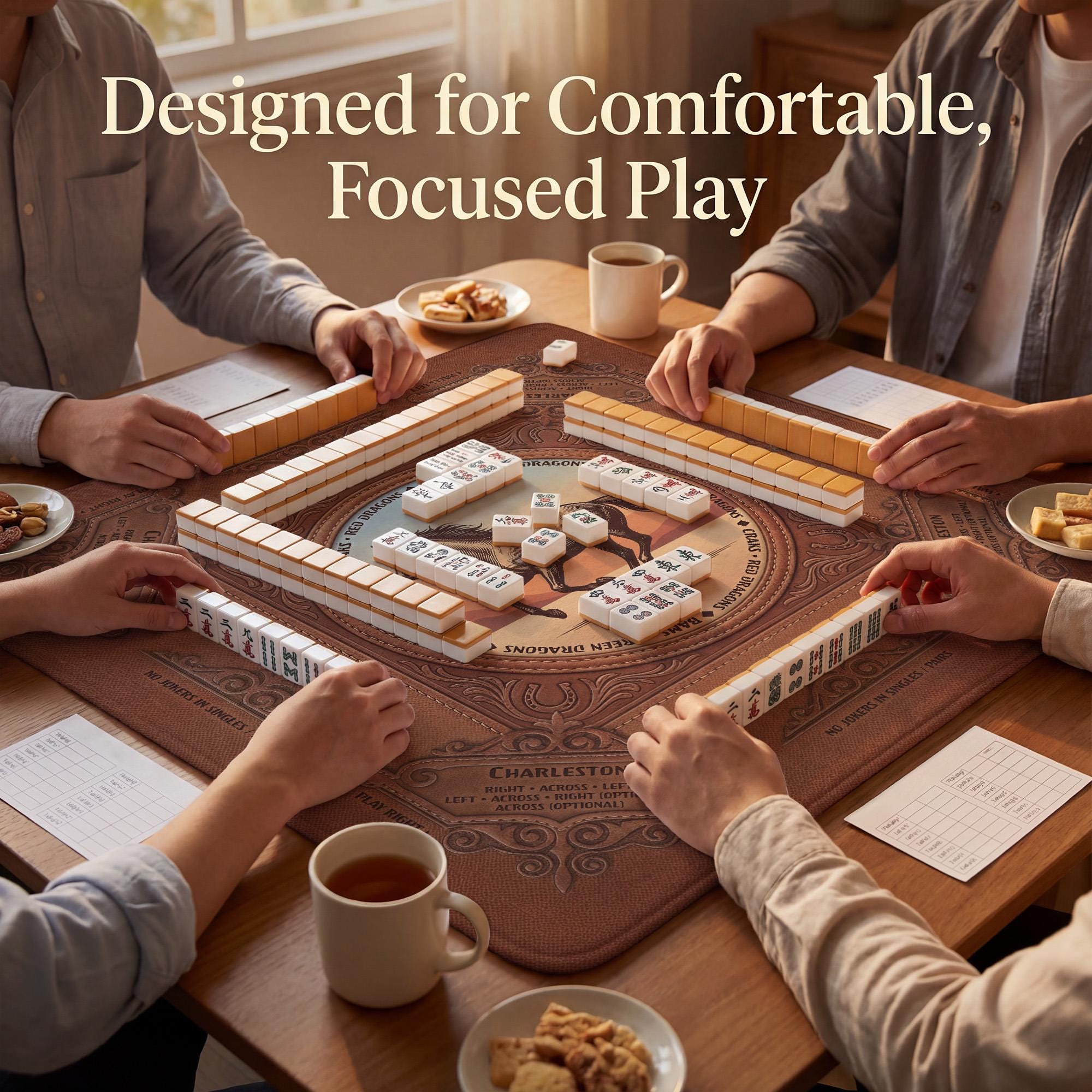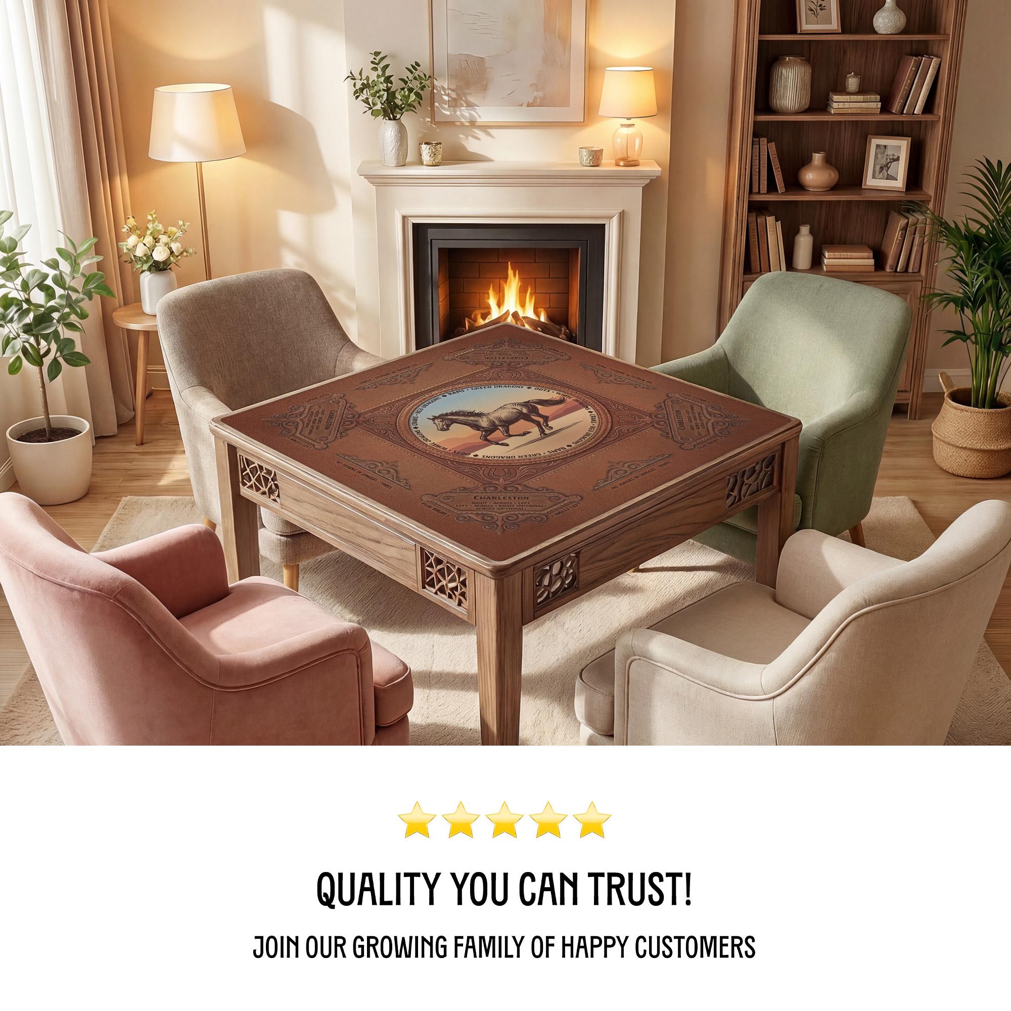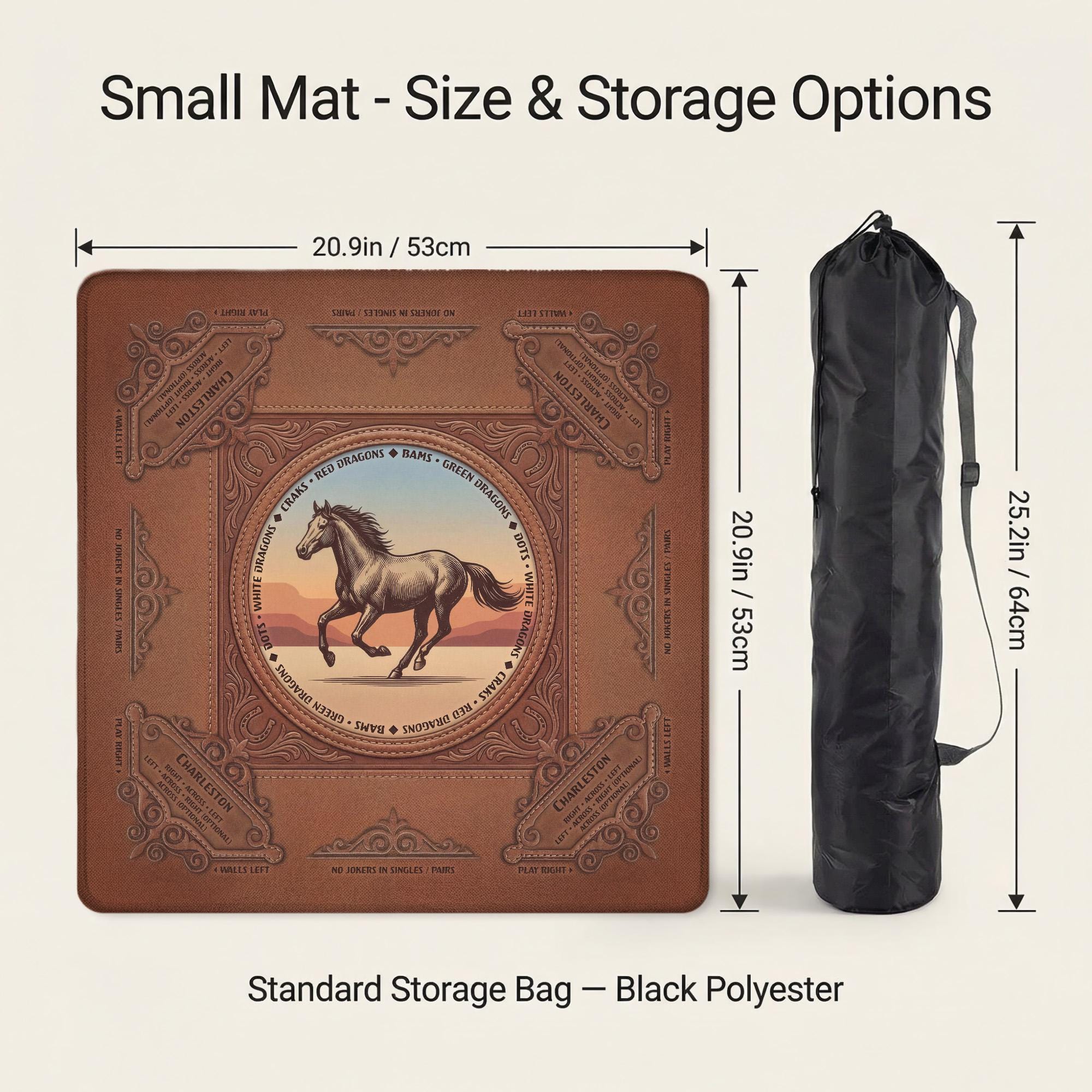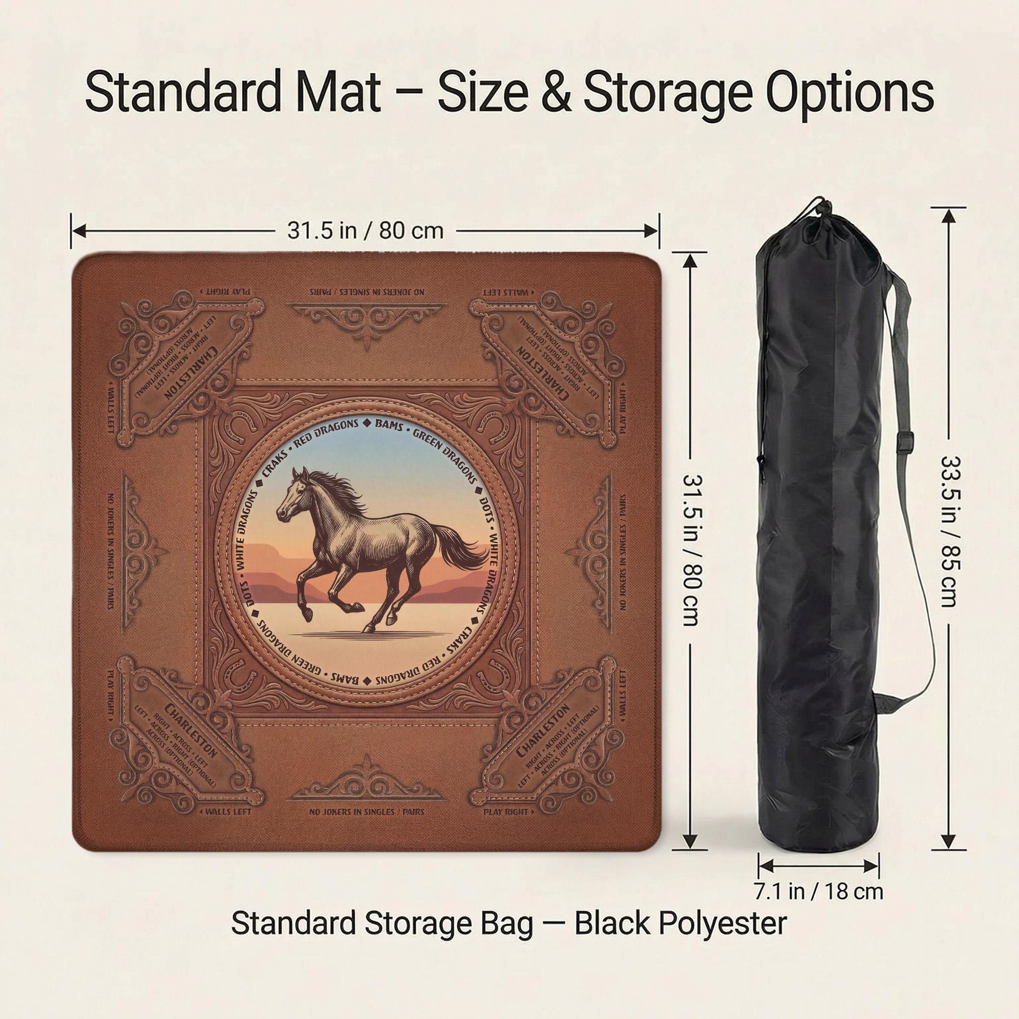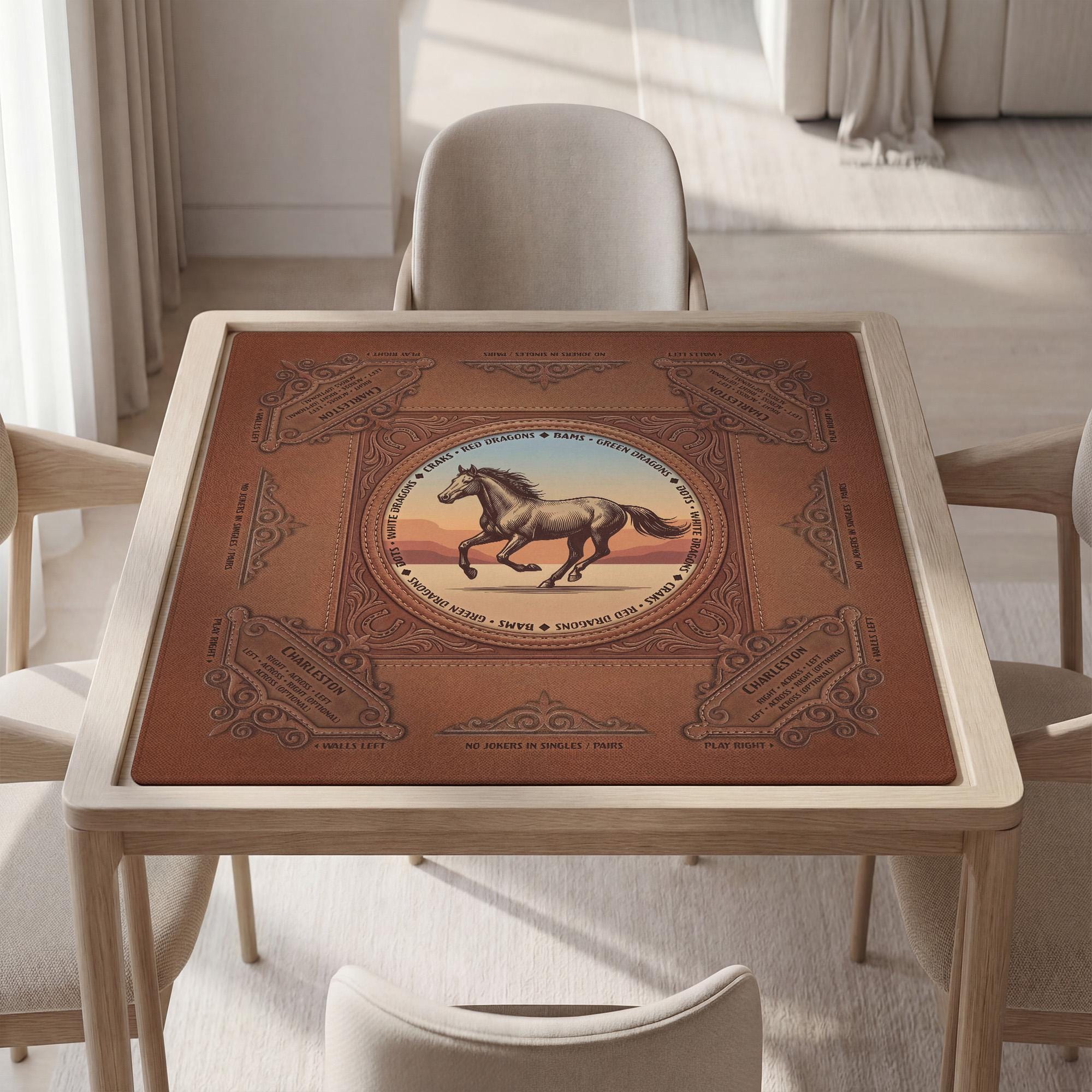 Discover the perfect blend of vintage western horse decor and practical design with this custom mahjong mat, crafted to enhance your game nights with a quiet game surface and a non slip table pad backing. Inspired by classic American mahjong traditions, this mat features a soft polyester top that reduces tile noise while providing smooth play. Whether you choose the travel size or standard size mat, each piece rolls up neatly into a convenient roll up carry pouch for easy transport.