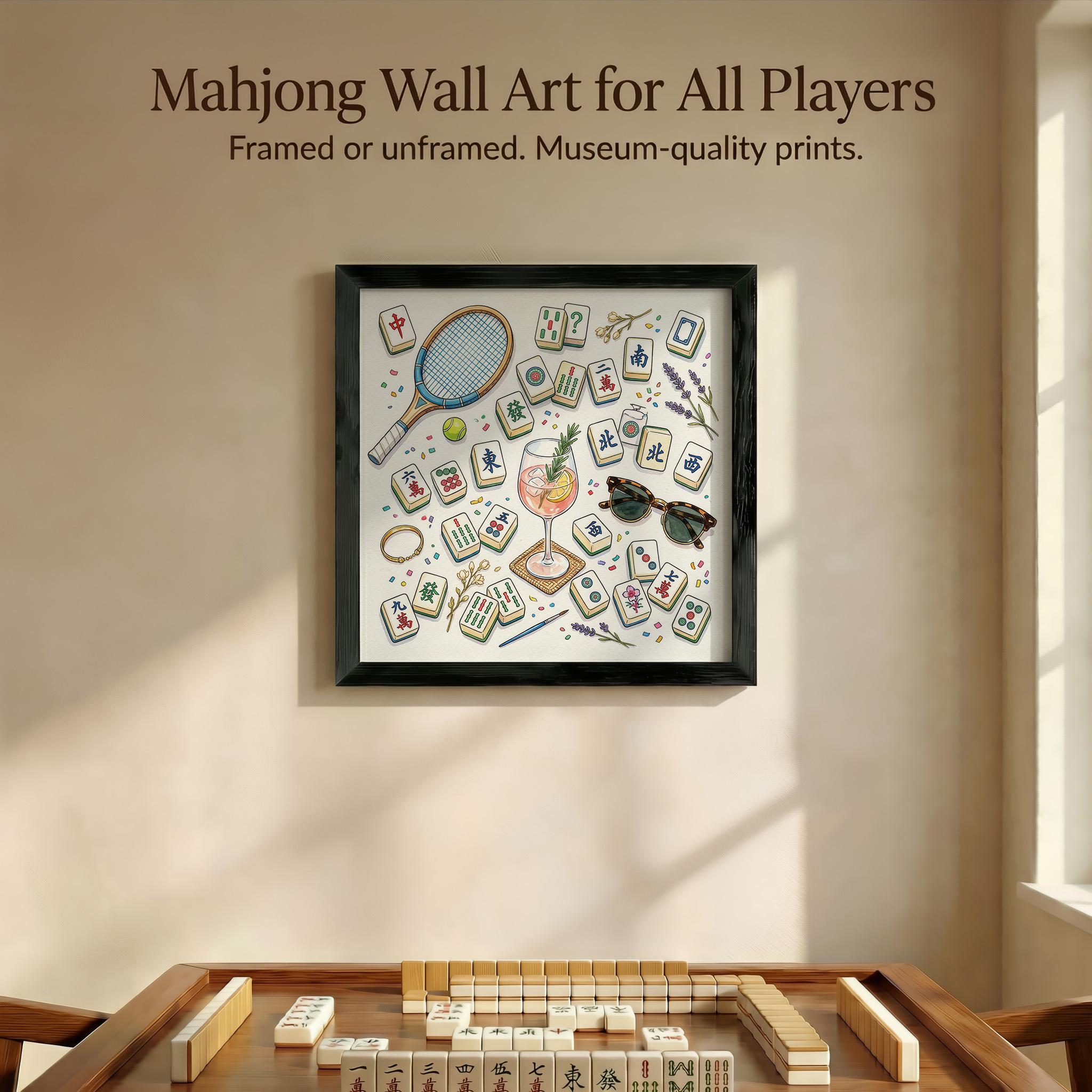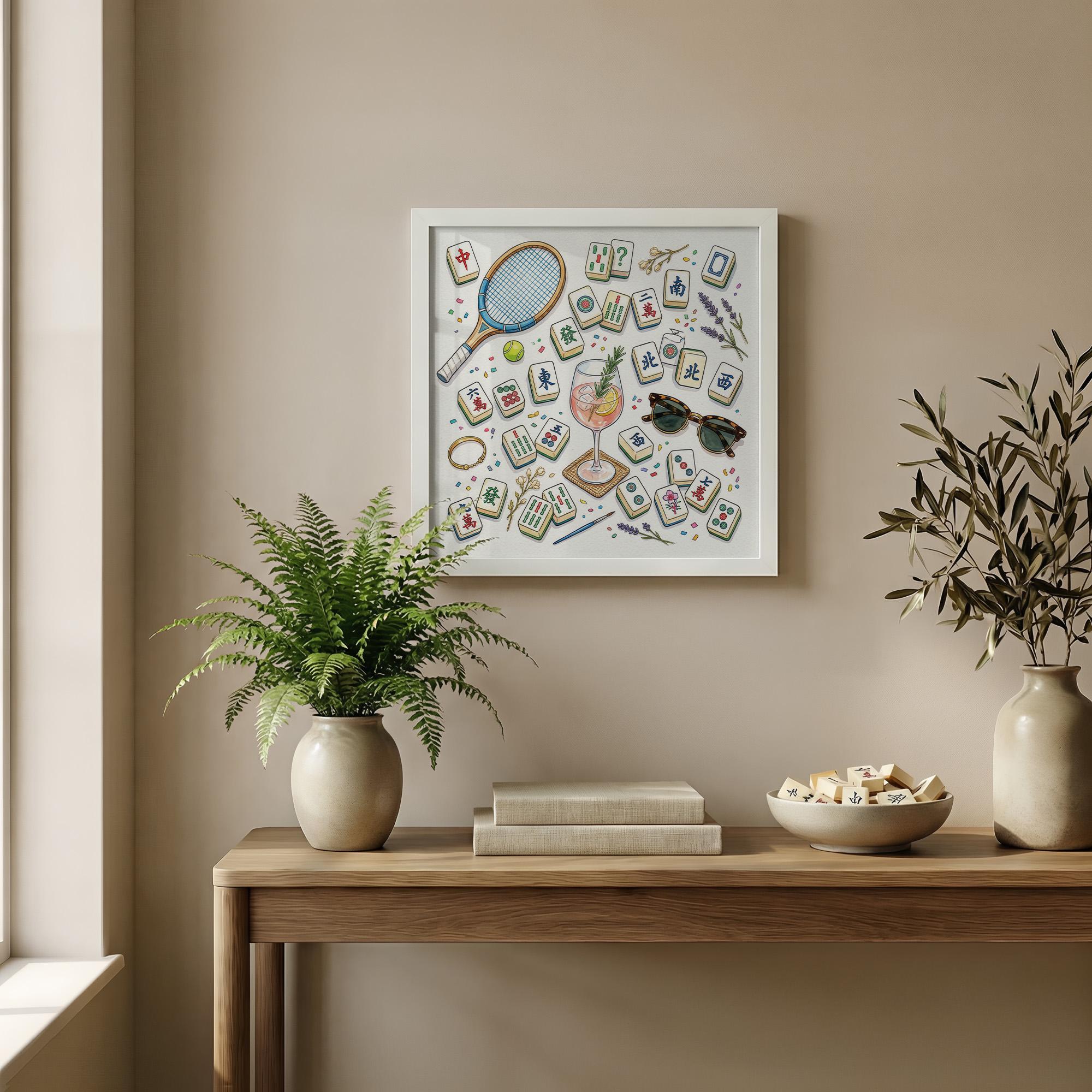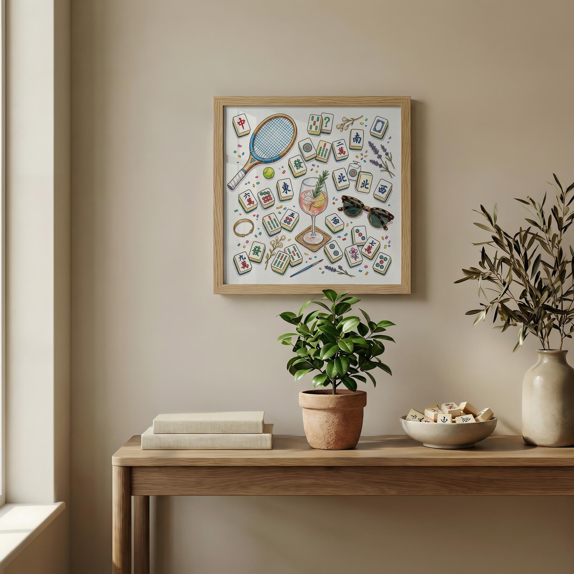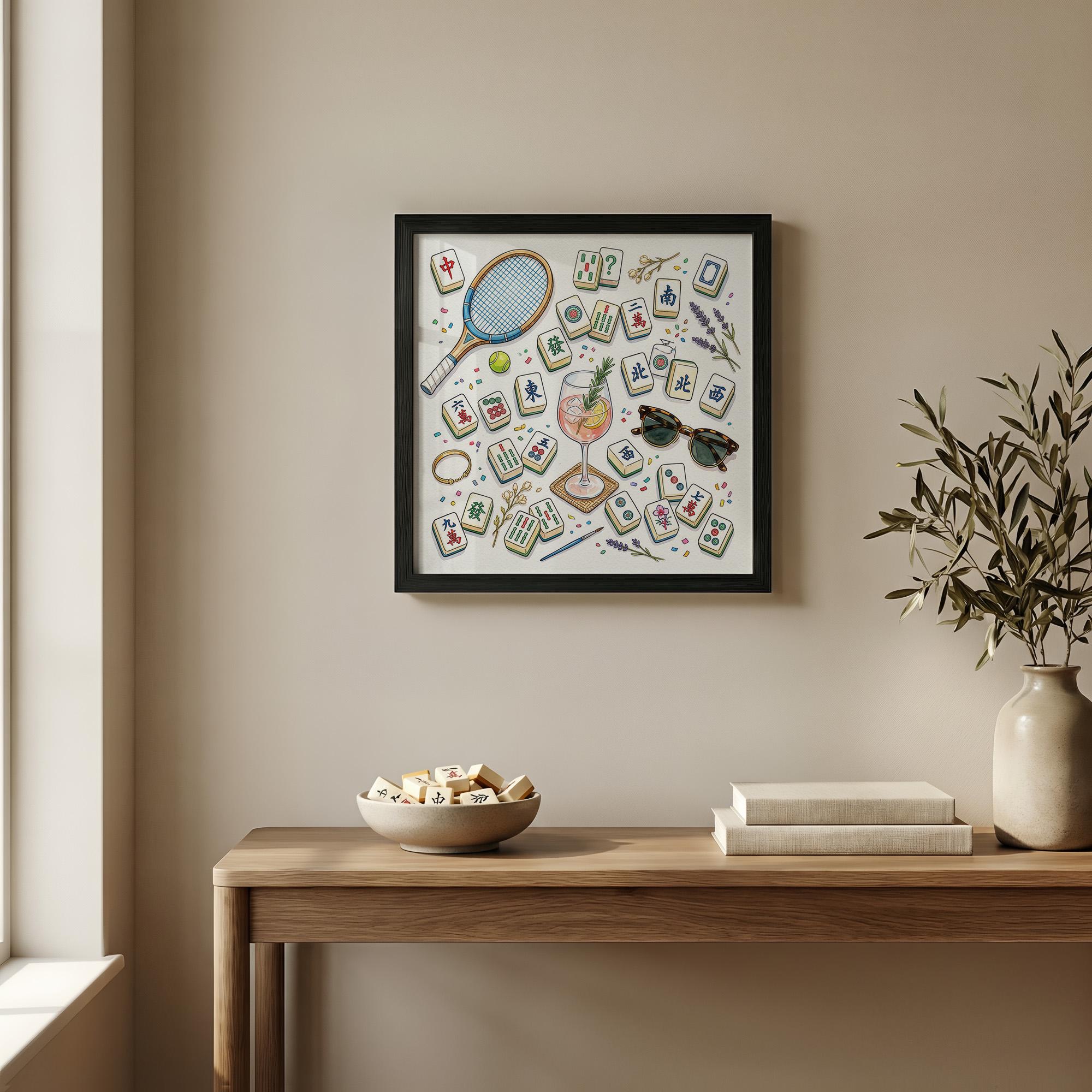Celebrate the vibrant social spirit of Mahjong with this exquisite watercolor art print, where every tile and summer detail comes alive in a beautifully rendered flatlay. Perfect for elevating your game room wall art or gifting to a dedicated player, this piece captures the refined leisure of Asian culture art with a fresh, aesthetic touch. Inspired by moments of connection and play, it blends cocktail poster charm with hobby gift idea appeal for anyone who cherishes stylish tabletop game art.