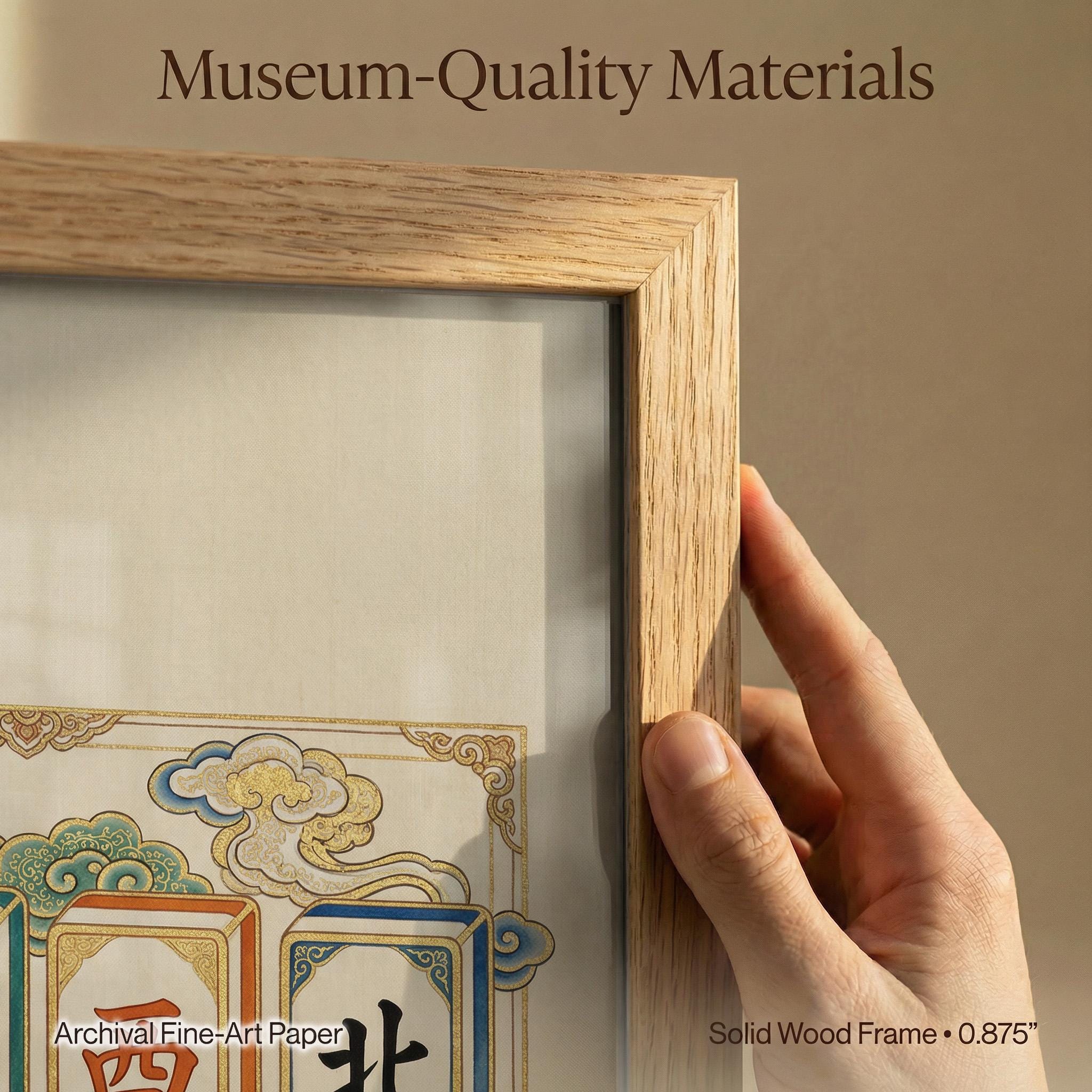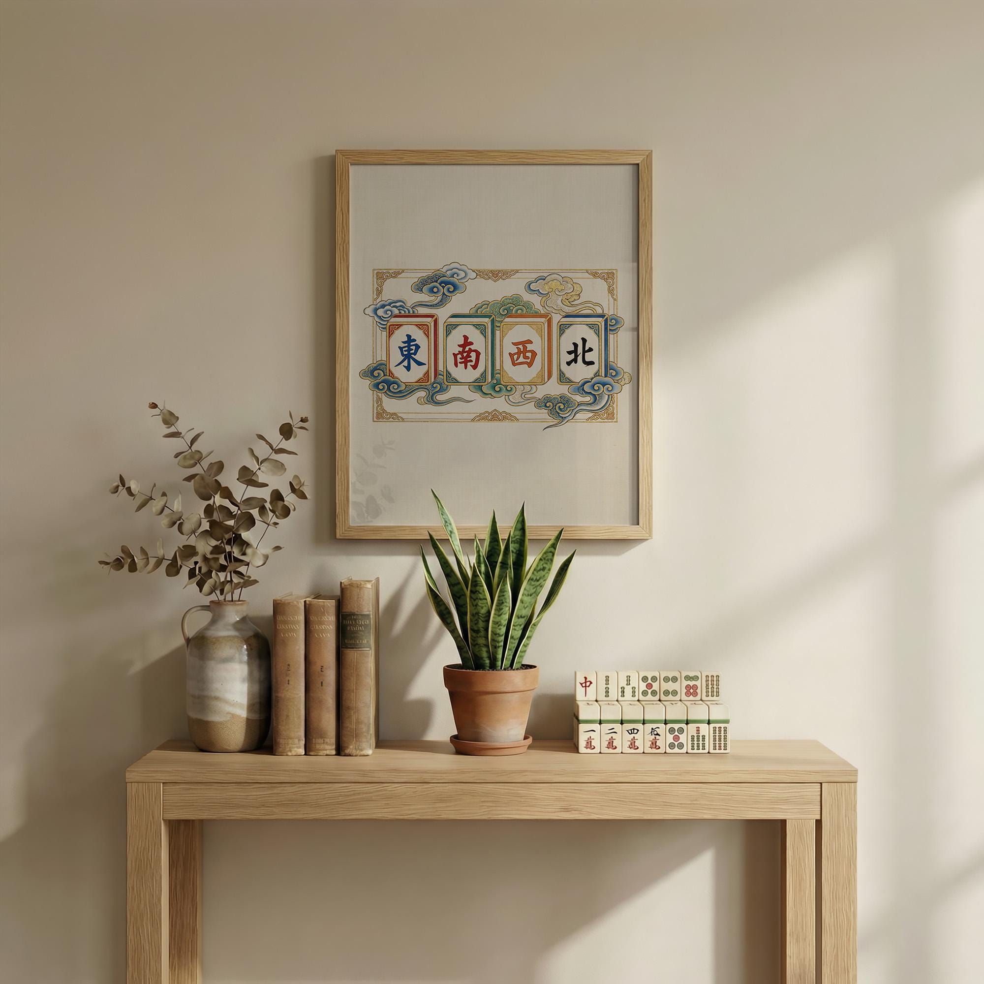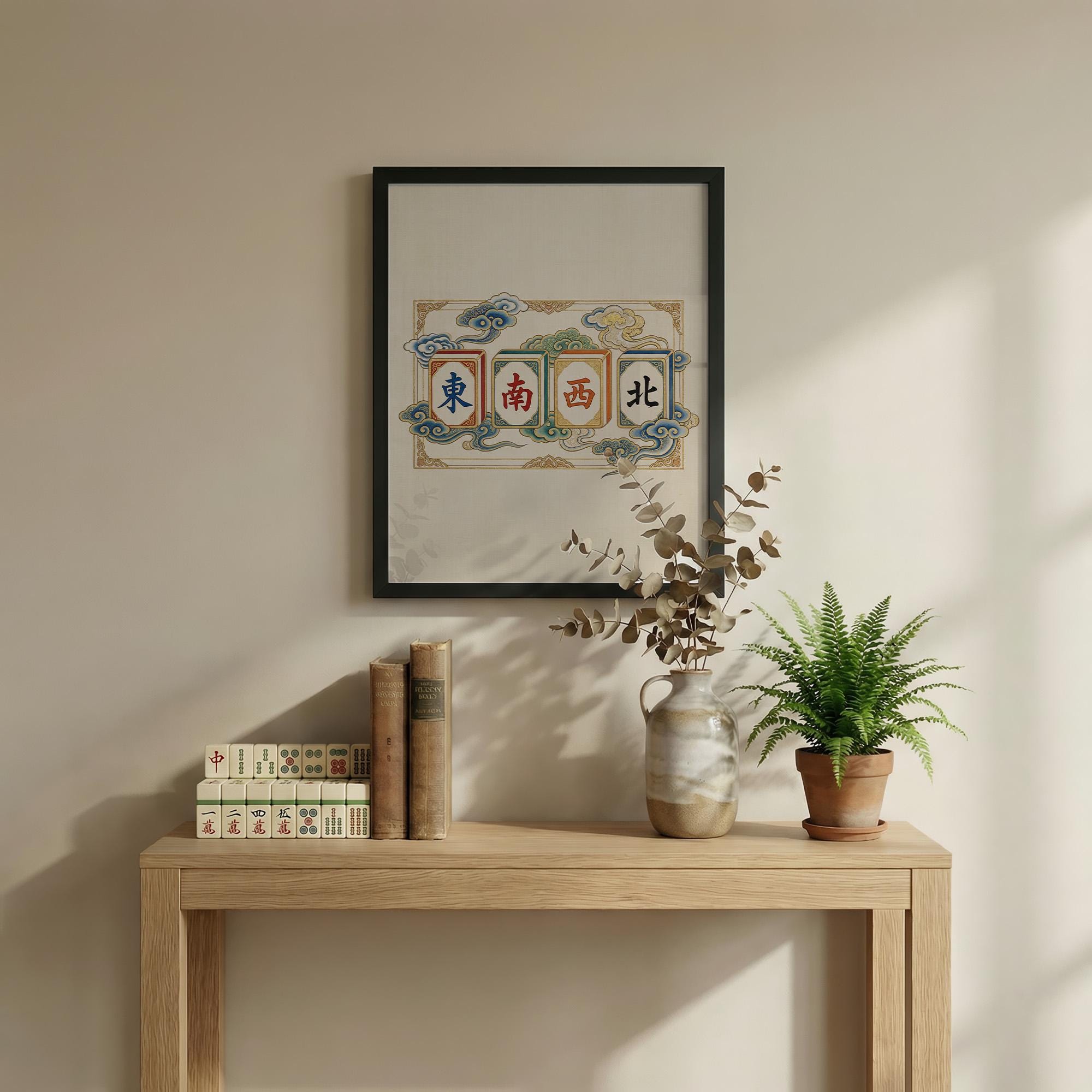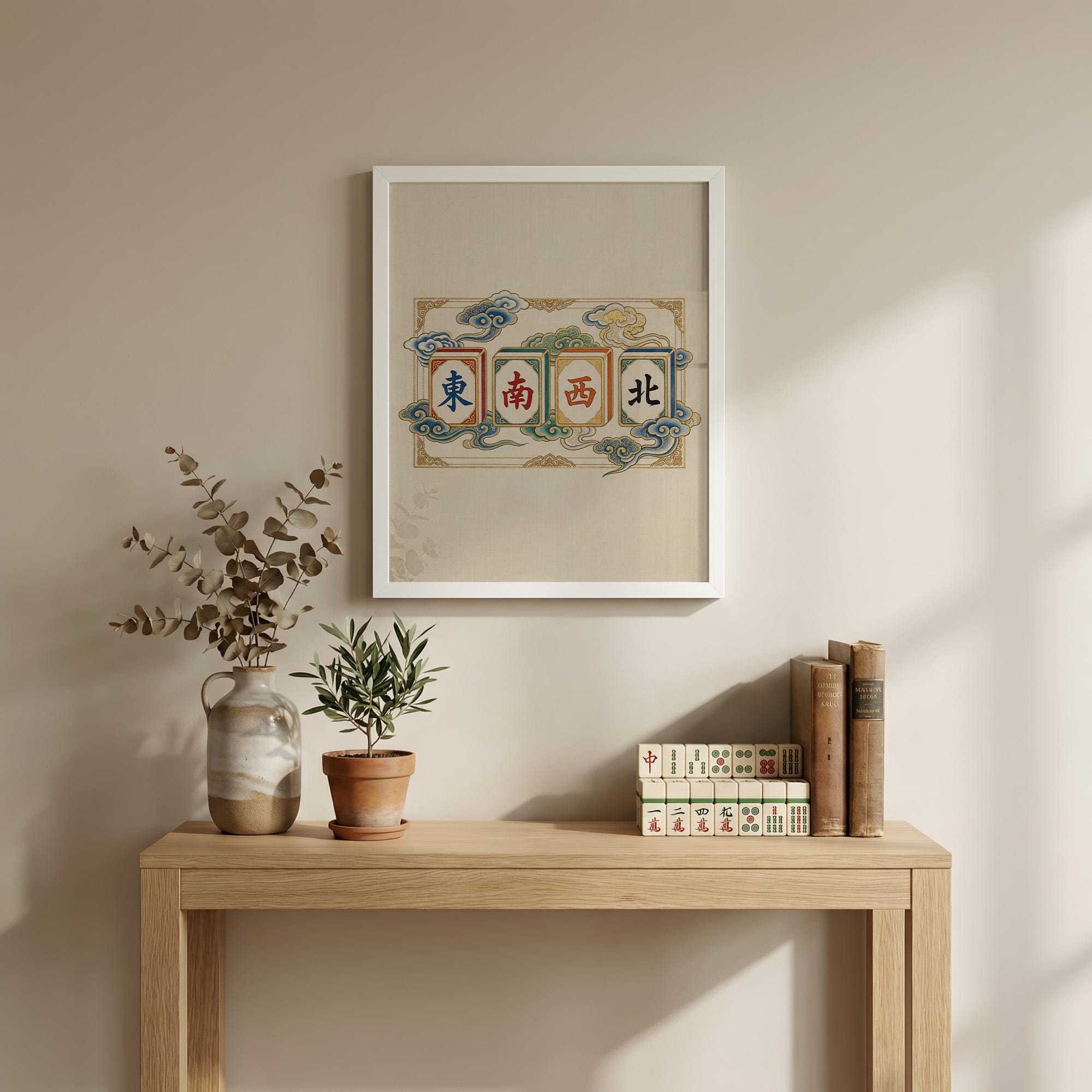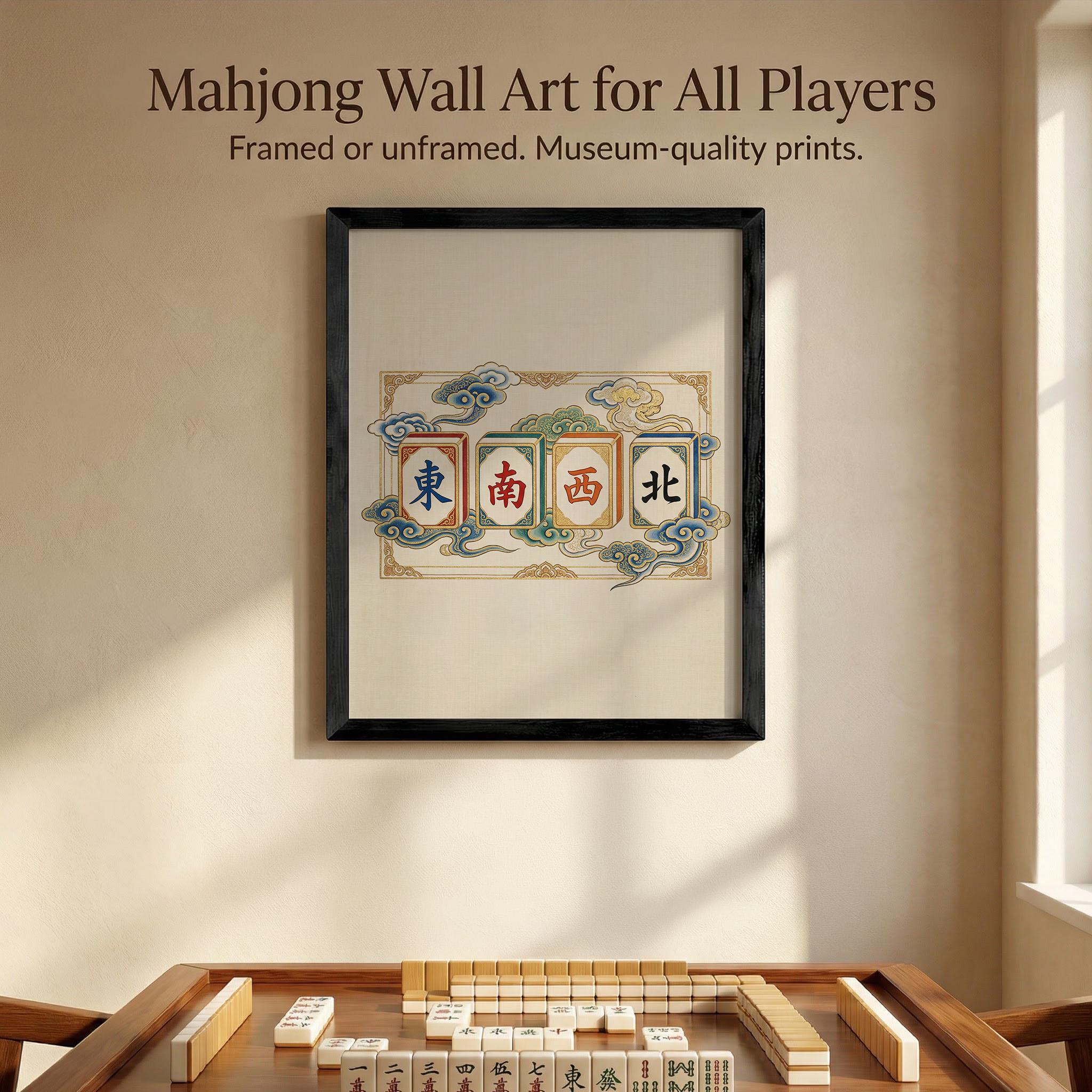 This elegant art print features the four Winds of Mahjong rendered in a traditional Chinese silk painting style with ethereal clouds and gold leaf accents. A sophisticated piece for any game room, this artwork captures the timeless beauty and cultural heritage of the classic game.
