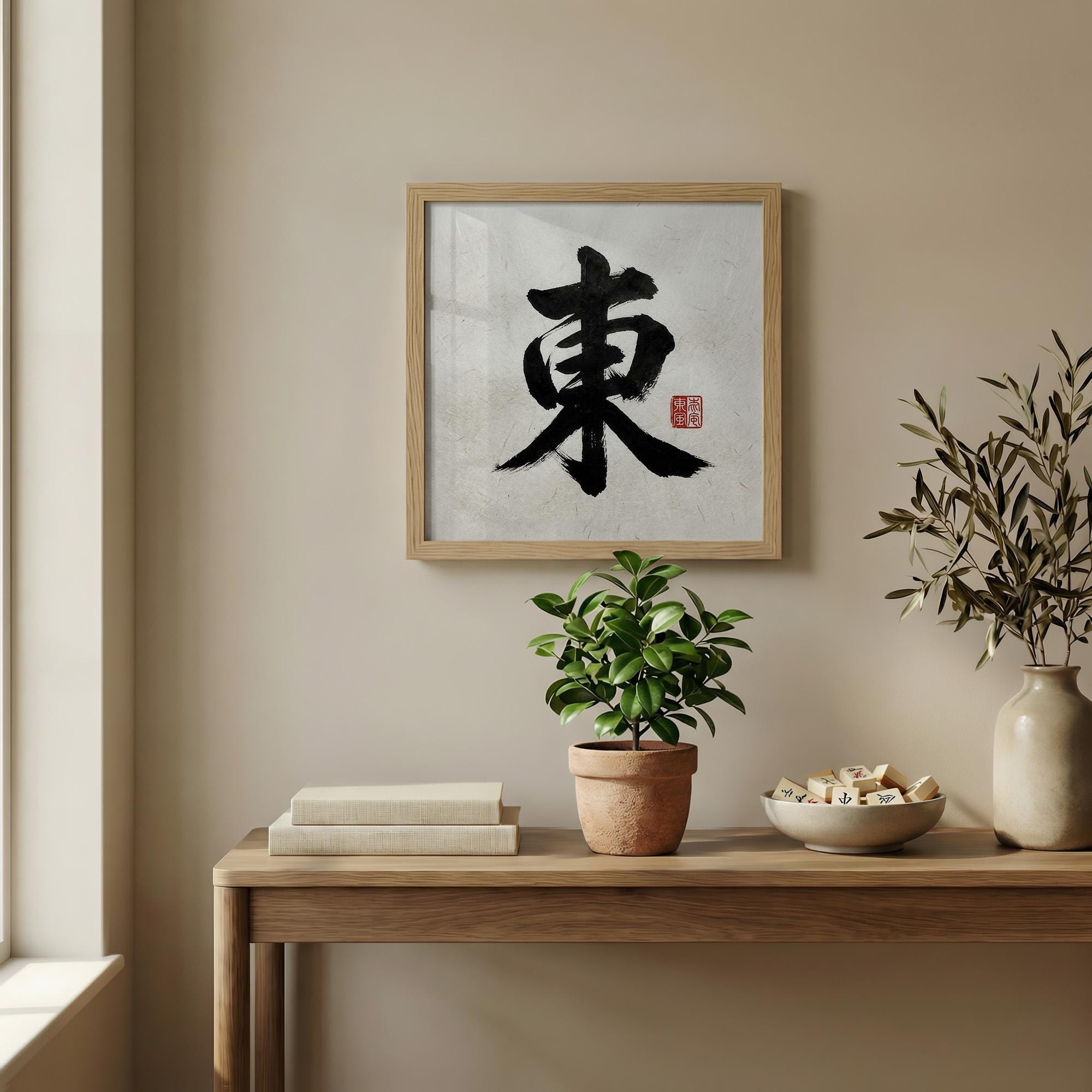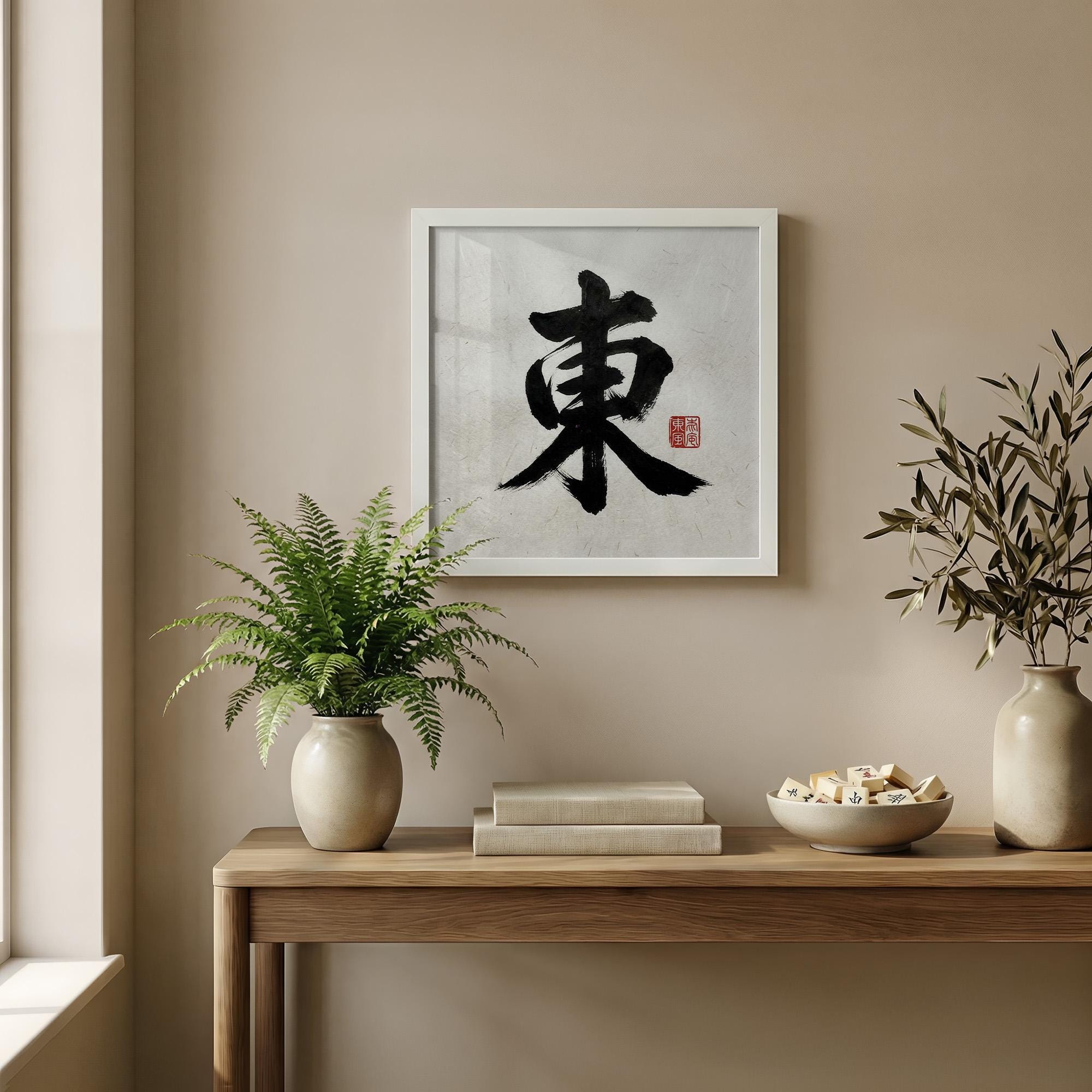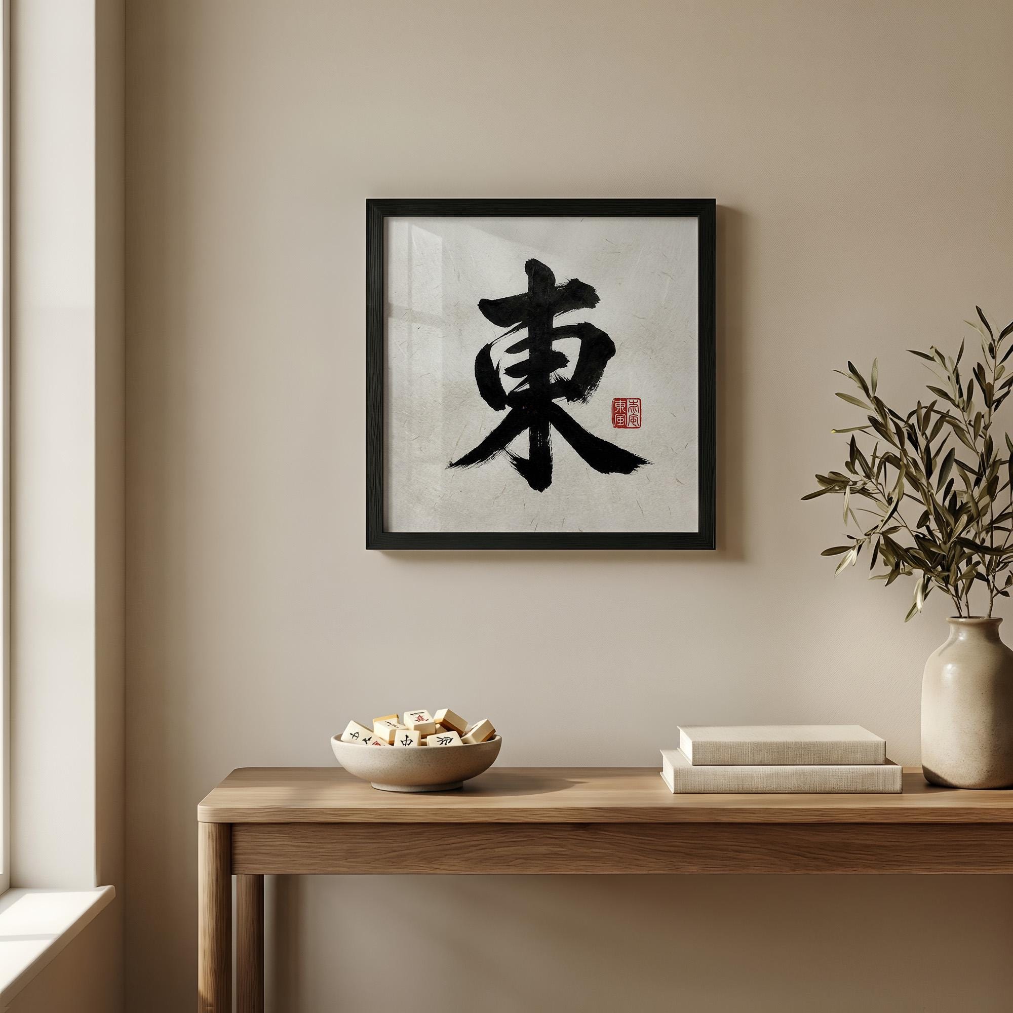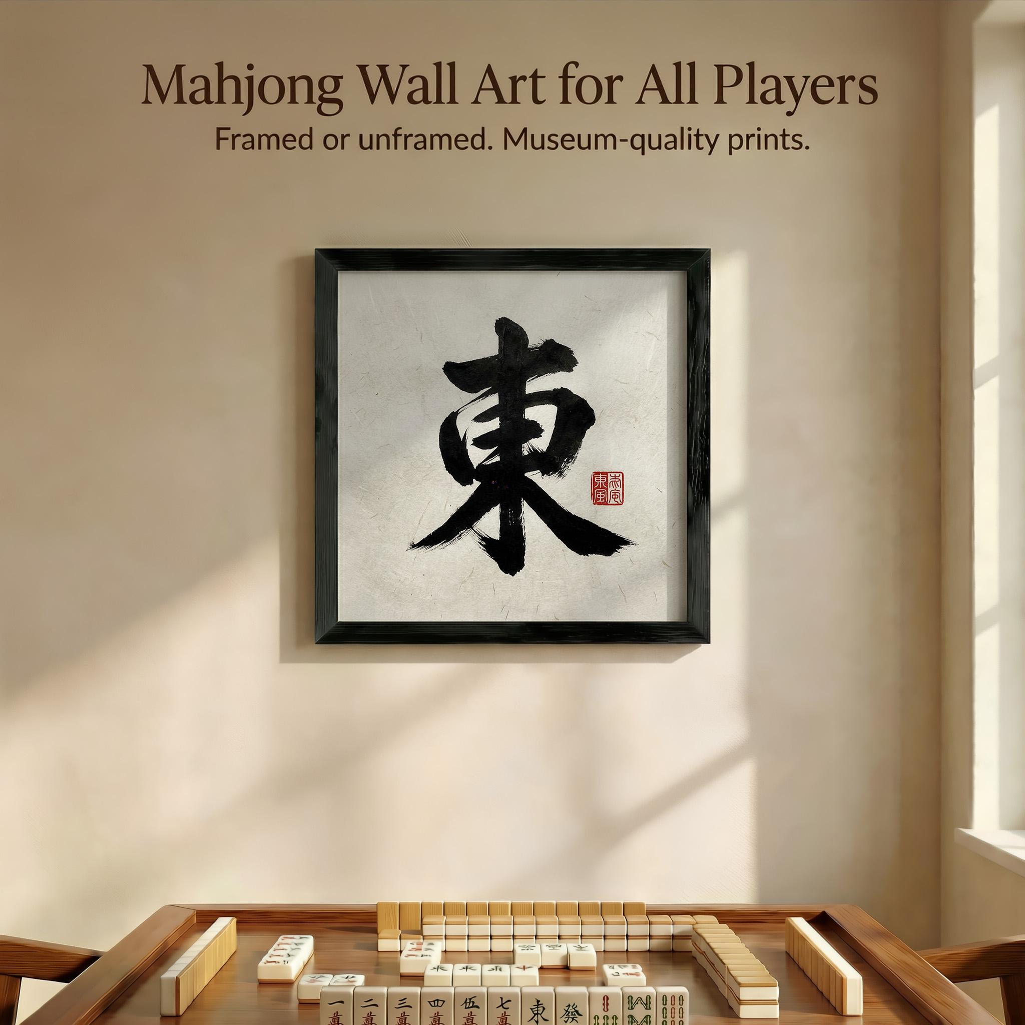 Discover the serene beauty of this East Wind mahjong art print, inspired by traditional sumi-e style art and rendered on authentic textured rice paper. This unique tile art brings a minimalist yet meaningful touch to any game room or zen wall decor, creating a calm and focused atmosphere for players and art lovers alike. Crafted with care, it celebrates the elegance of Chinese characters while fitting perfectly into modern spaces.