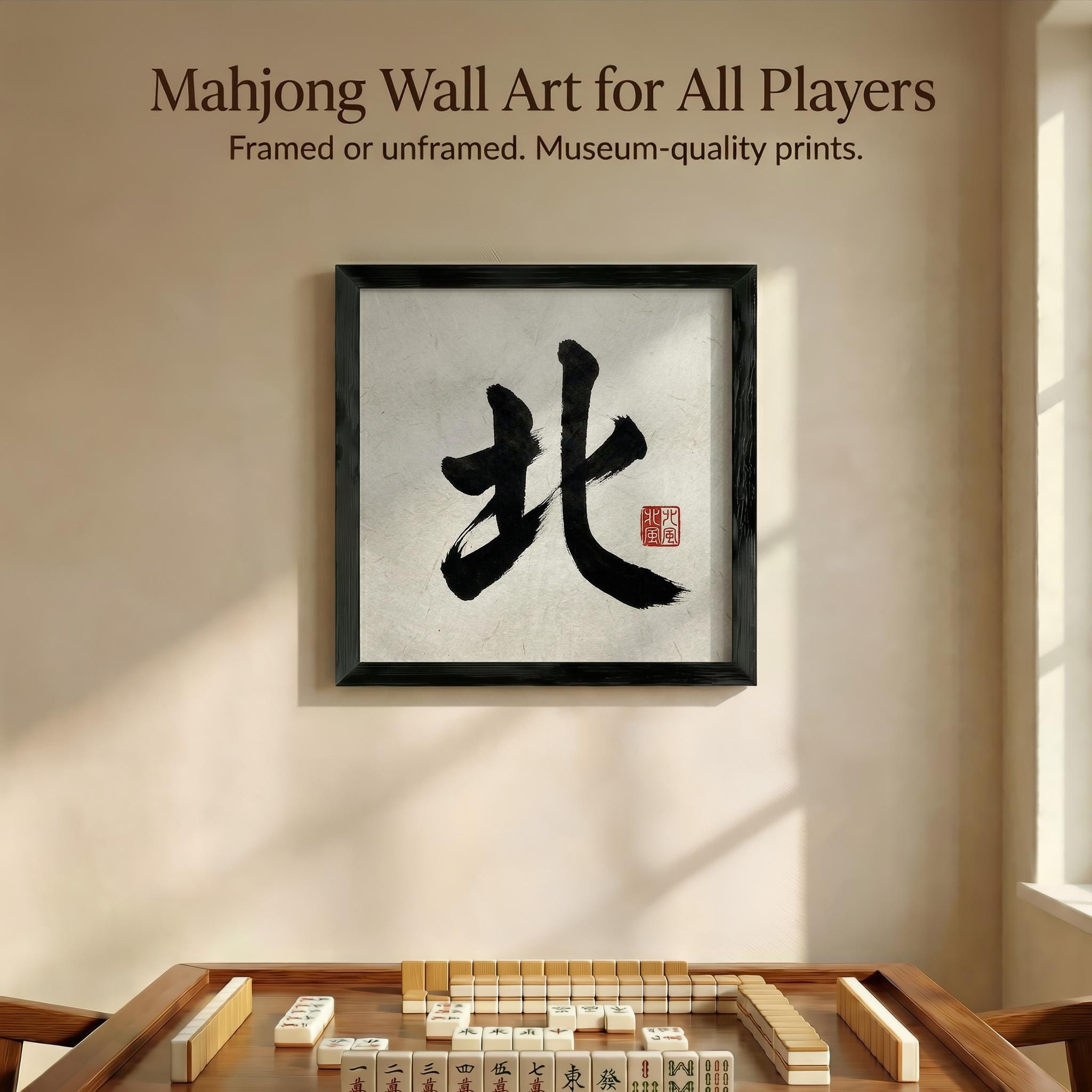 Discover the serene beauty of this East Wind mahjong art print, inspired by traditional sumi-e style art and rendered on authentic textured rice paper. This unique tile art brings a minimalist yet meaningful touch to any game room or zen wall decor, creating a calm and focused atmosphere for players and art lovers alike. Crafted with care, it celebrates the elegance of Chinese characters while fitting perfectly into modern spaces.