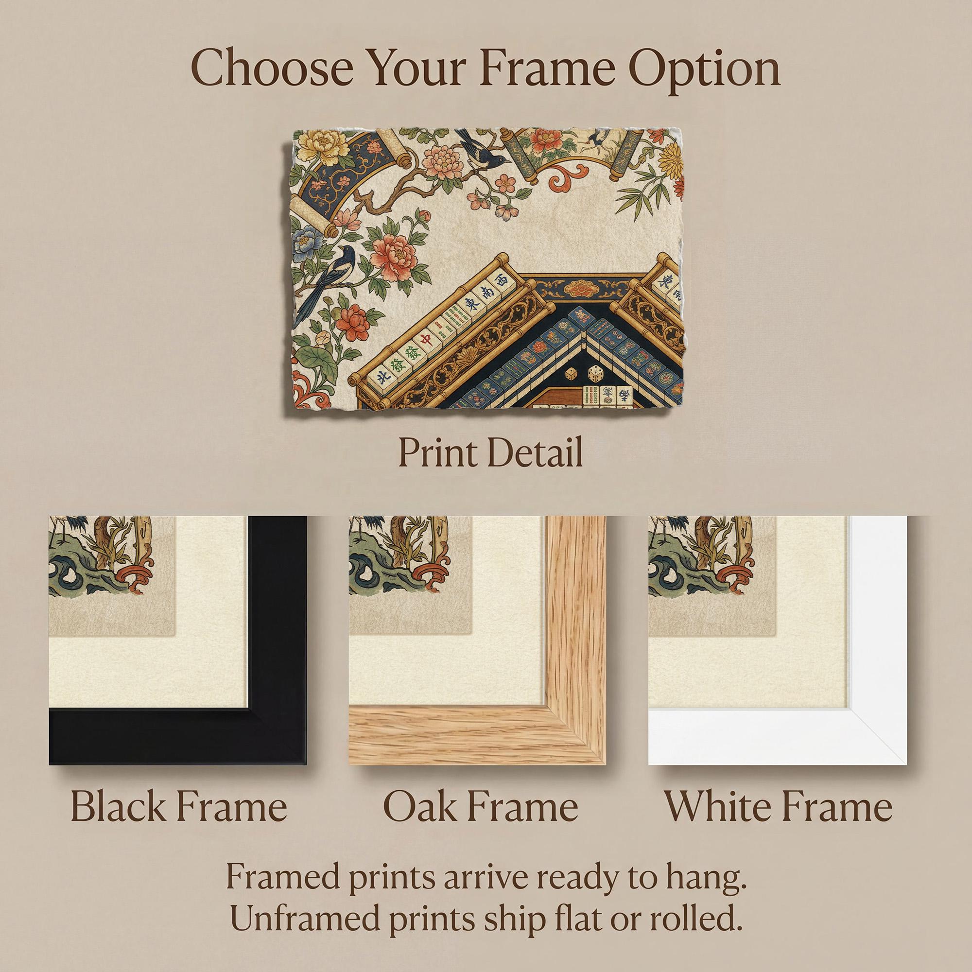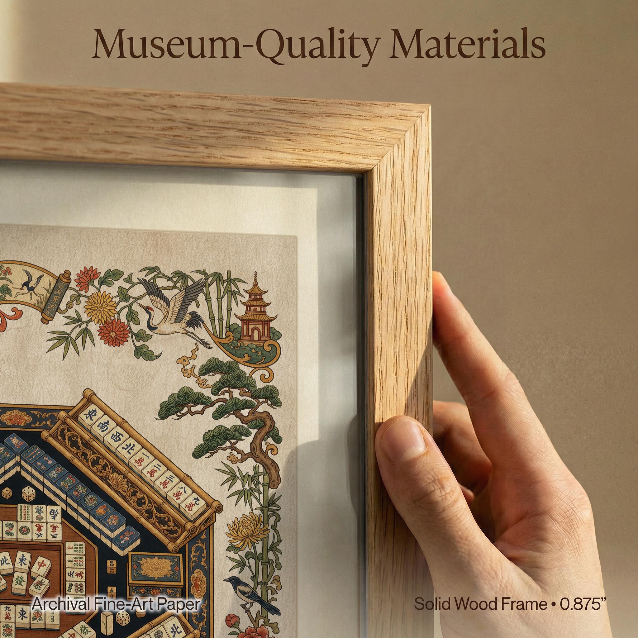 Step into a world where vintage game room charm meets exquisite oriental decor with this Mahjong wall art. Inspired by traditional Asian heritage art, the detailed chinoiserie print beautifully captures cranes and pagodas encircling a classic Mahjong table, creating a luxurious game art centerpiece. Perfect for Mahjong player gifts or elevating any sophisticated living space, this archival quality art blends timeless elegance with cultural richness.