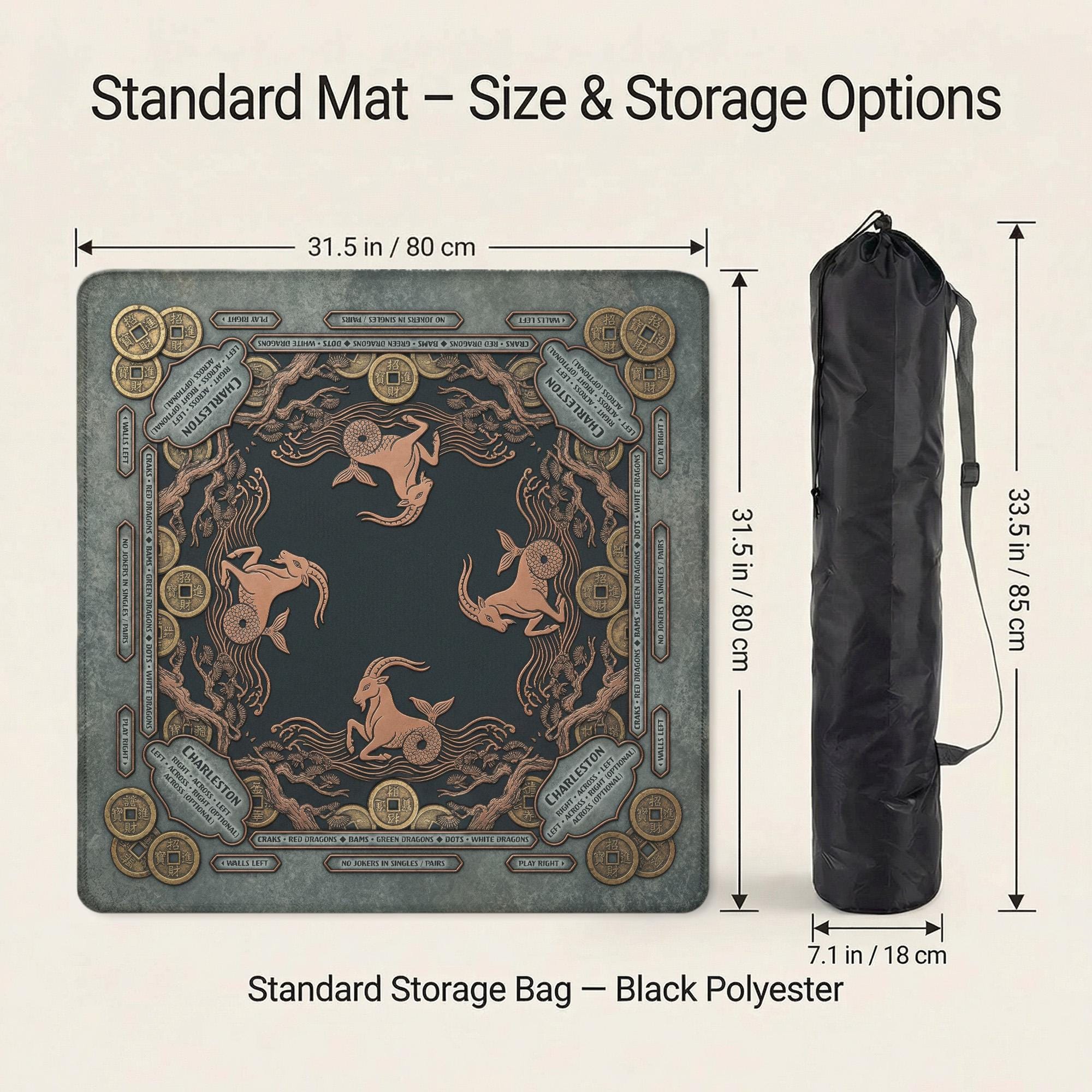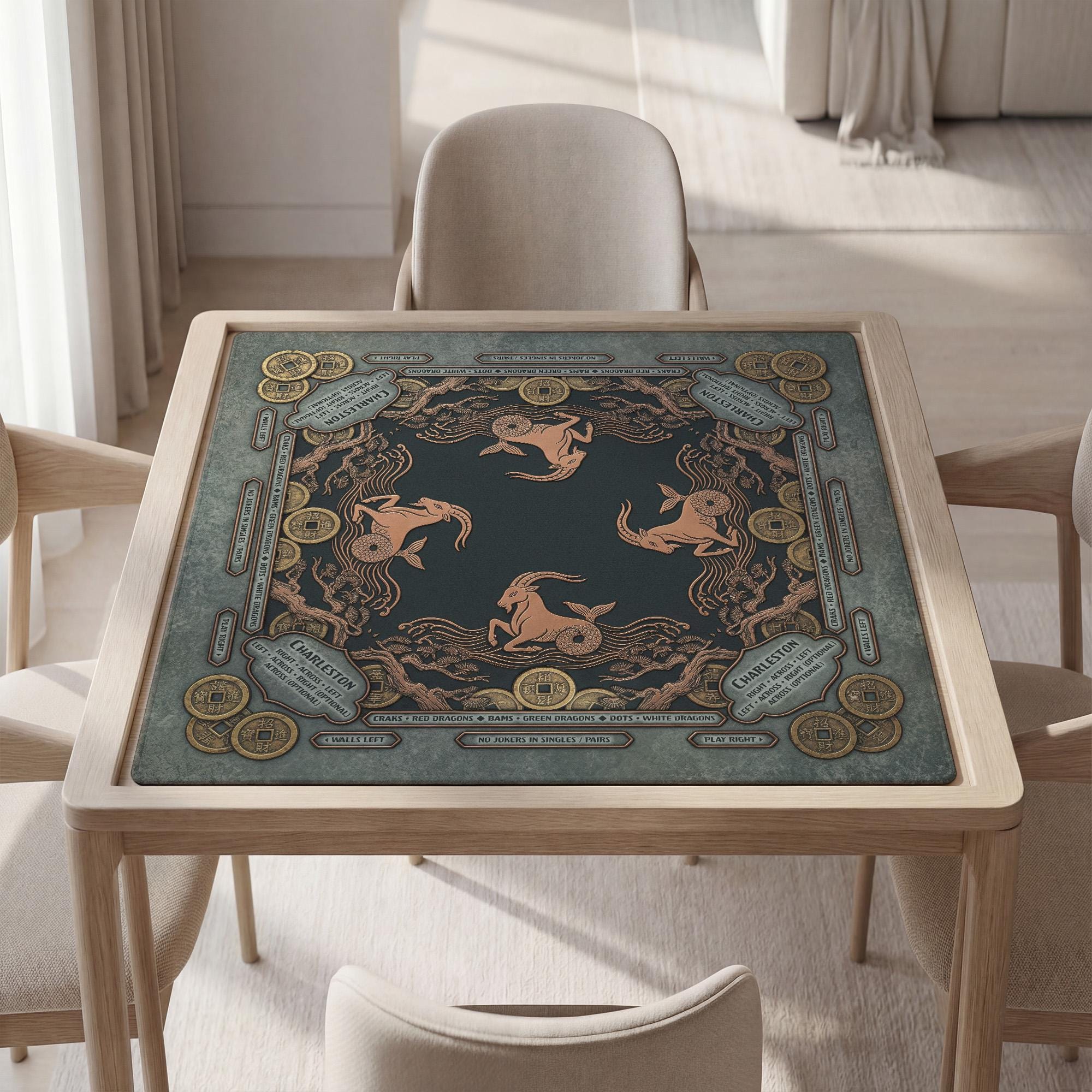 This premium Mahjong mat features an intricate Capricorn sea-goat design adorned with vintage coins and celestial waves in a sophisticated antique gold and teal palette. Fully customizable with your name or initials, this noise-reducing waterproof mat features a non-slip rubber backing to ensure a smooth, focused, and elegant gaming experience.